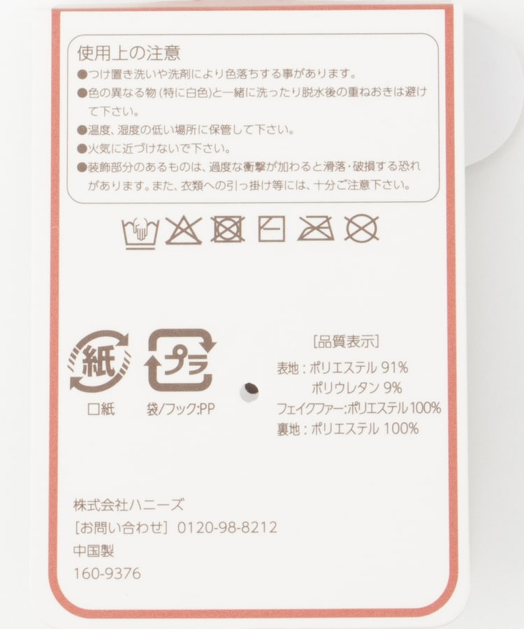 ●品質/表地 ポリエステル 91%・ポリウレタン 9%・フェイクファー ポリエステル 100%・裏地 ポリエステル 100%