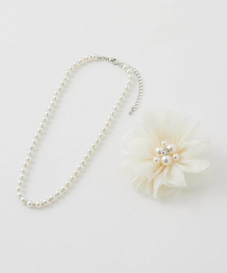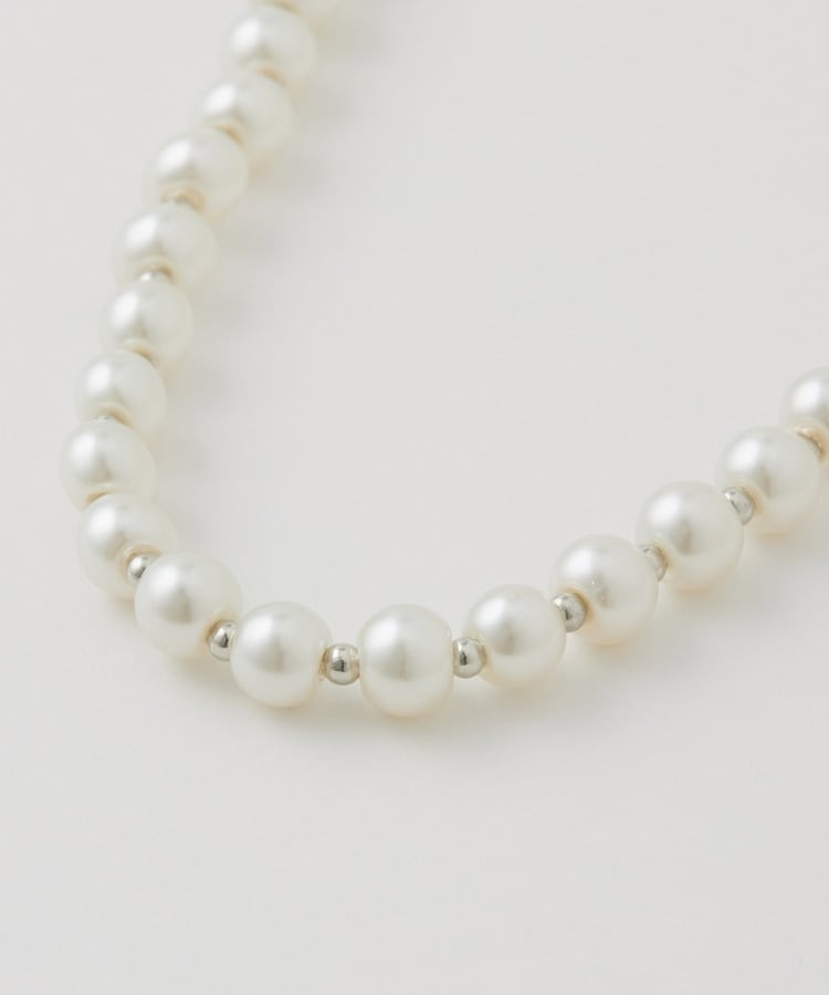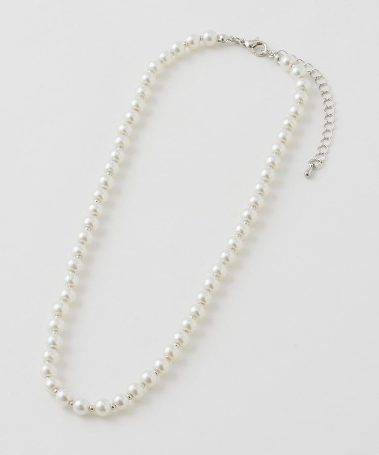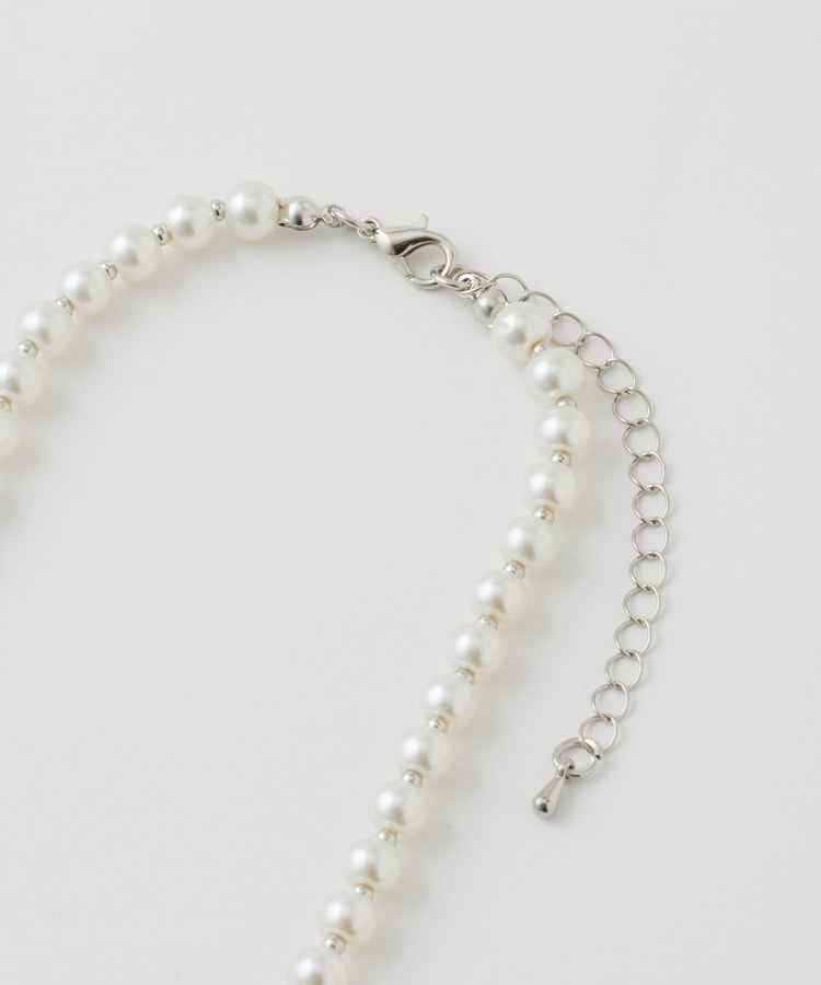 ネックレスはフェイクパールが連なったシンプルなデザイン。