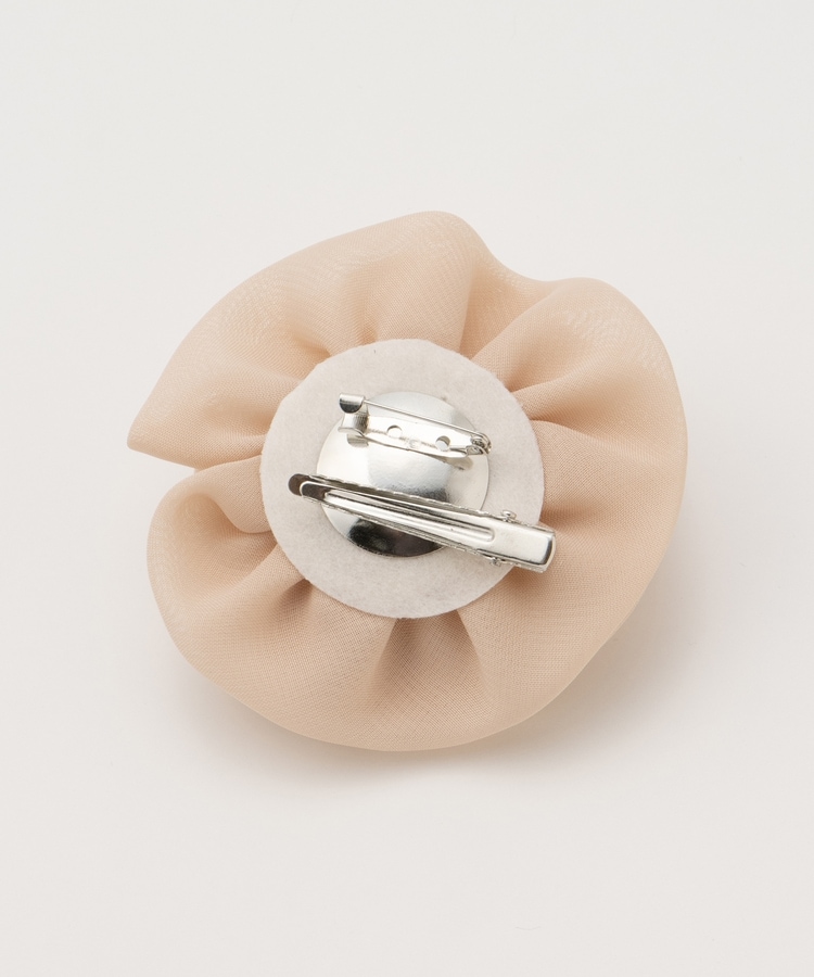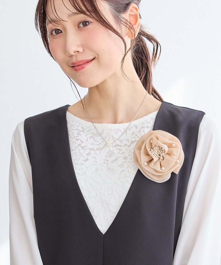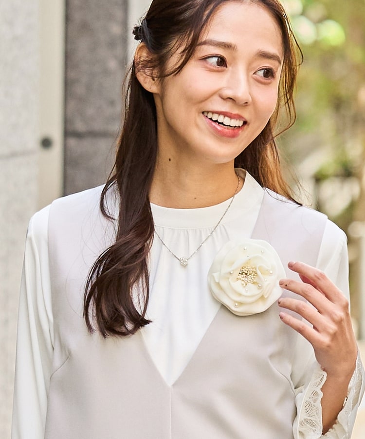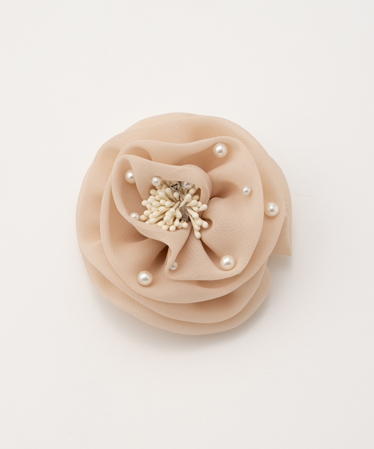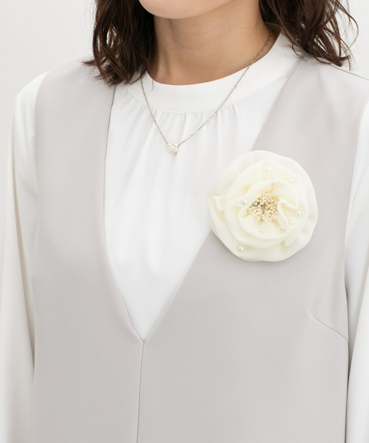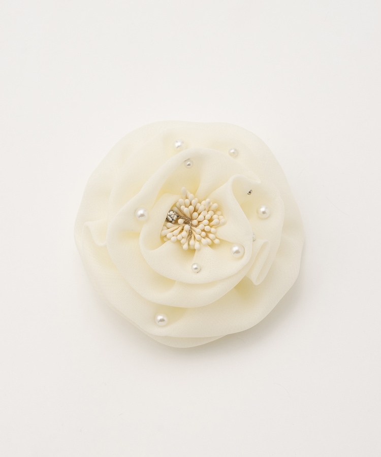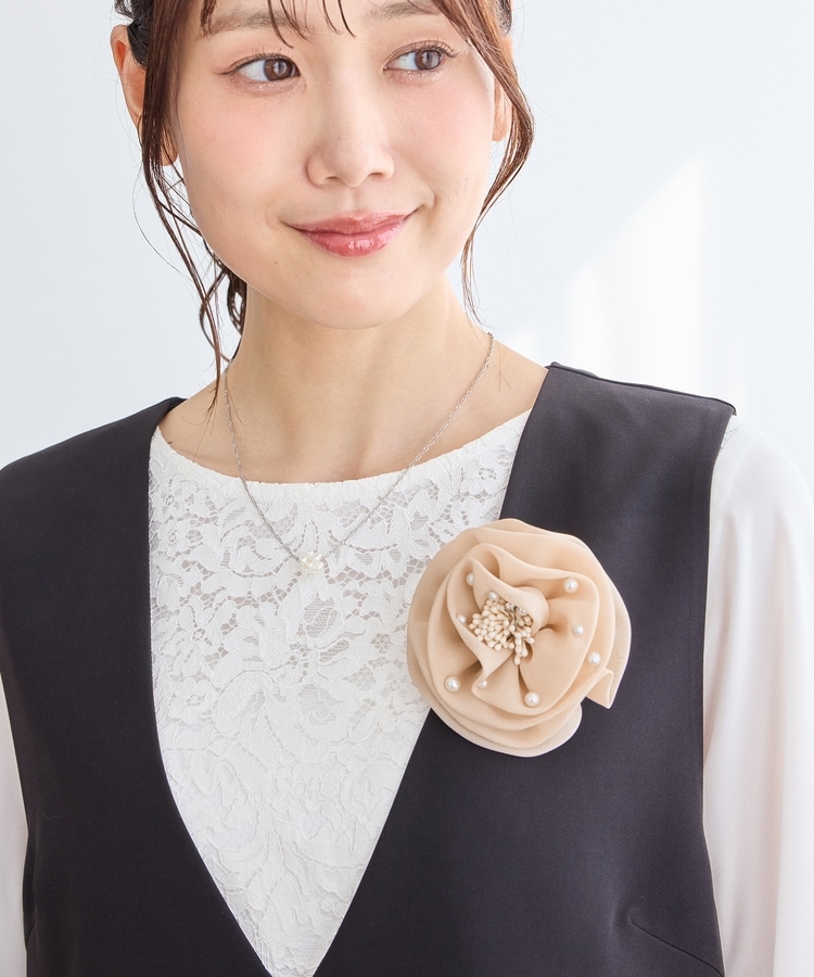 ふんわりとしたお花にフェイクパールを添えた、女性らしさ溢れるコサージュ。