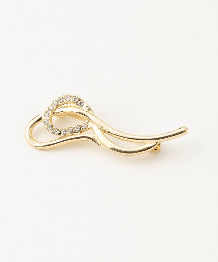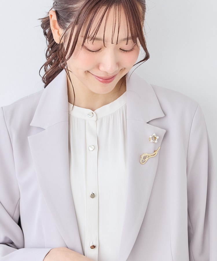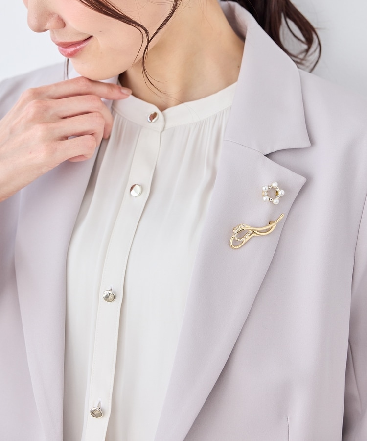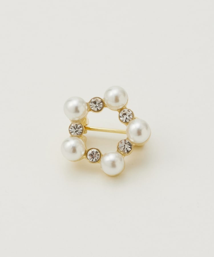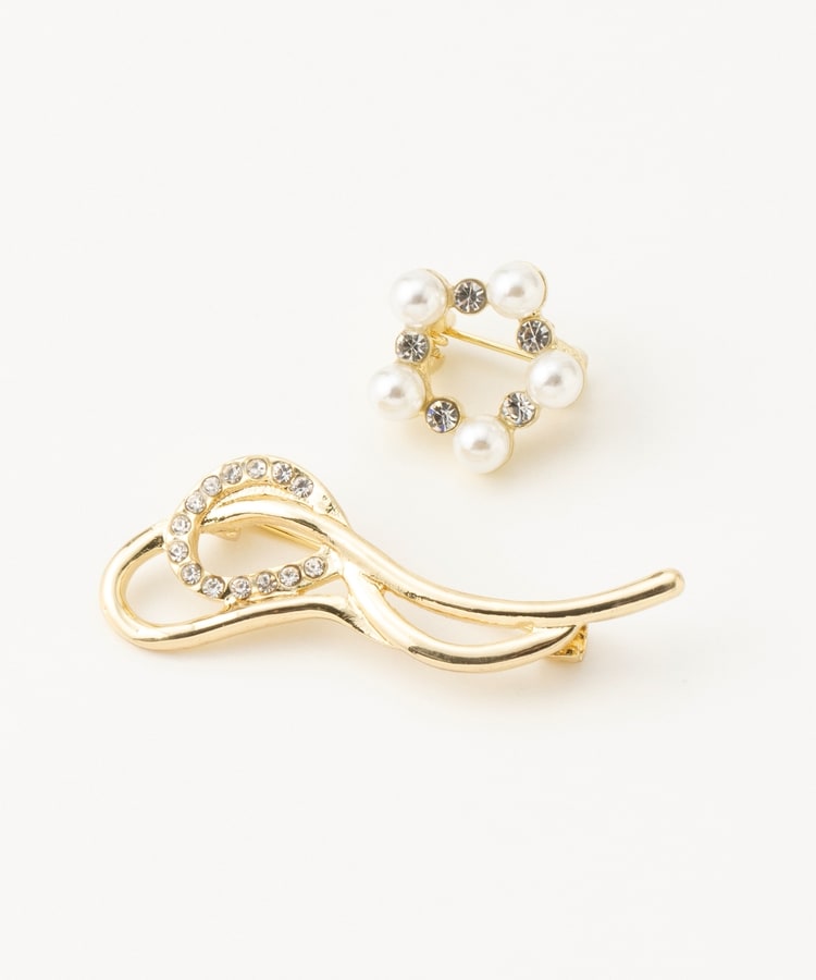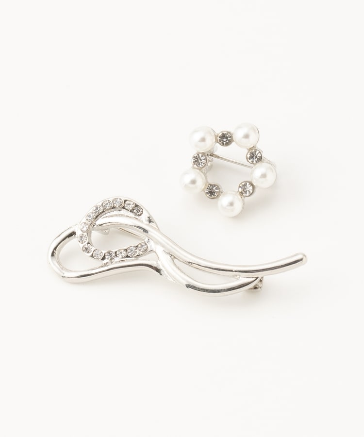 フェイクパールとビジューの丸型ブローチと、カーブラインにビジューを添えたブローチの2点セット。