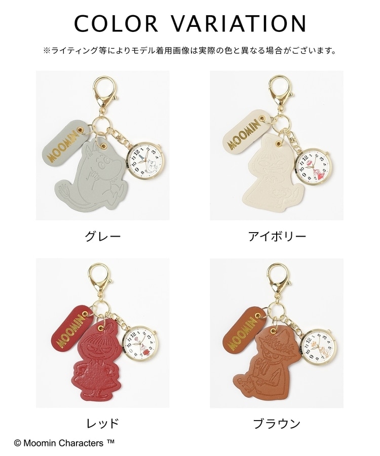 ムーミンと仲間たちの型押しチャームがおしゃれなデザイン。