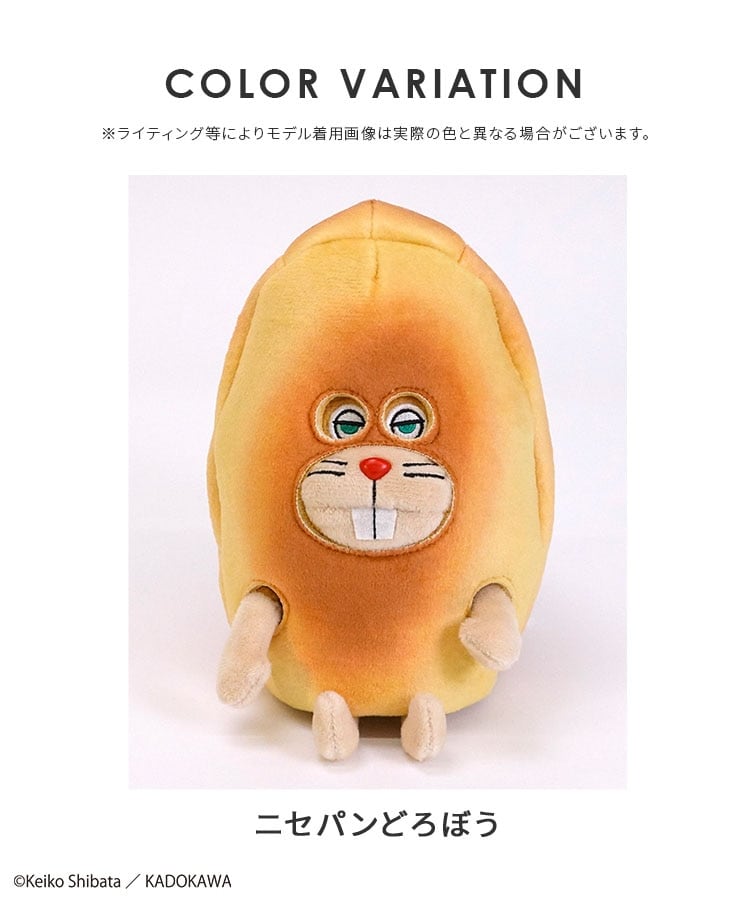 パンをかぶったにせパンどろぼうがとってもキュート!パンを脱がしたり着せたりできる楽しいぬいぐるみです。