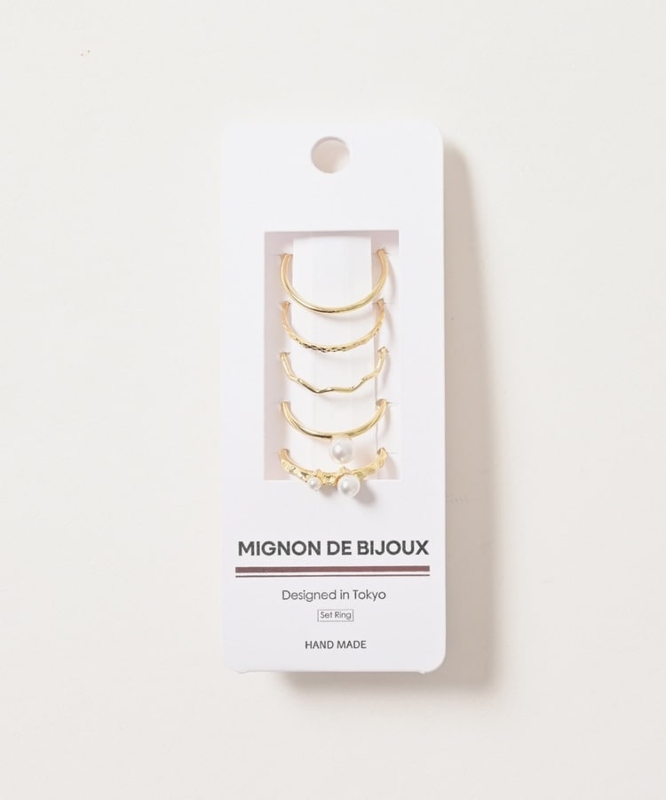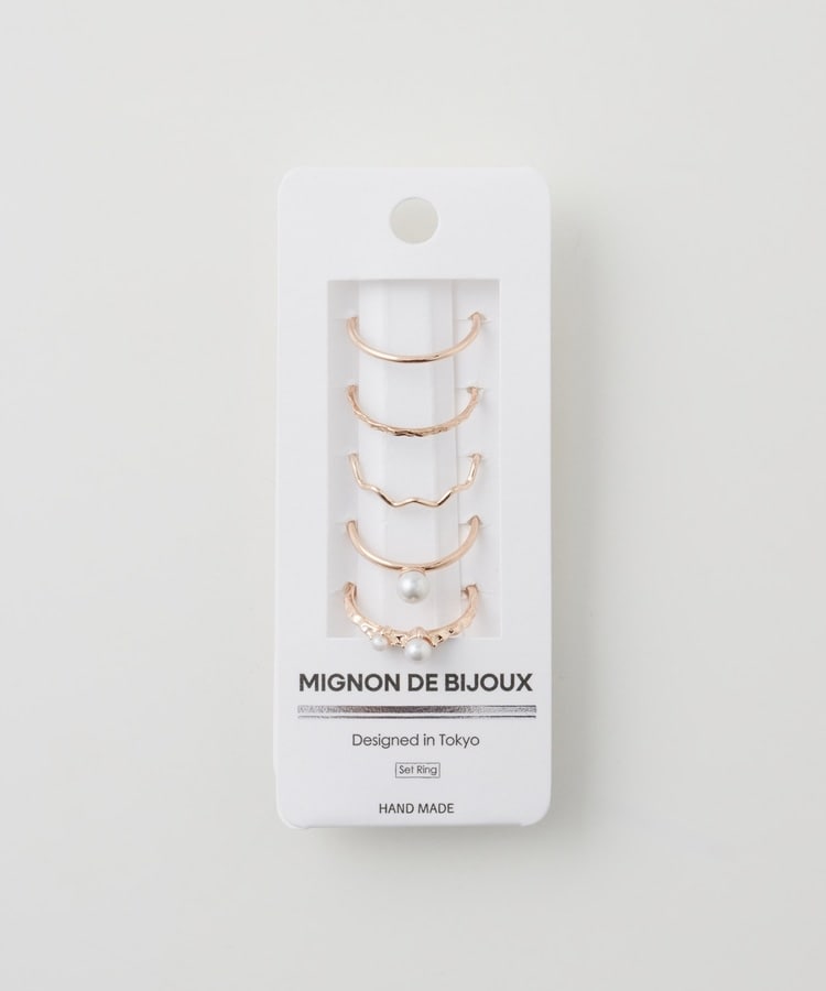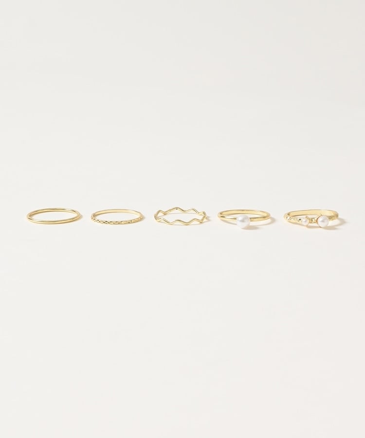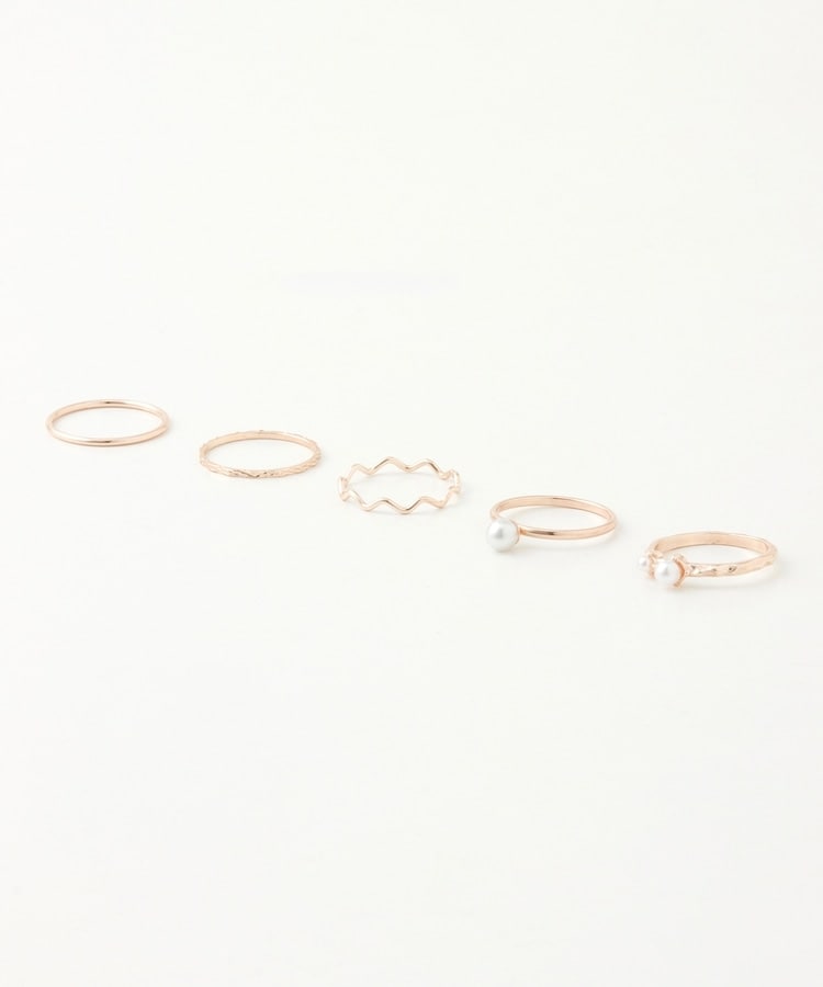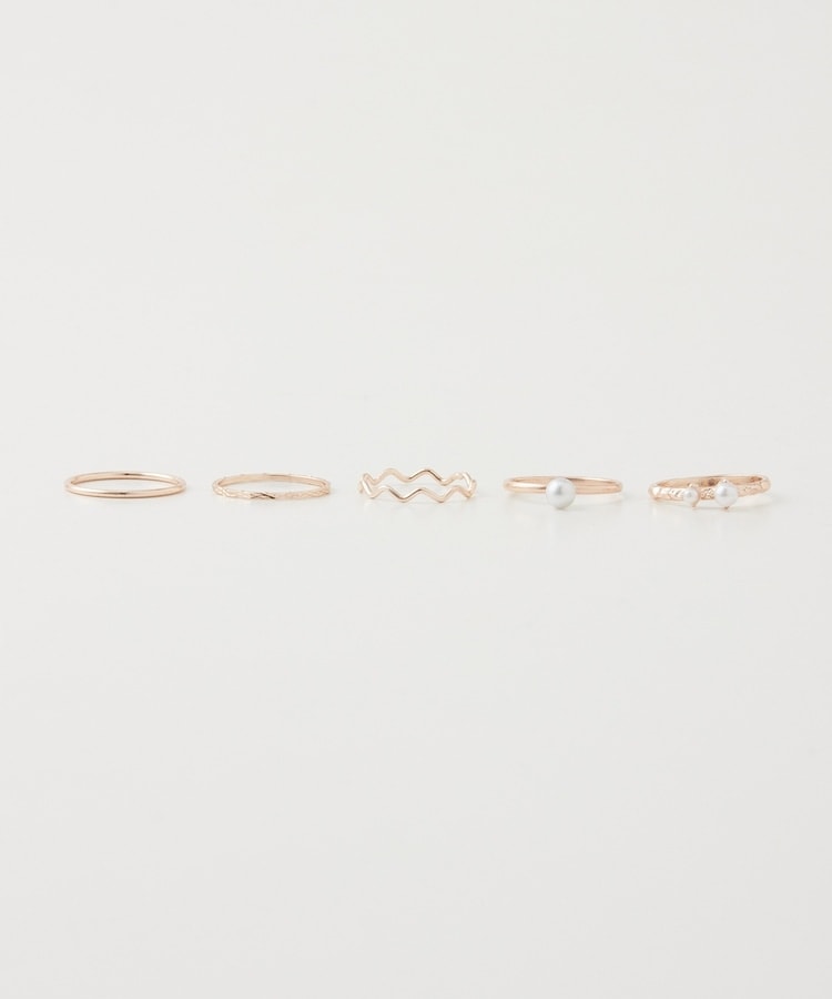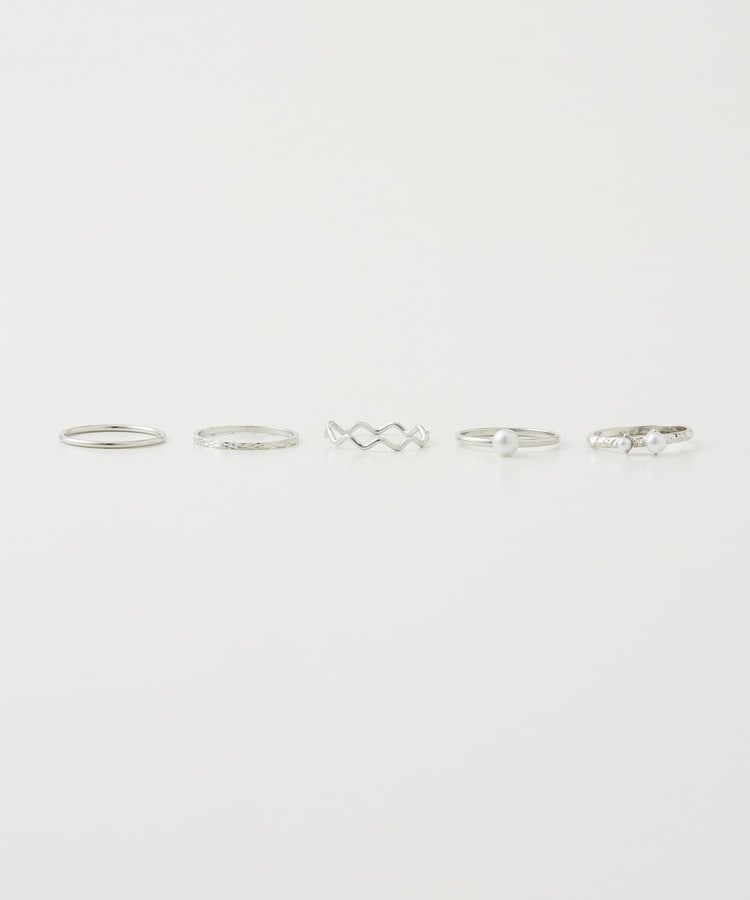 パール付きやウェーブ、チェーン風など、デザインが異なる細めリング5種類のお得なセット。