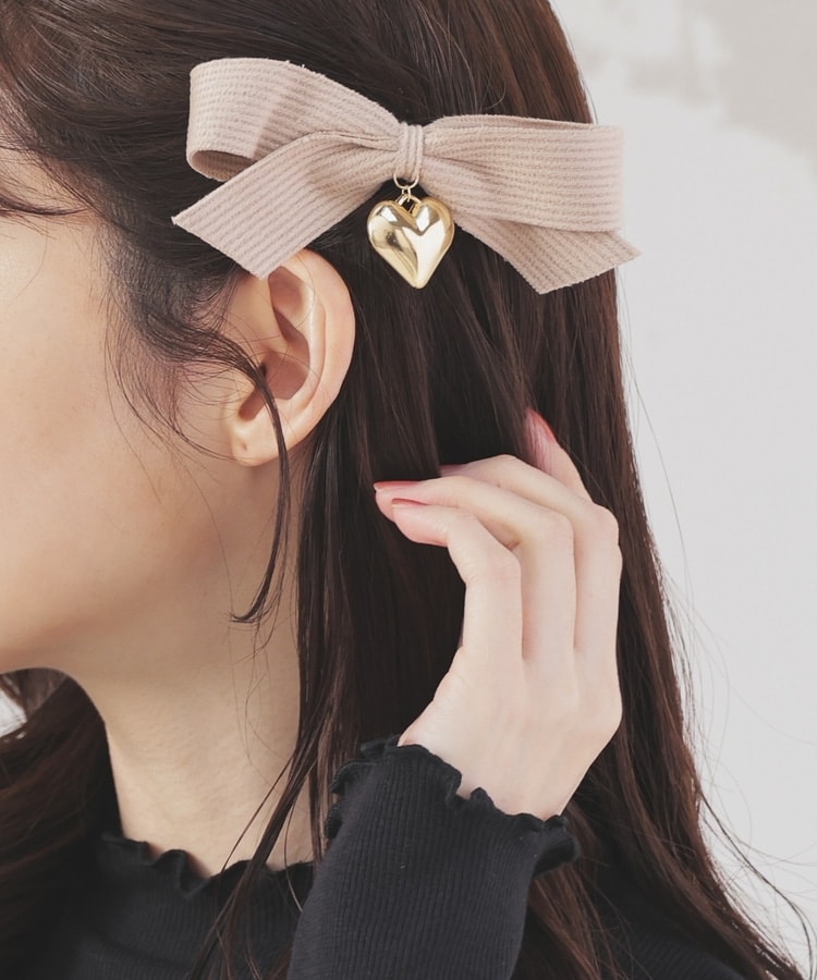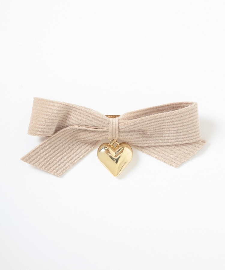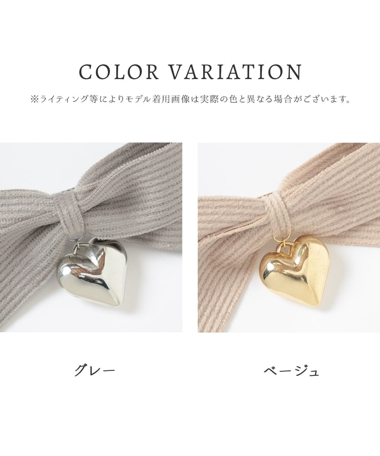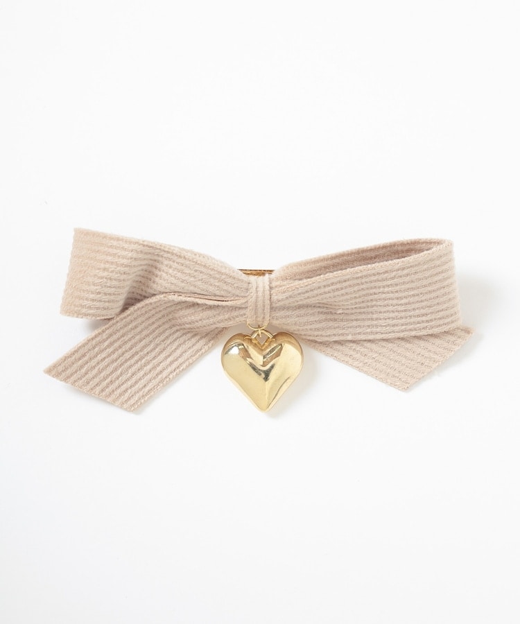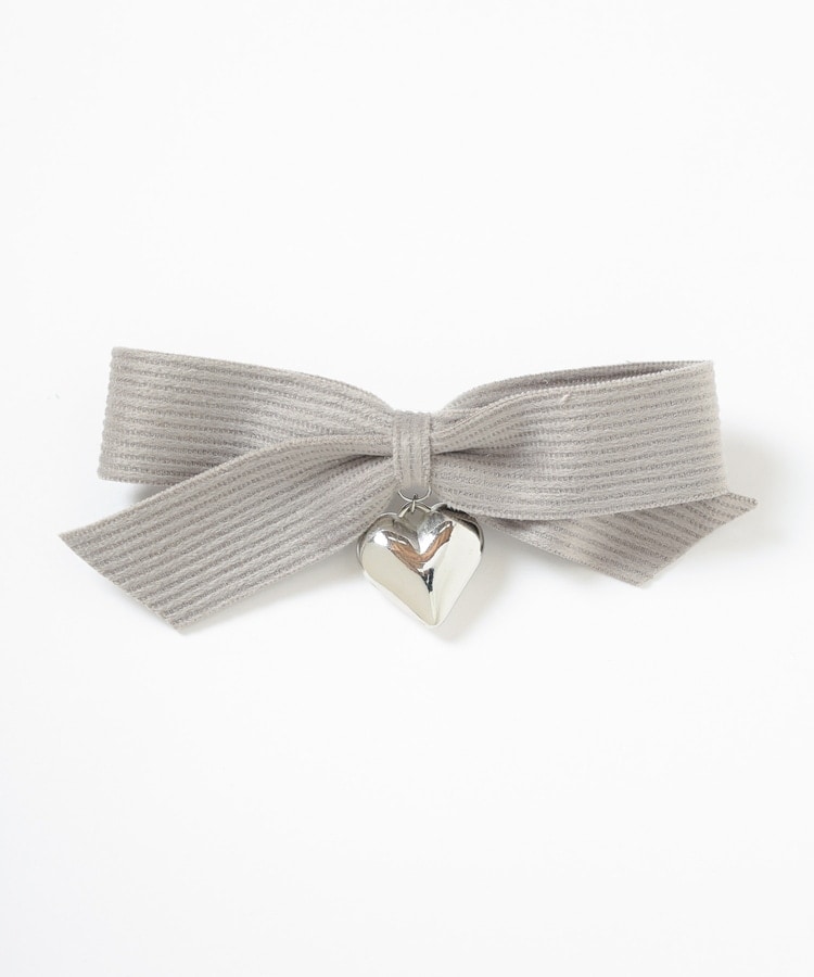 シックなカラーのコーデュロイリボンにメタルカラーのハートモチーフを添えた大人可愛いデザイン。