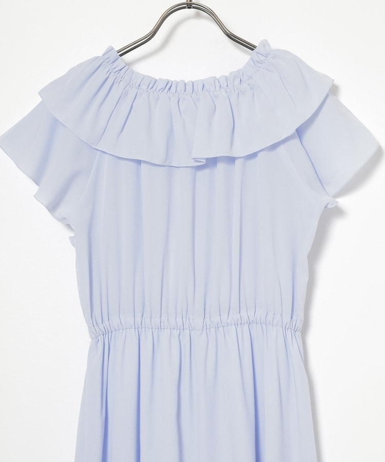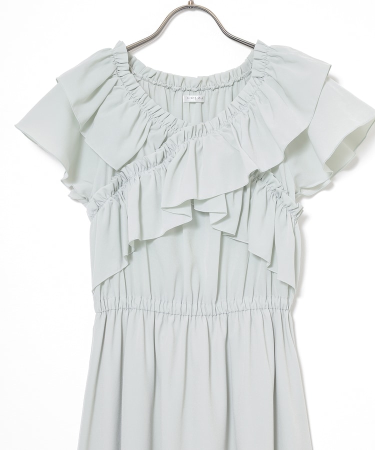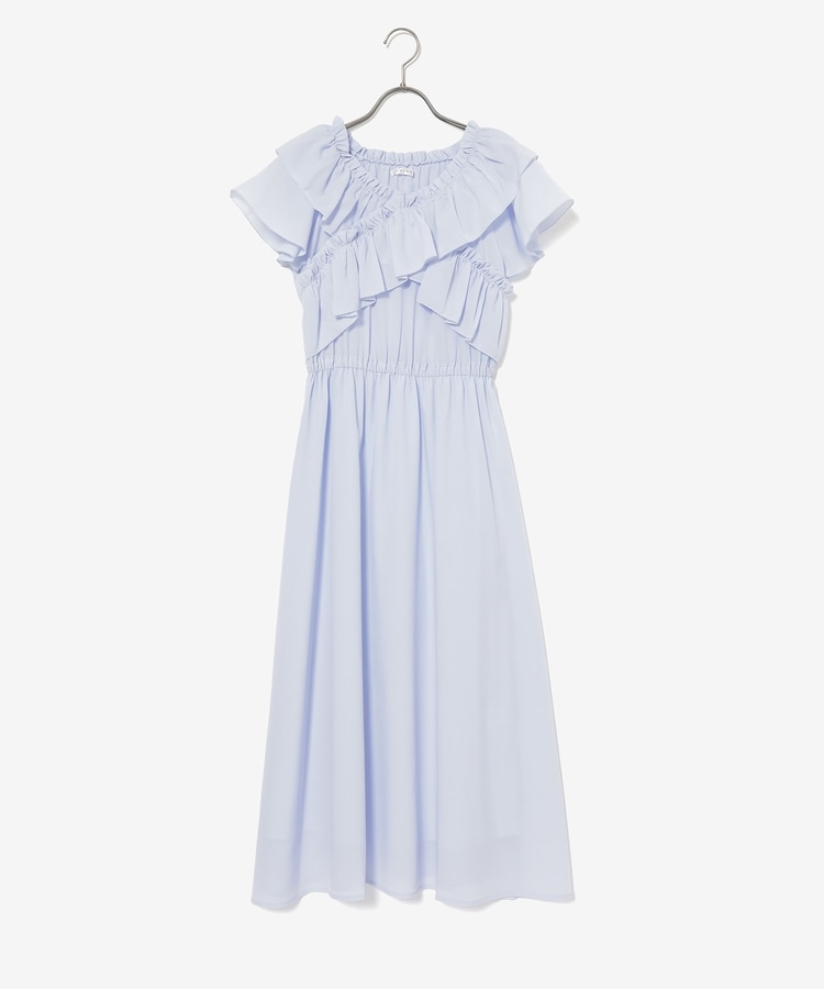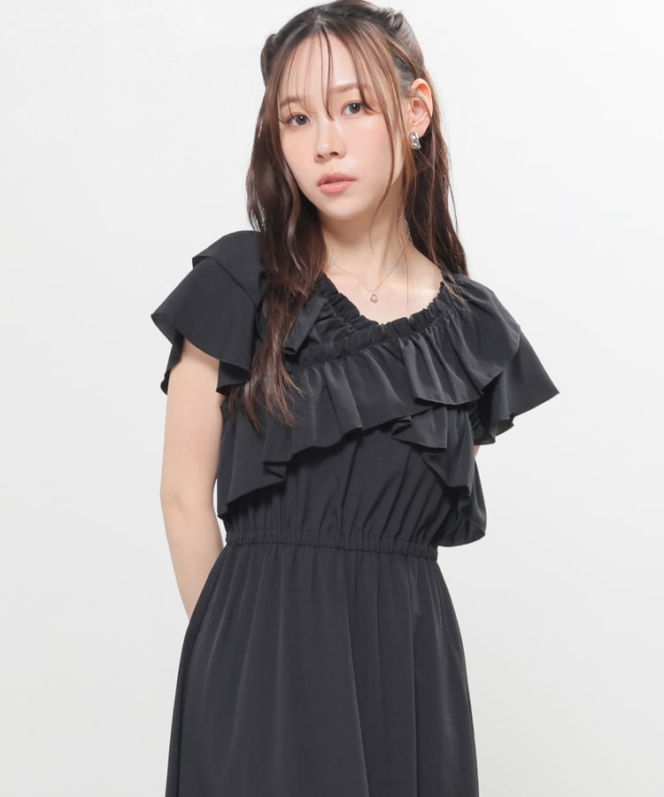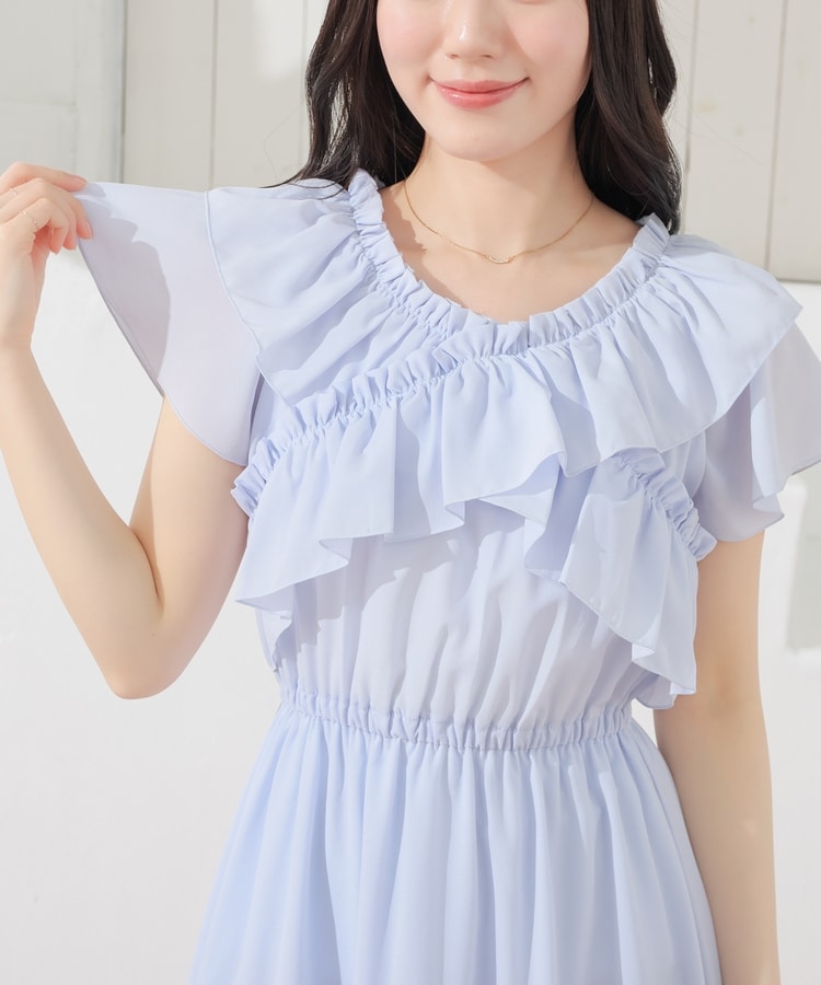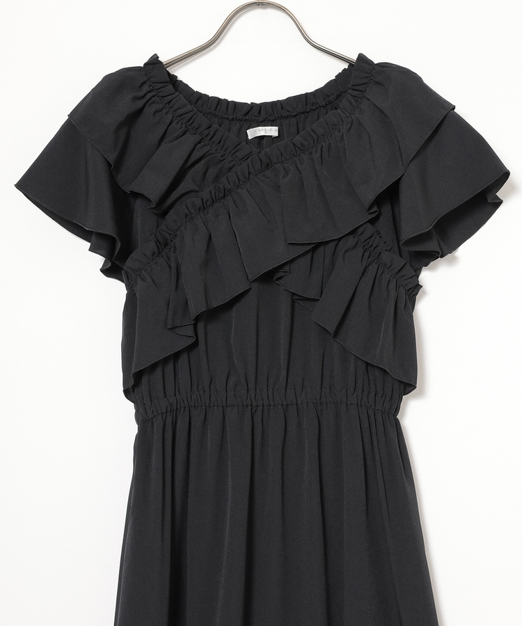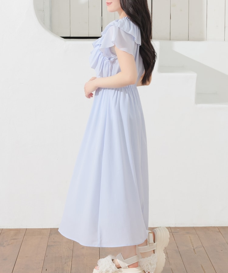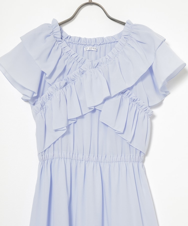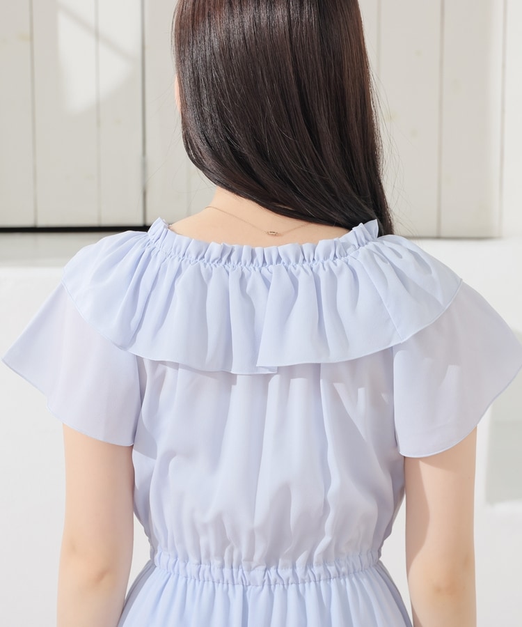 デコルテを綺麗に見せるVネックに、クロスしたたっぷりフリルが華やかでガーリーなデザイン。