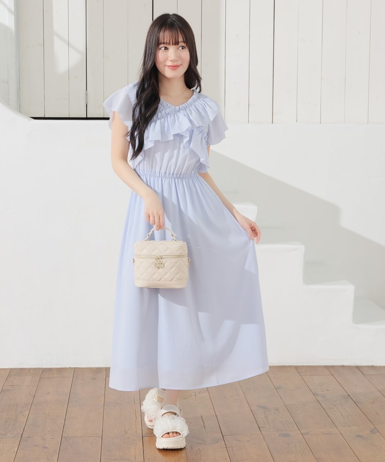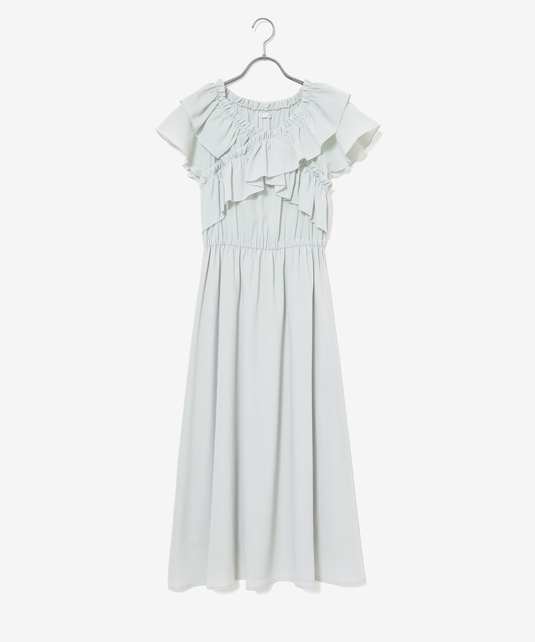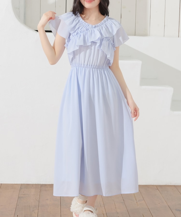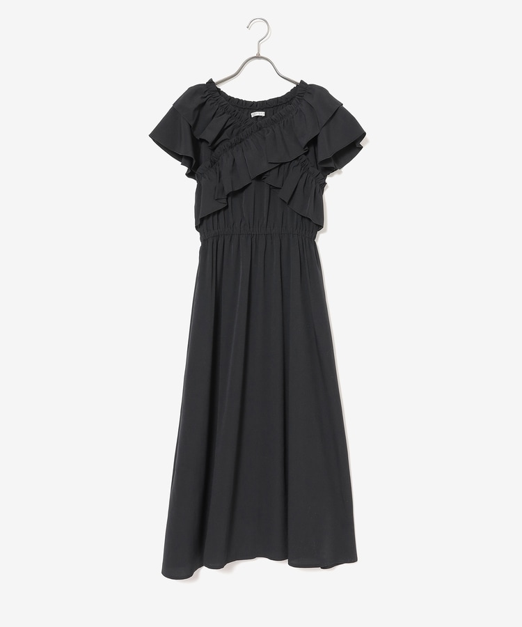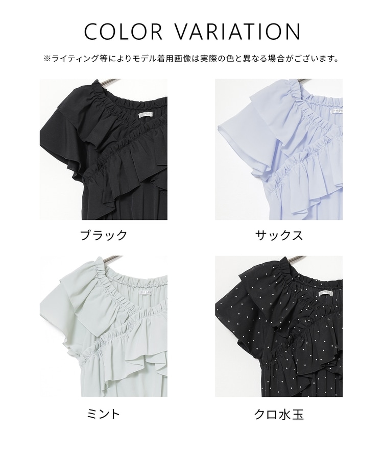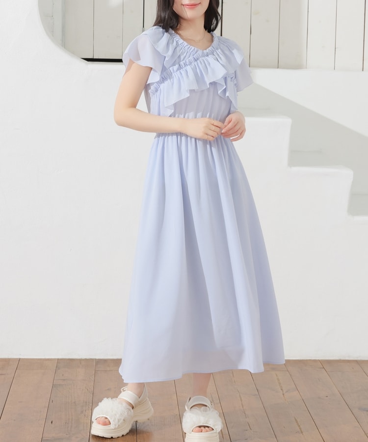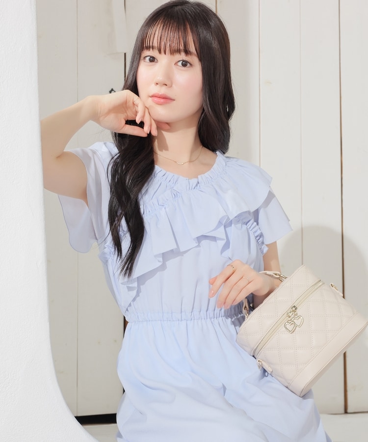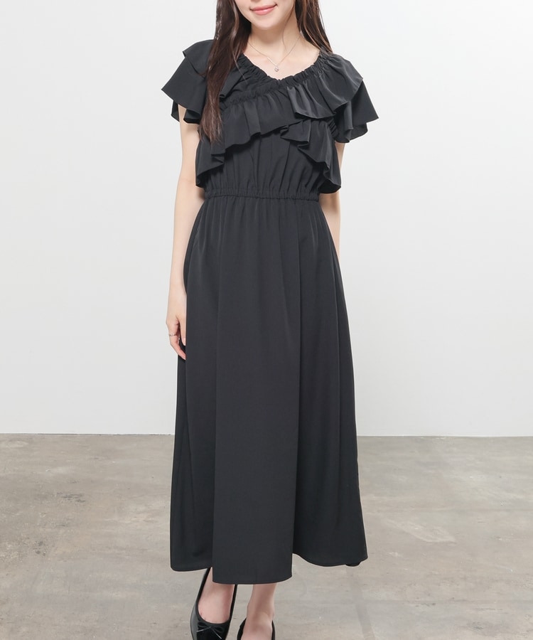 デコルテを綺麗に見せるVネックに、クロスしたたっぷりフリルが華やかでガーリーなデザイン。