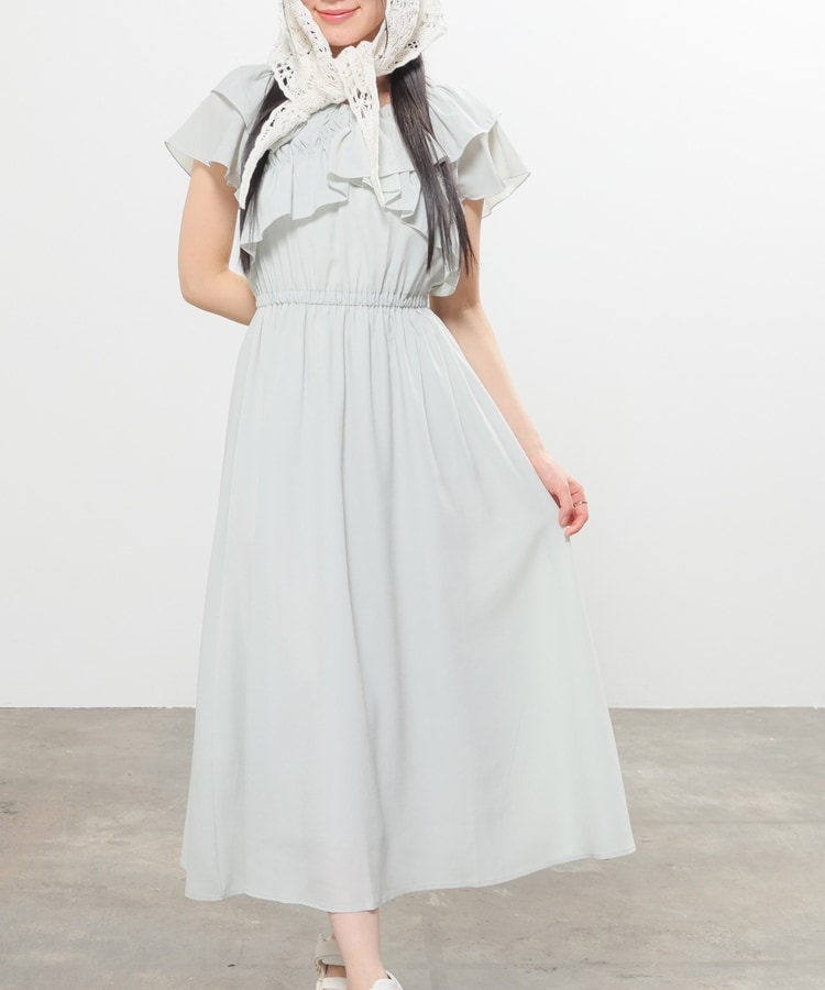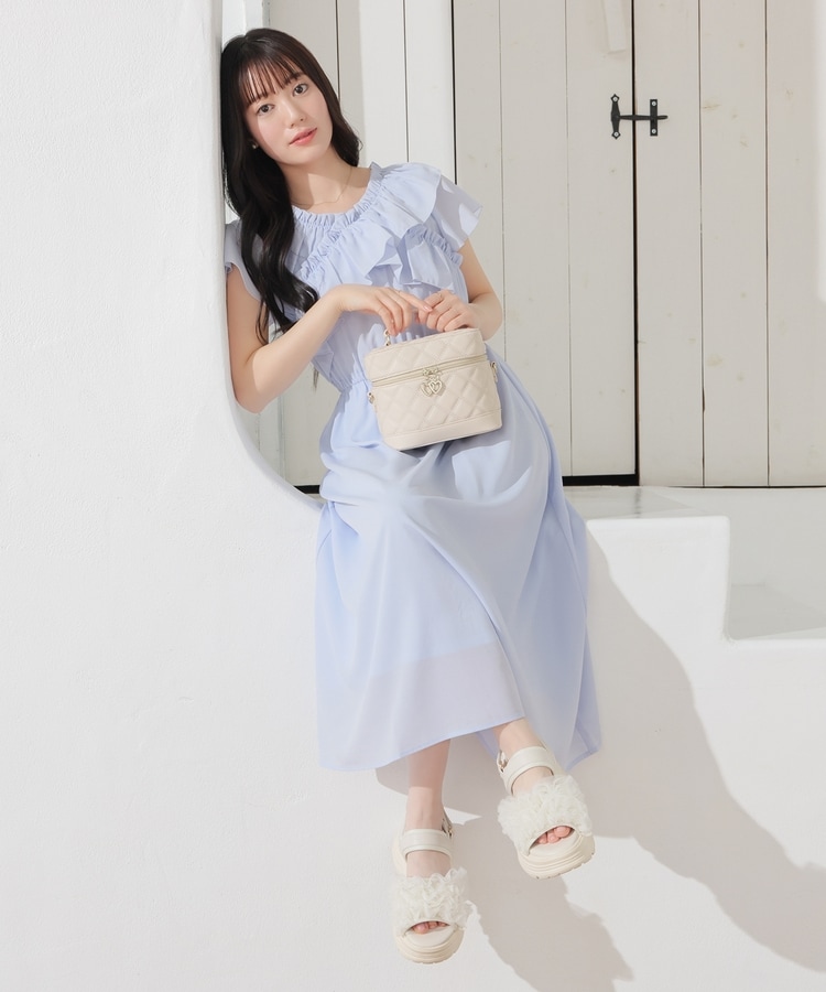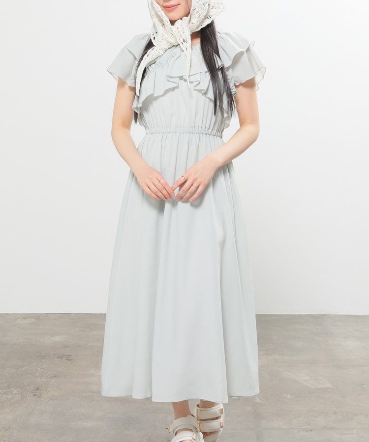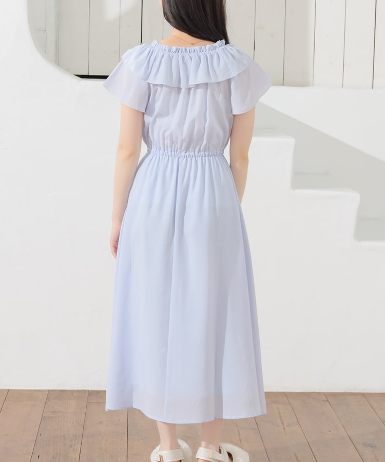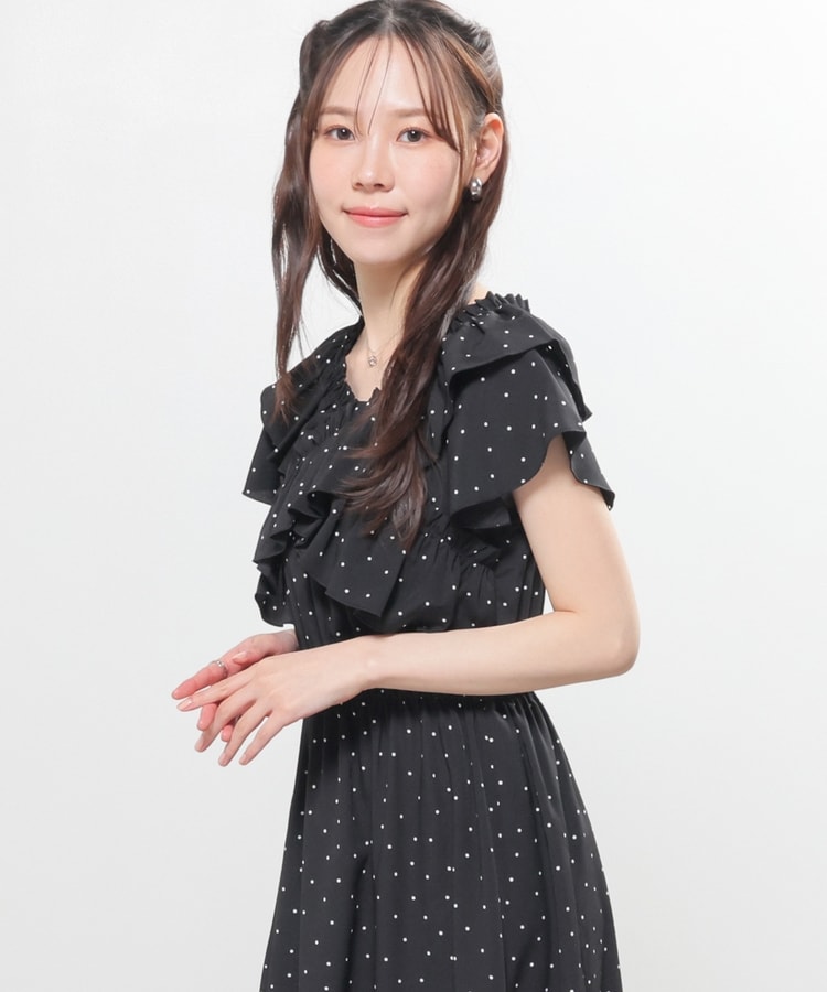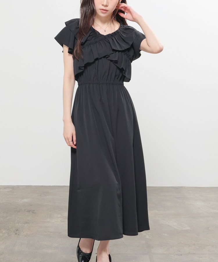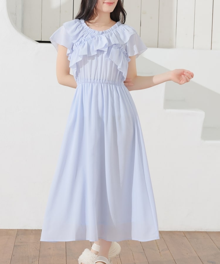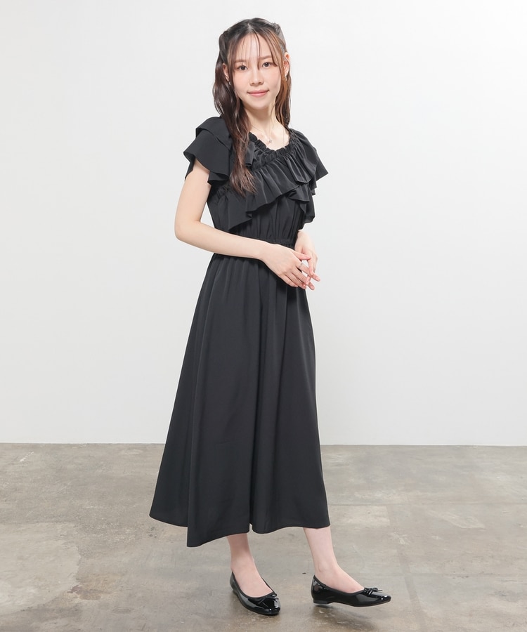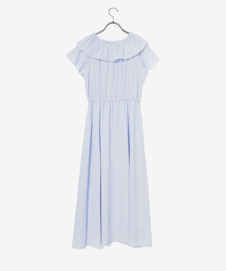 デコルテを綺麗に見せるVネックに、クロスしたたっぷりフリルが華やかでガーリーなデザイン。