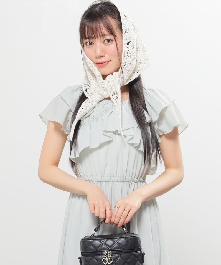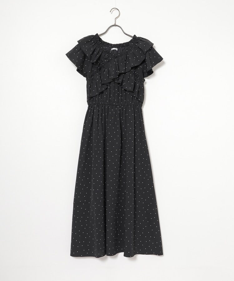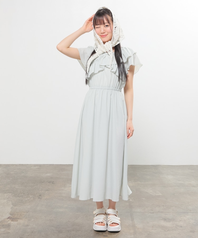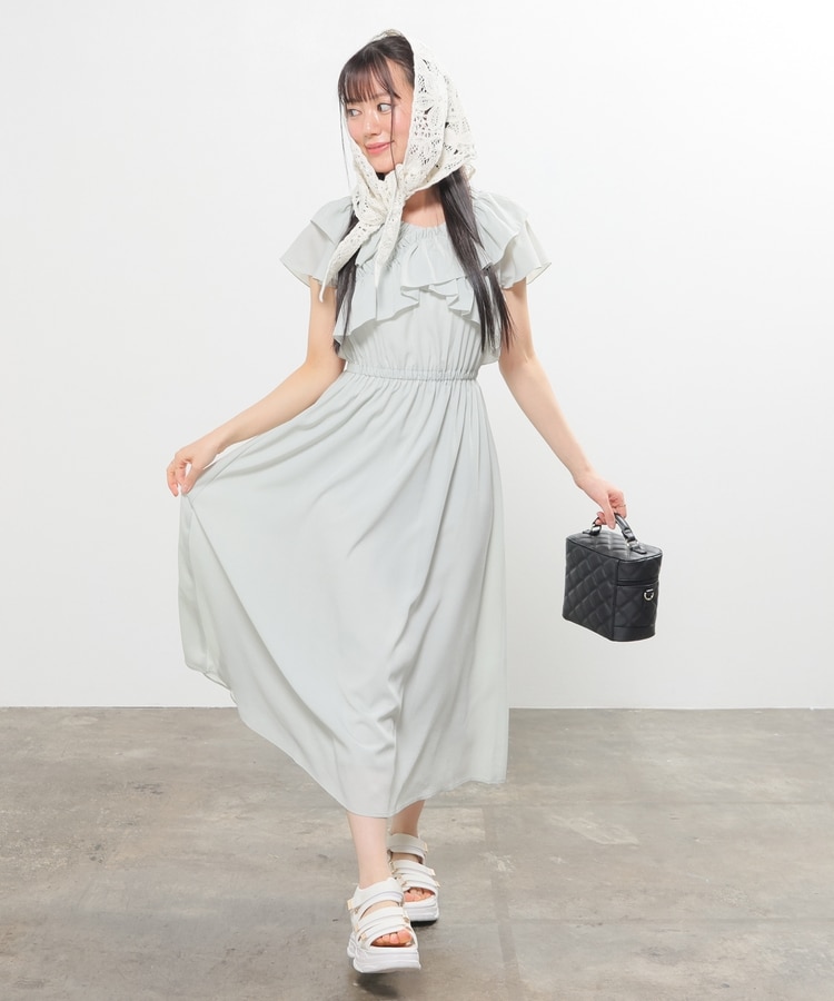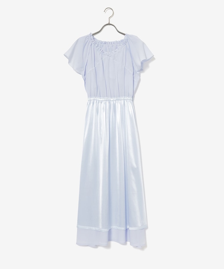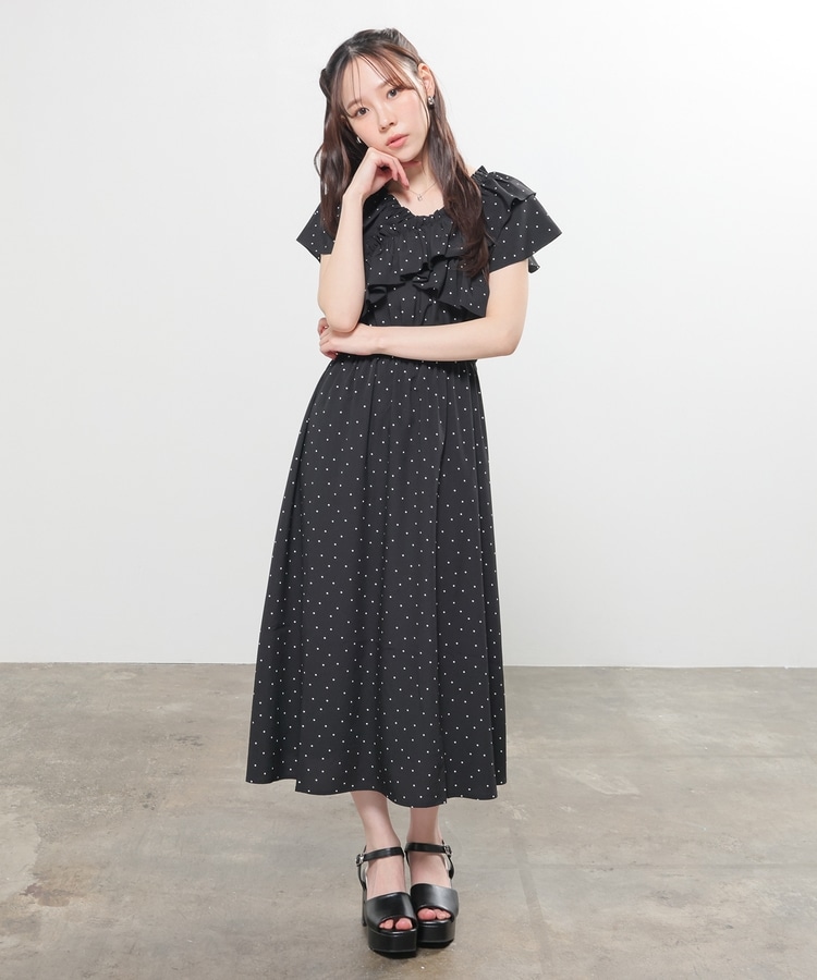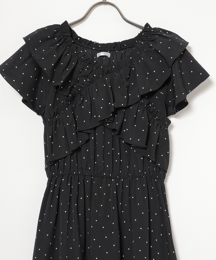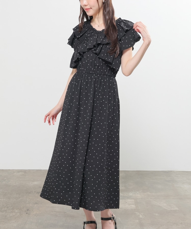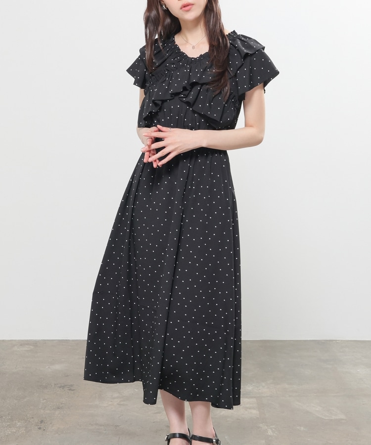 デコルテを綺麗に見せるVネックに、クロスしたたっぷりフリルが華やかでガーリーなデザイン。