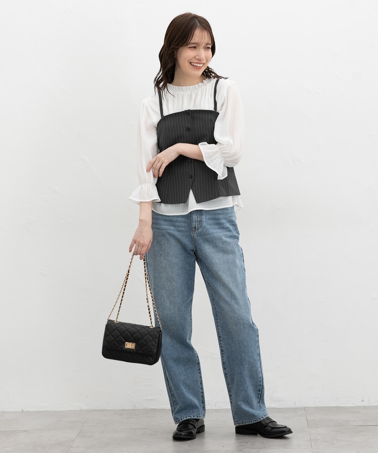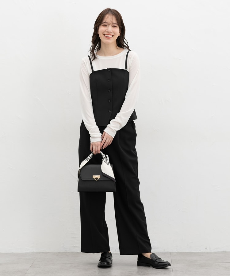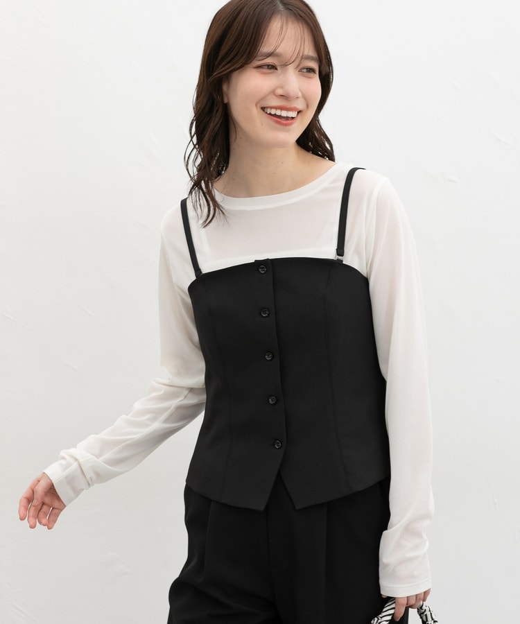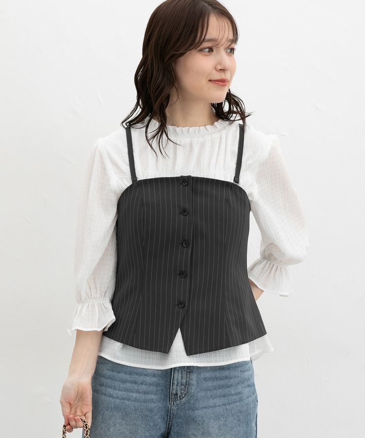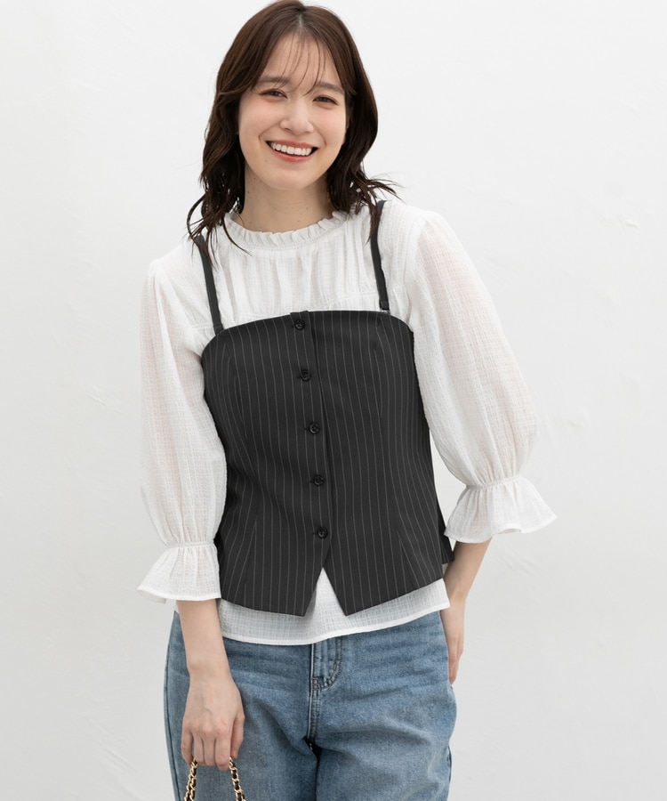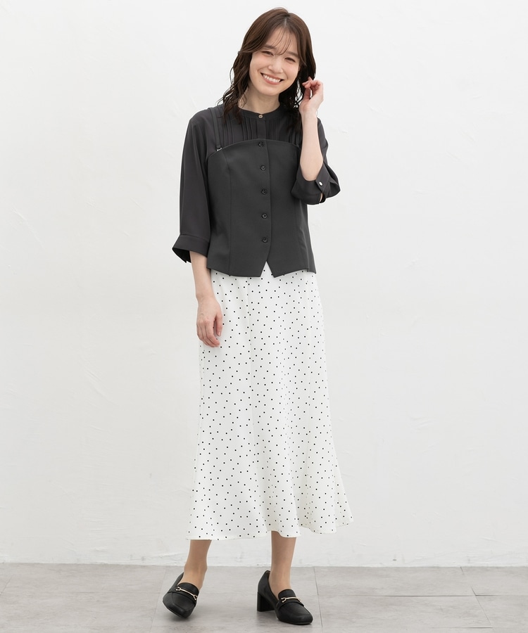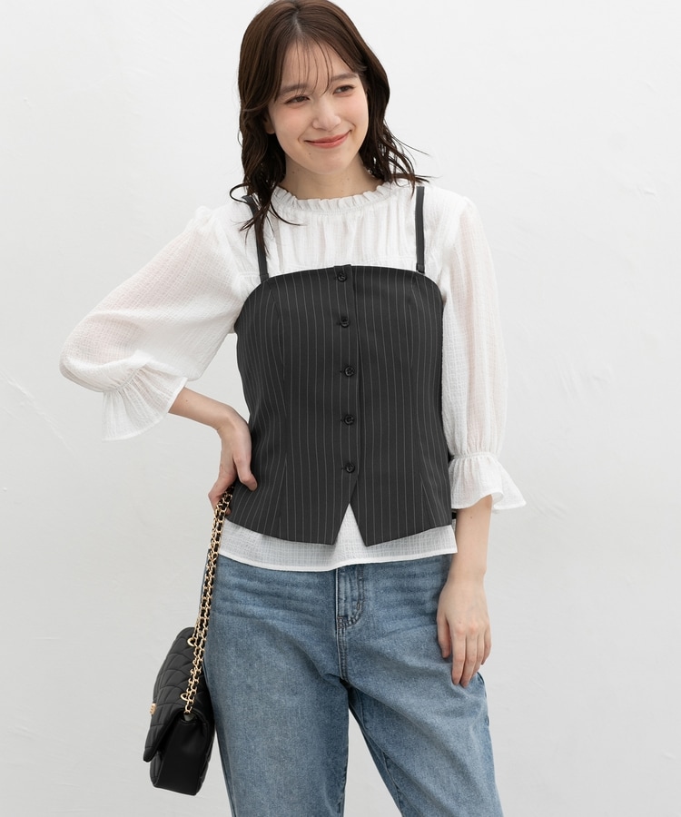 シンプルなTシャツやブラウスに合わせるだけで旬なレイヤードスタイルが完成。