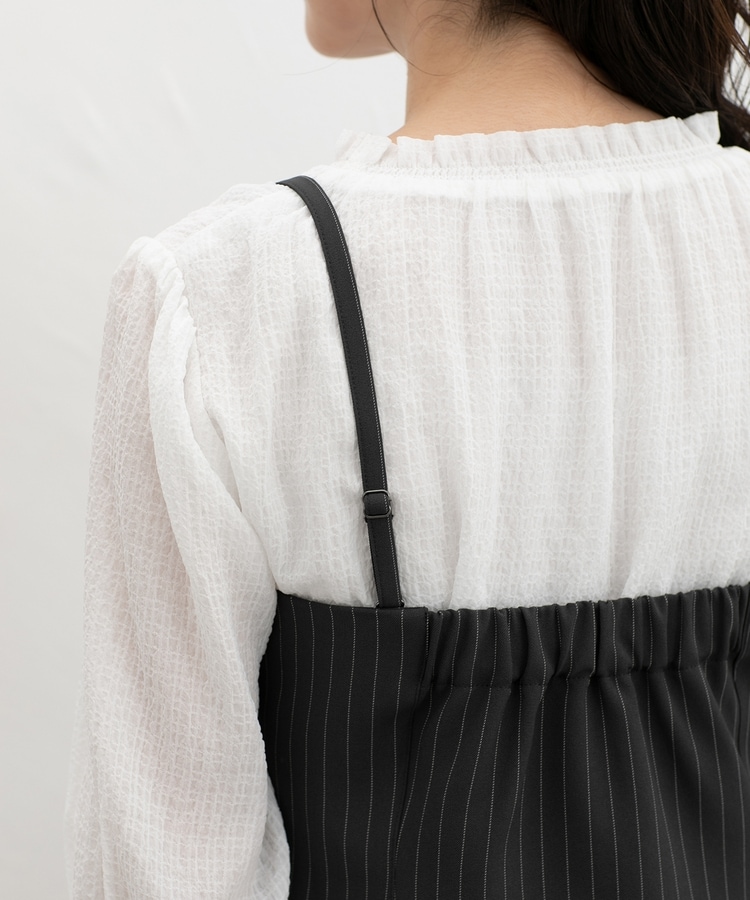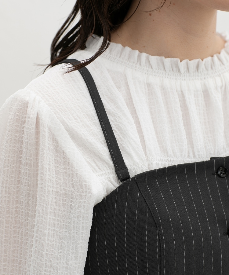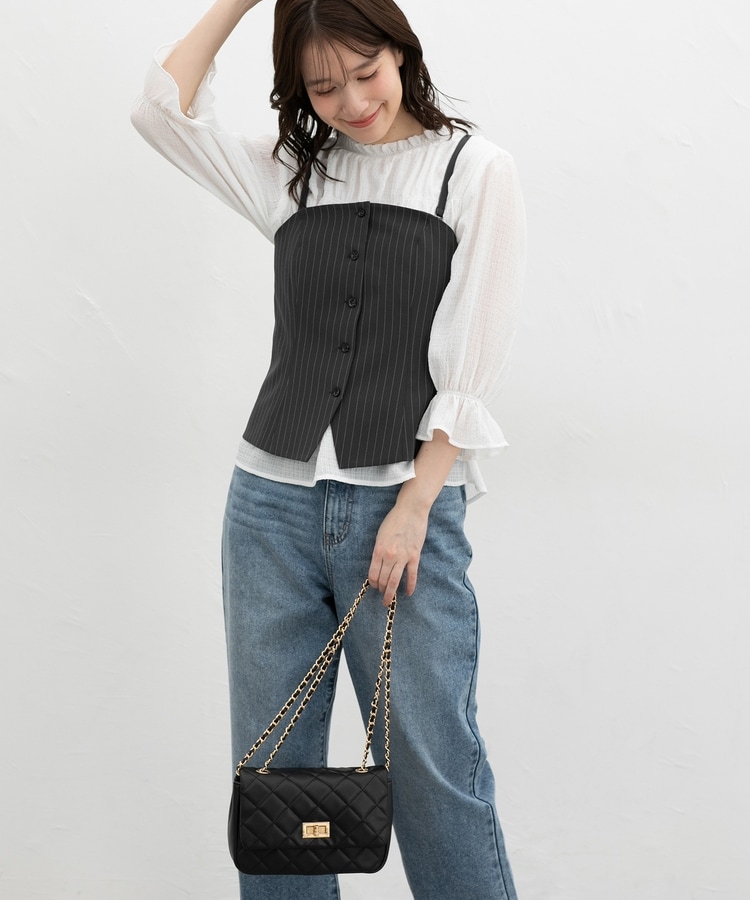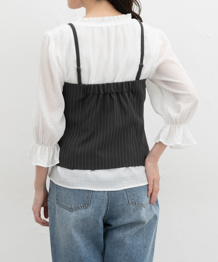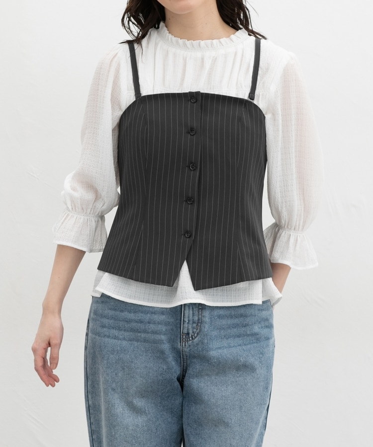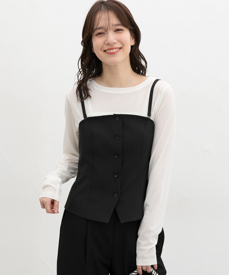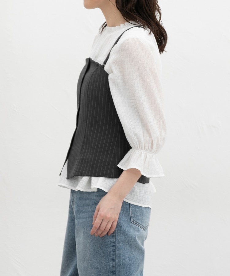 シンプルなTシャツやブラウスに合わせるだけで旬なレイヤードスタイルが完成。