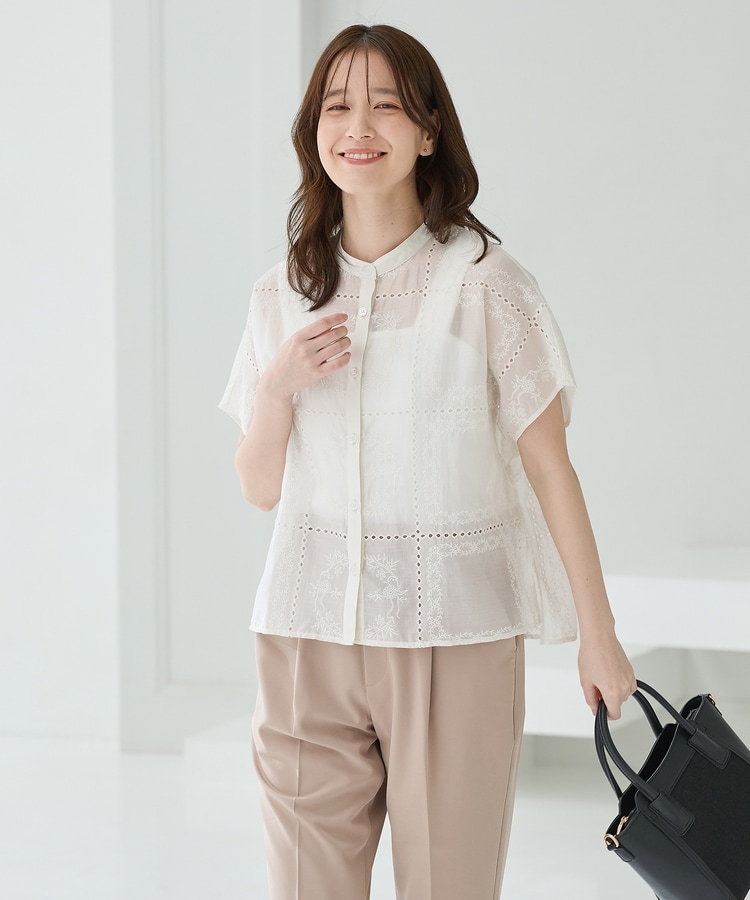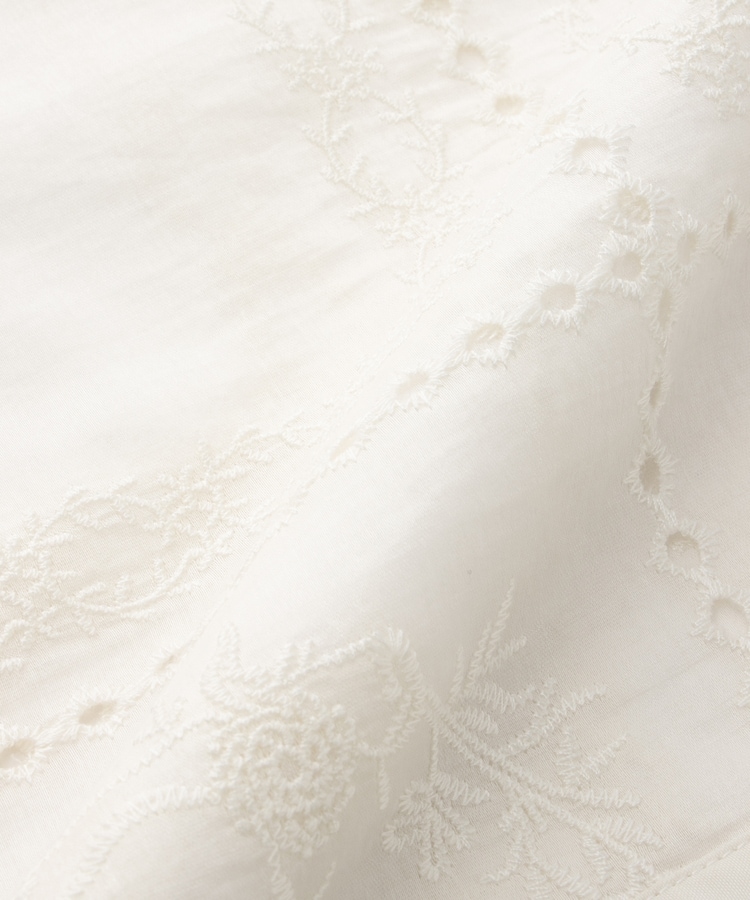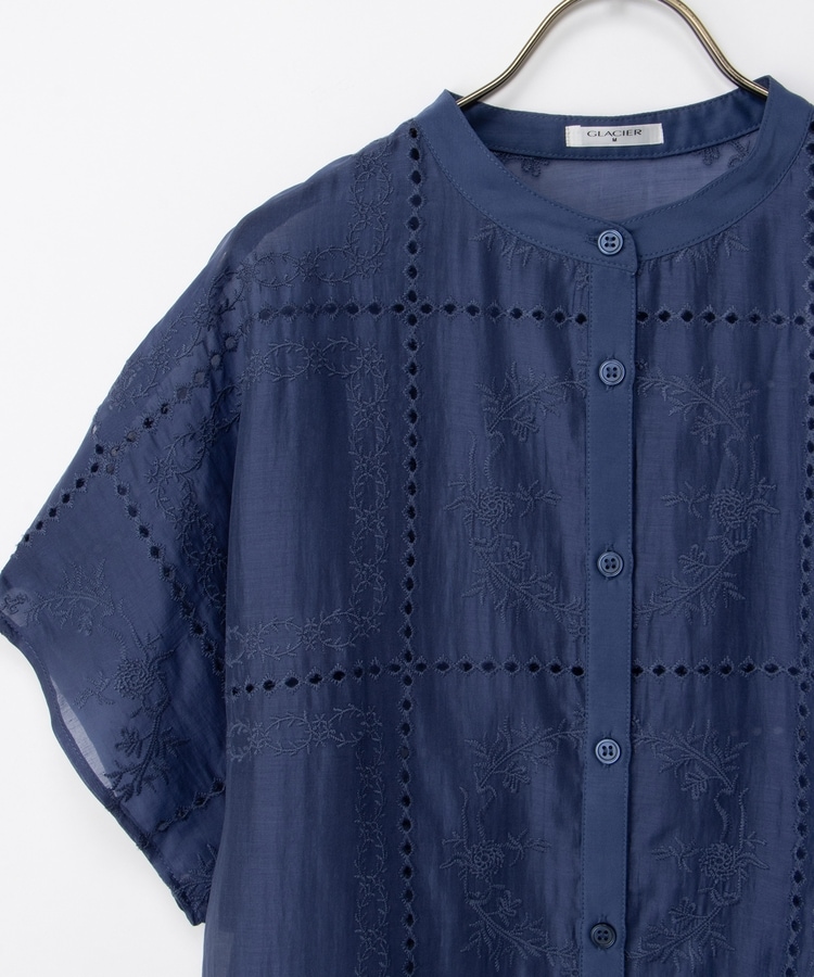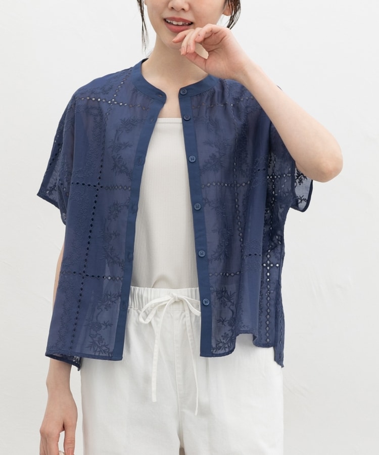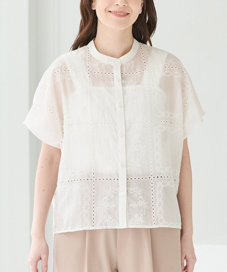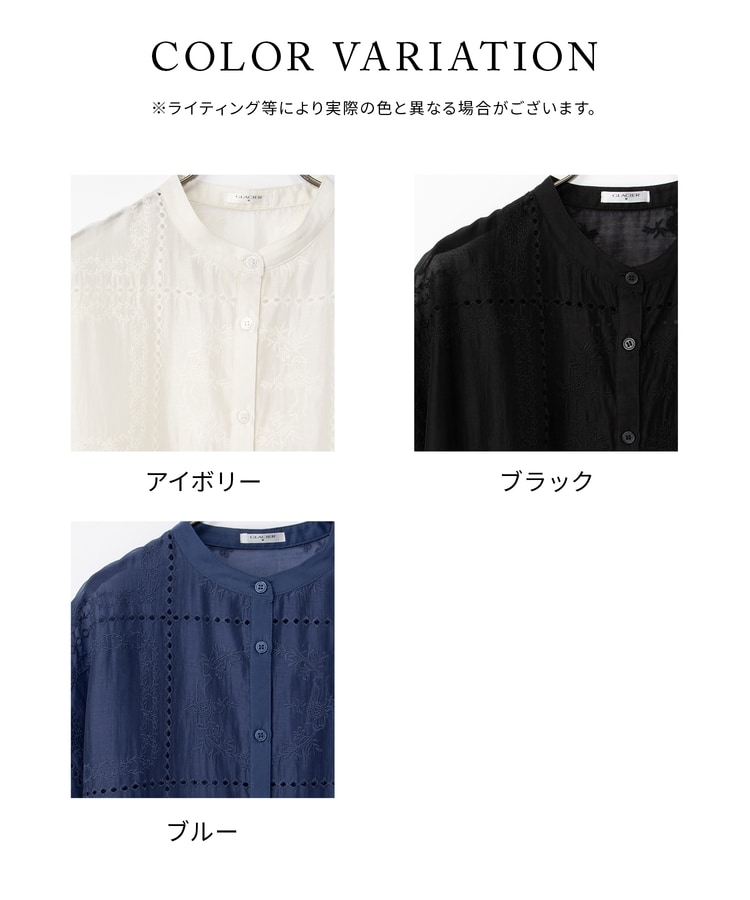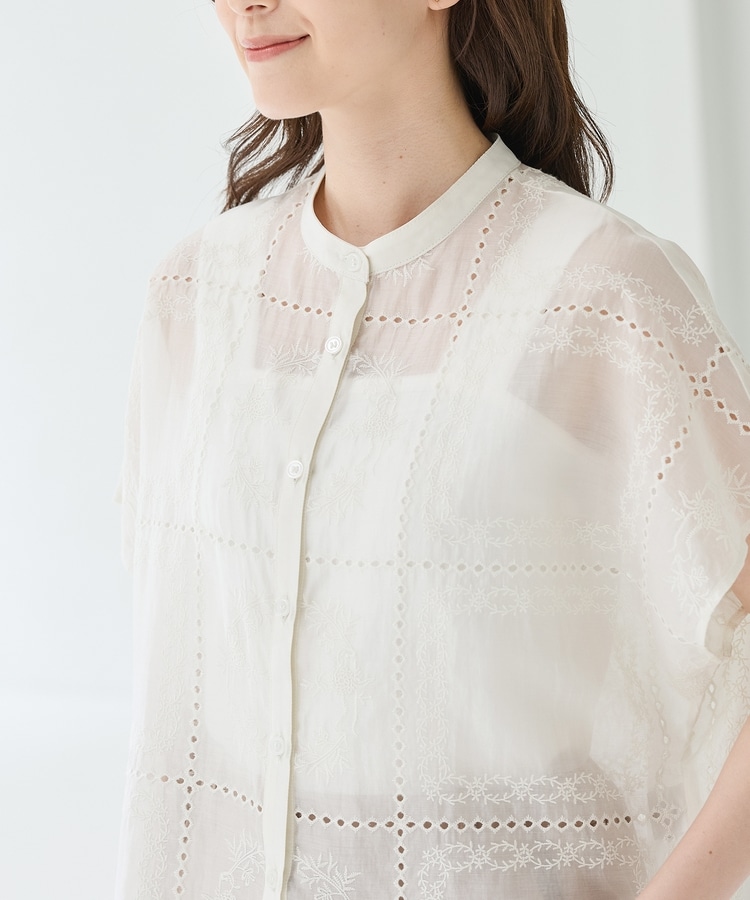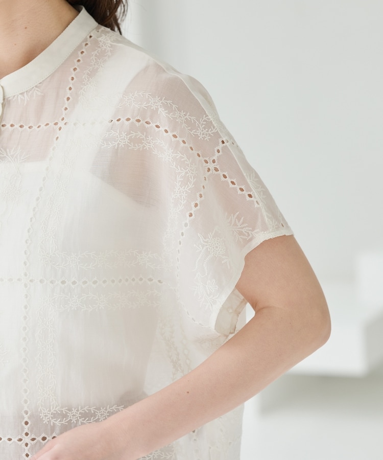 きちんと感のあるスタンドカラーに繊細な花柄刺繍が華やかな、1枚で着映えるデザイン。