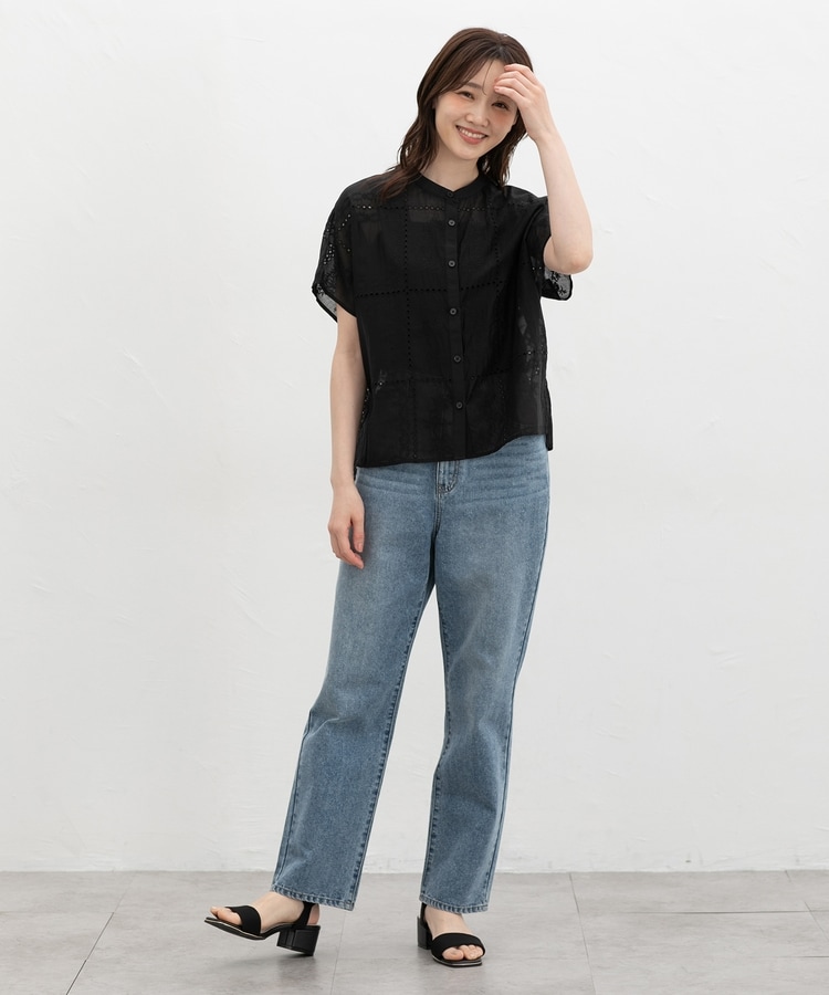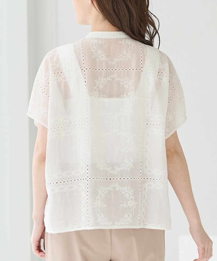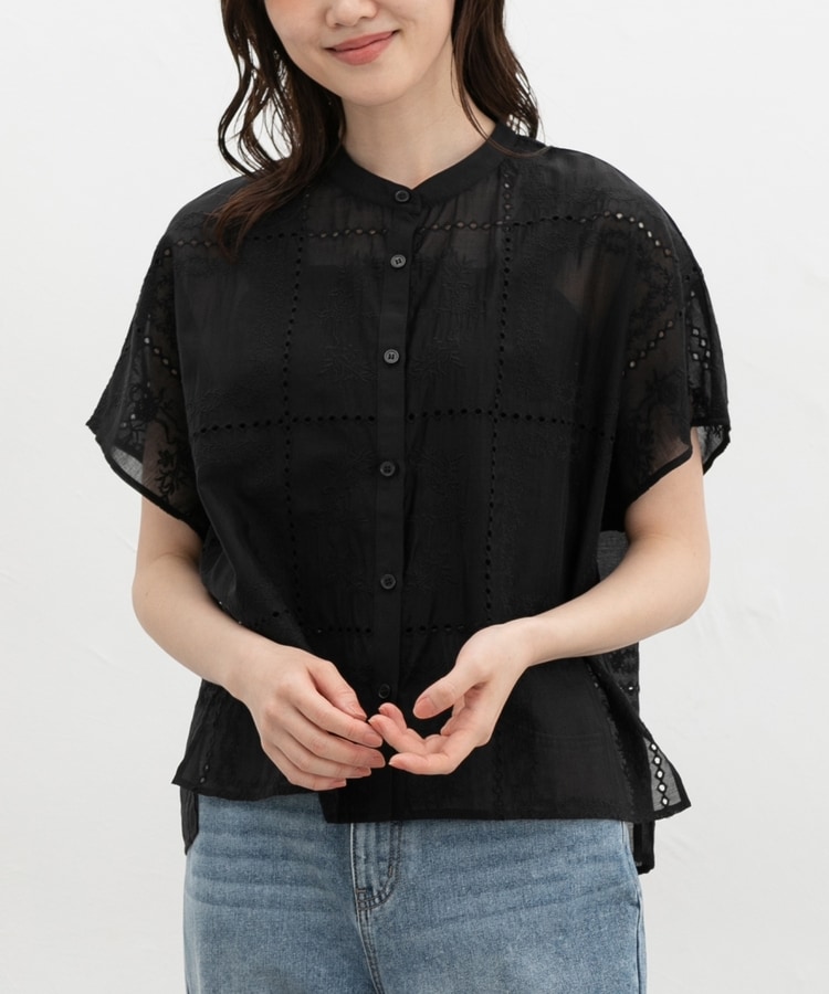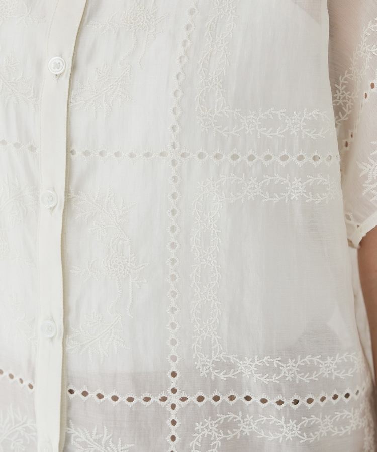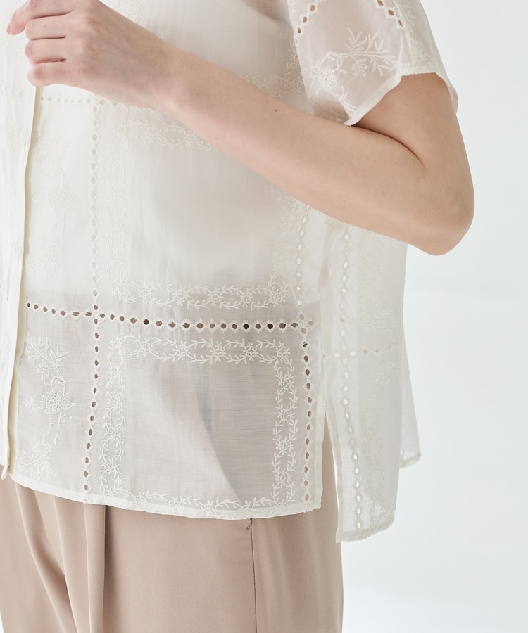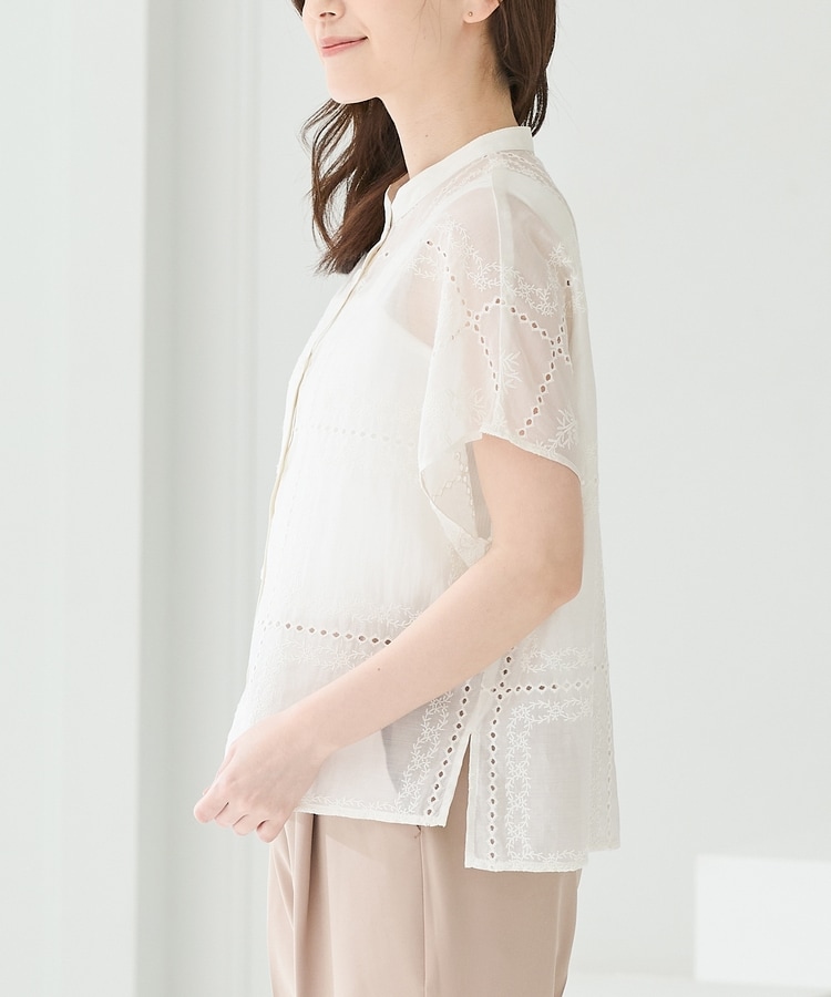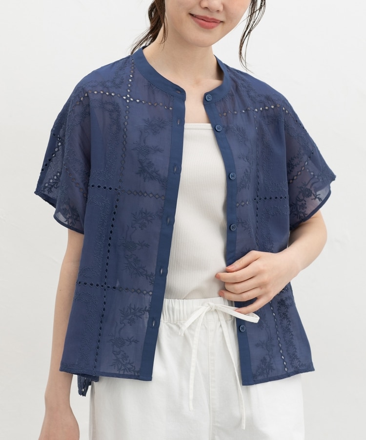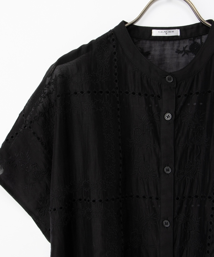 きちんと感のあるスタンドカラーに繊細な花柄刺繍が華やかな、1枚で着映えるデザイン。