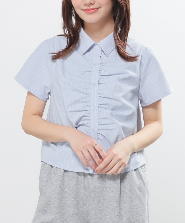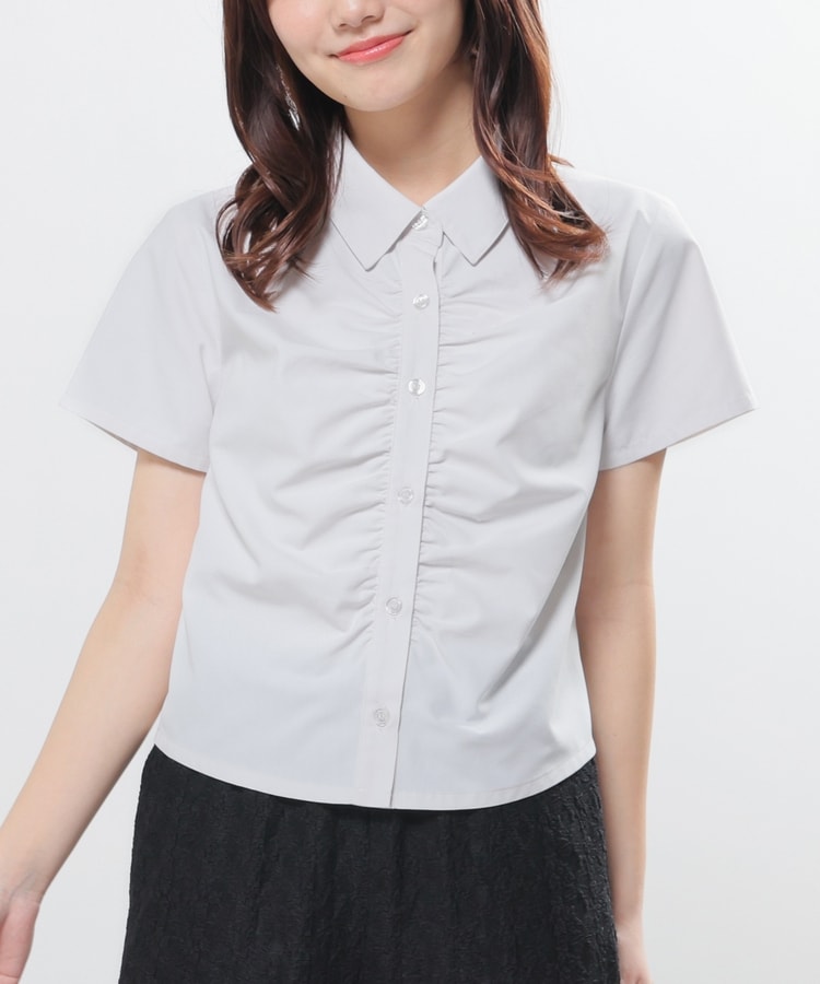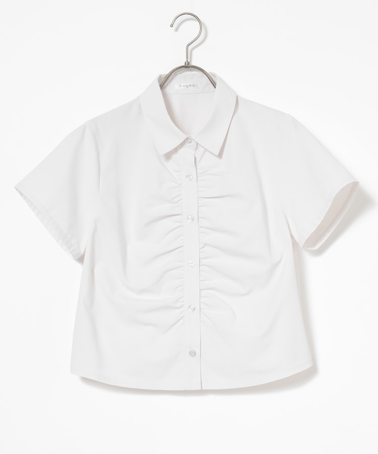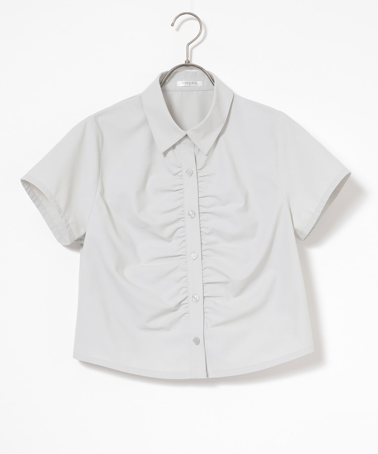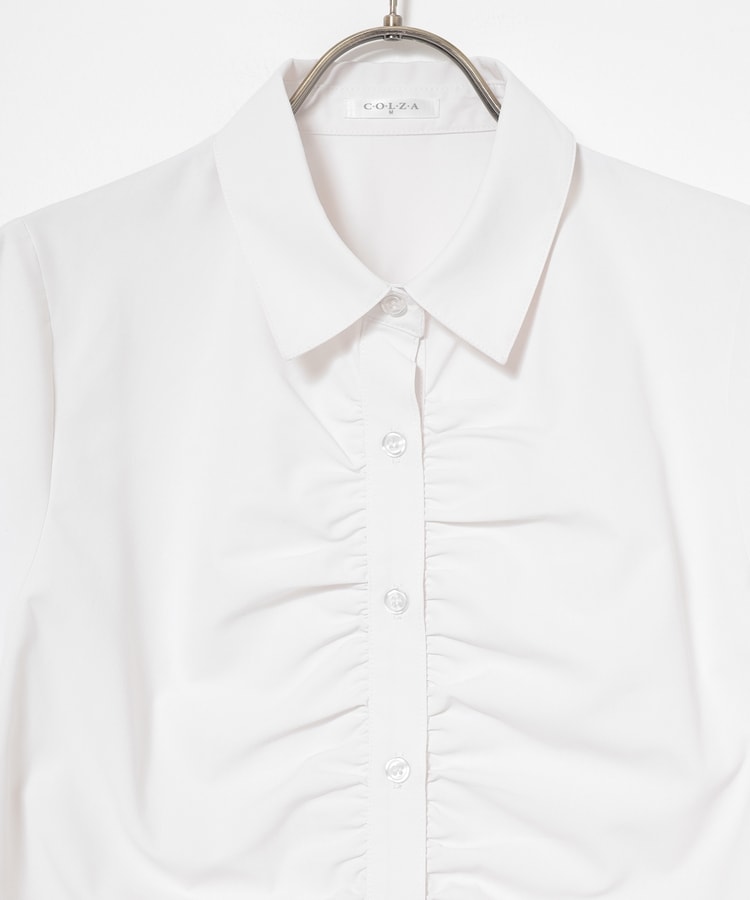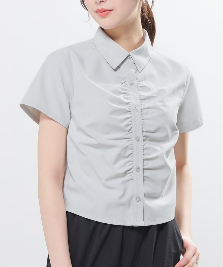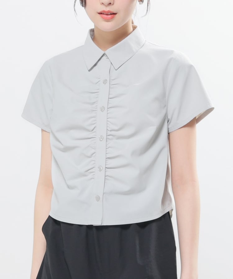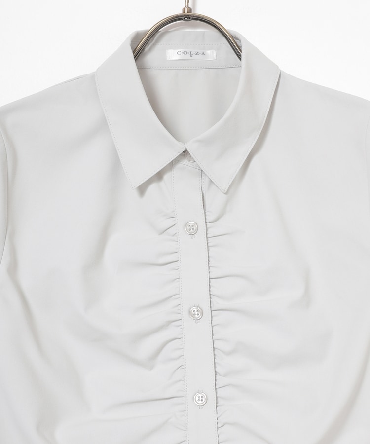 ベーシックなレギュラーシャツのボタン部分にギャザーを寄せた、さりげなくお洒落なデザイン。