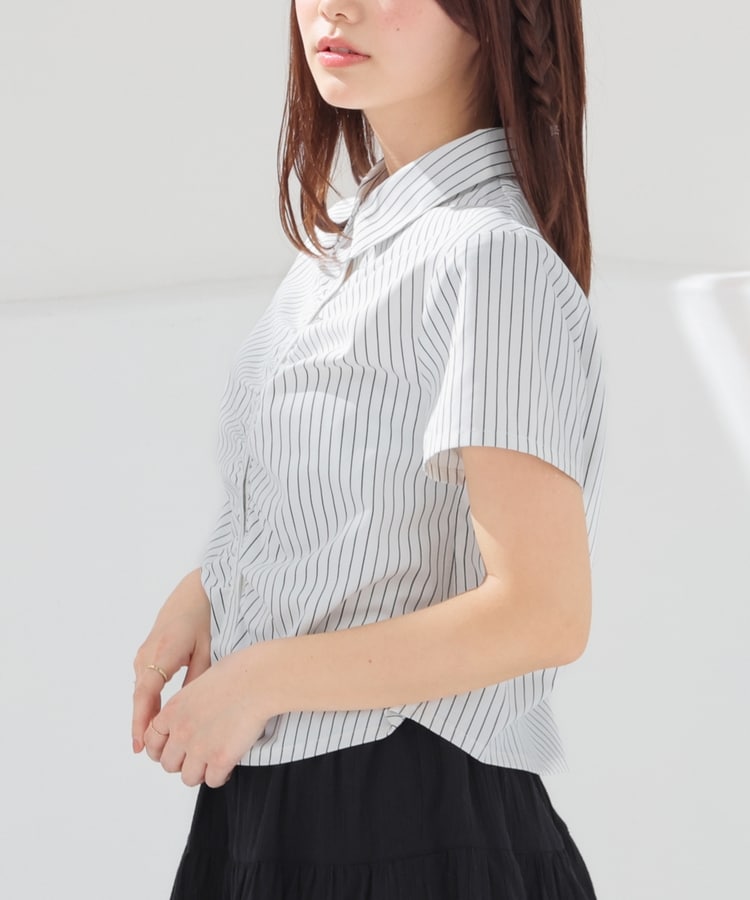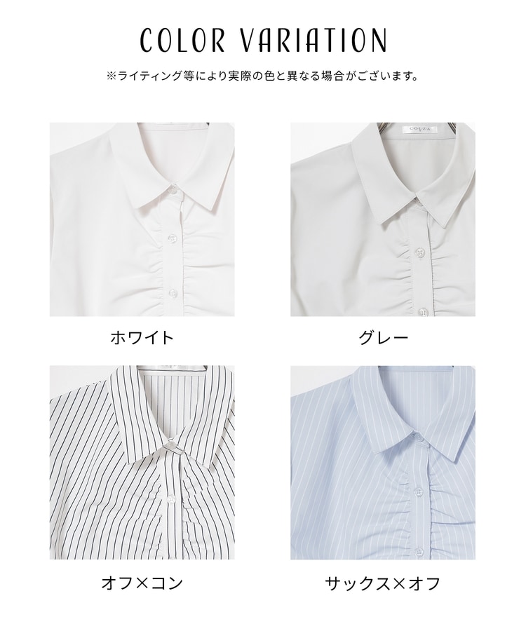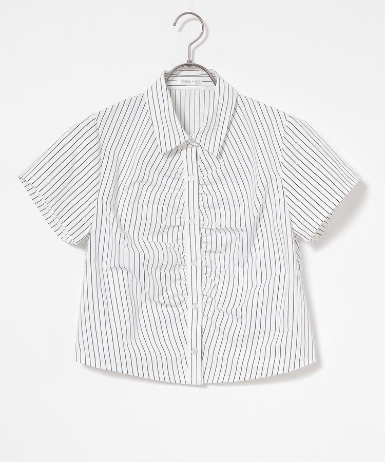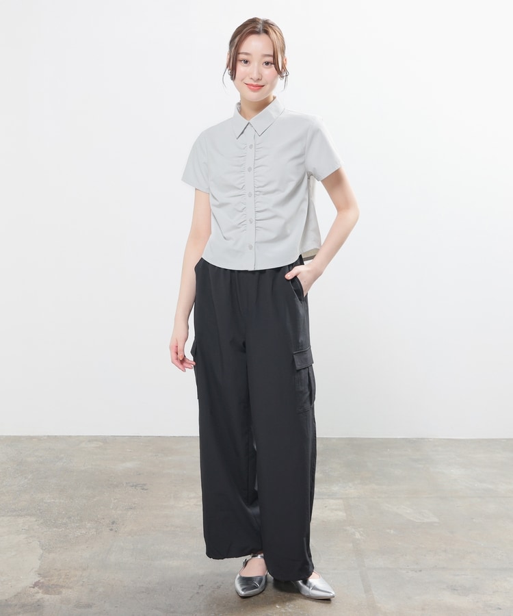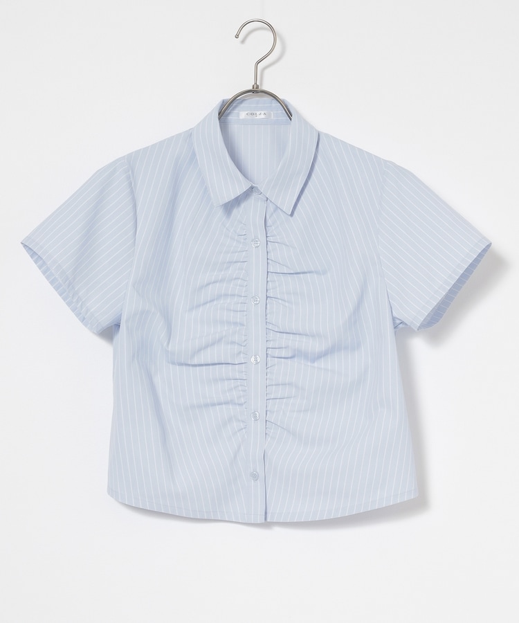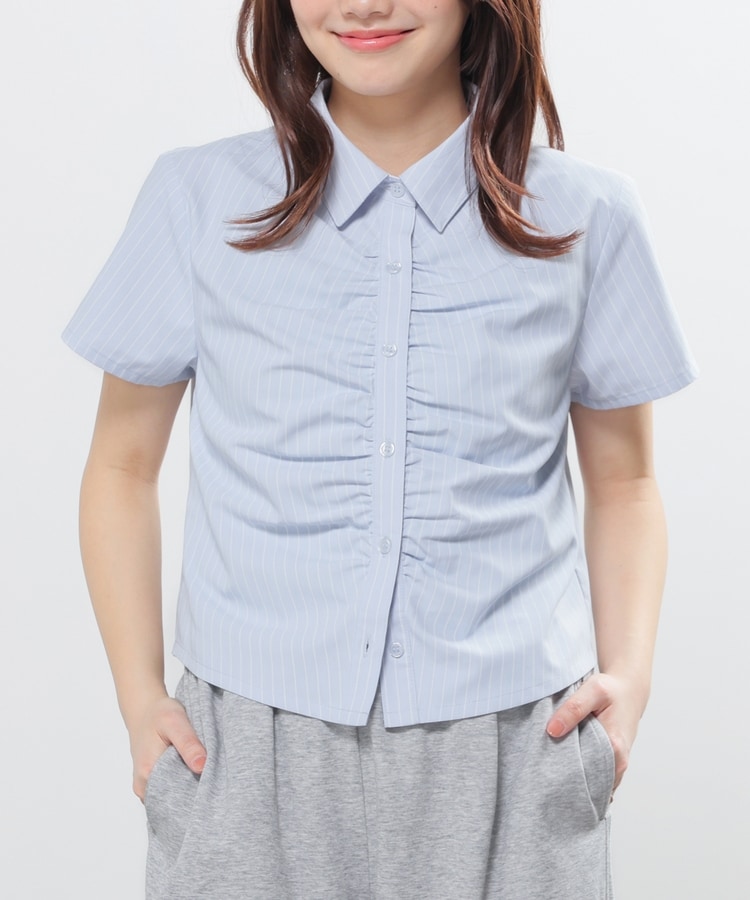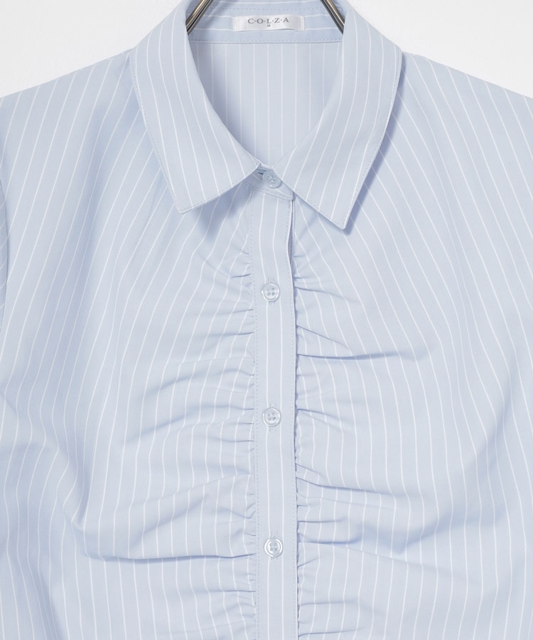 ベーシックなレギュラーシャツのボタン部分にギャザーを寄せた、さりげなくお洒落なデザイン。