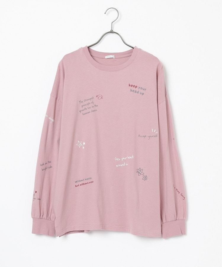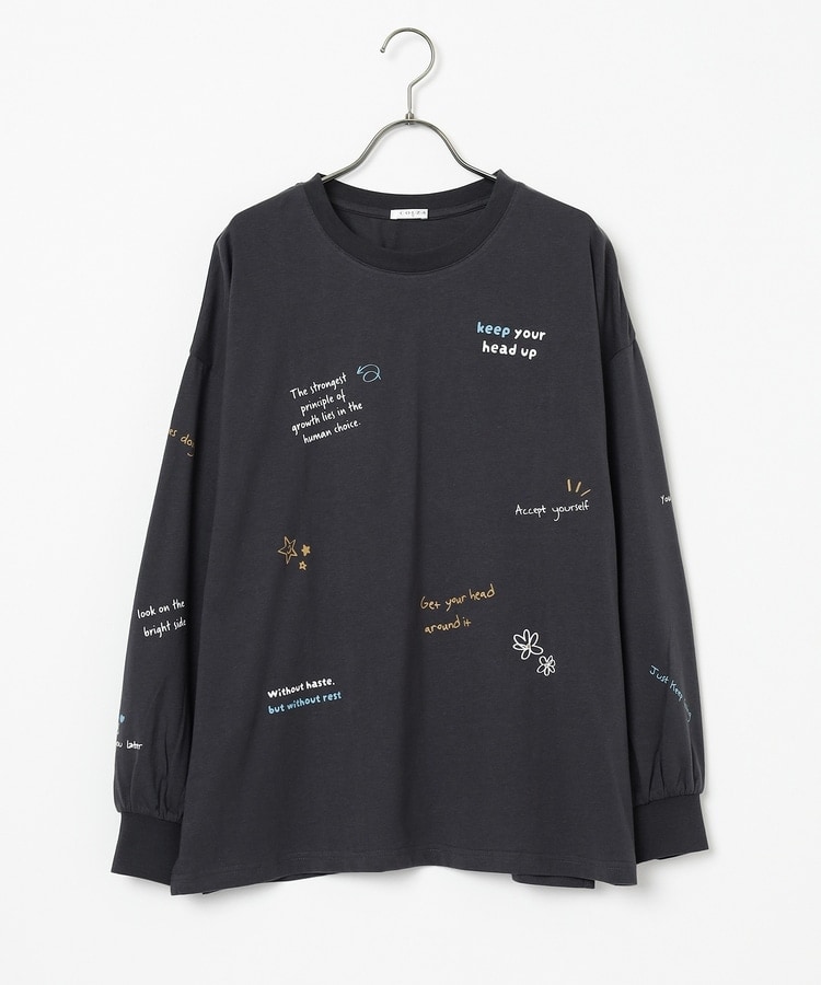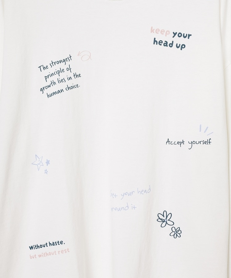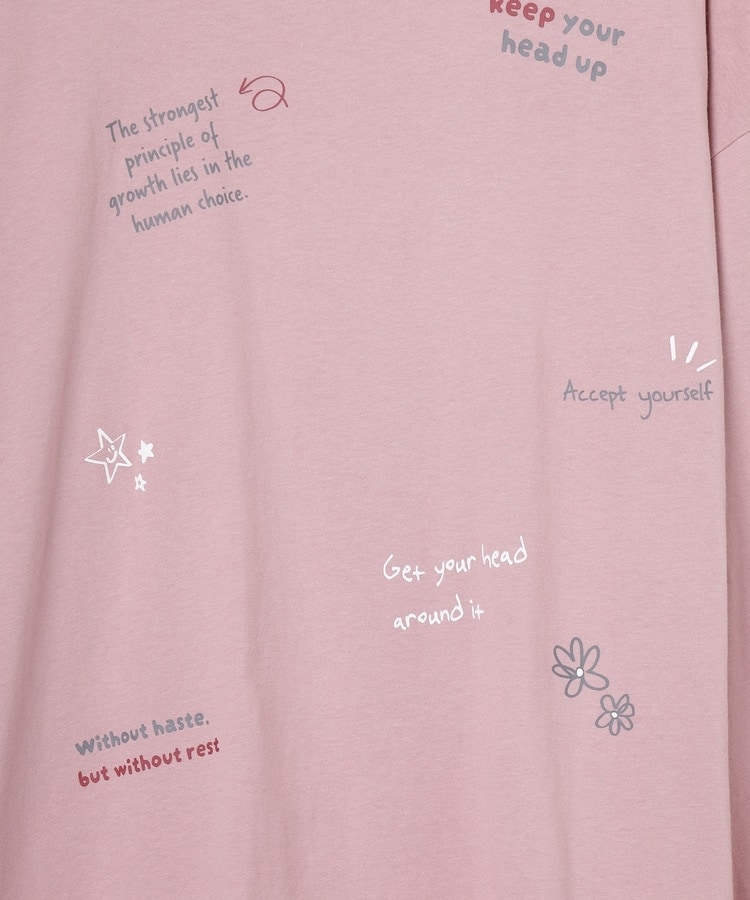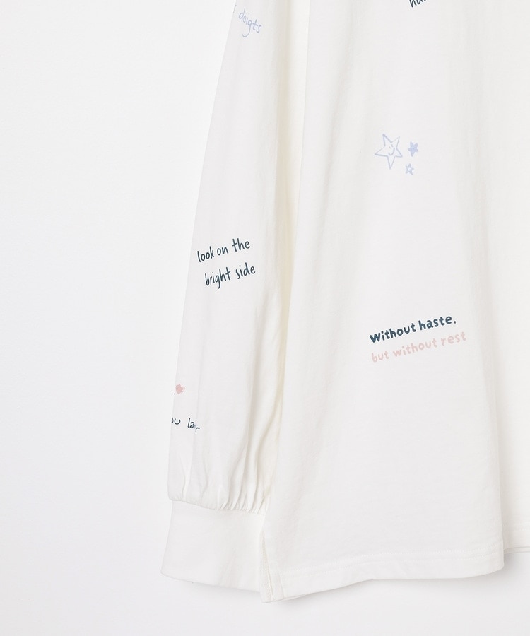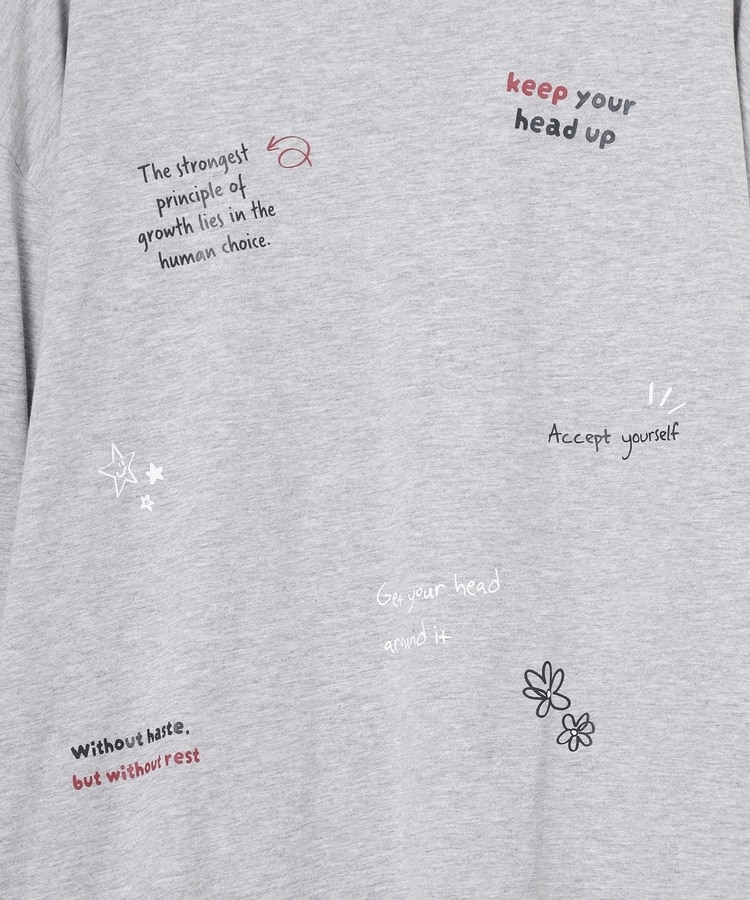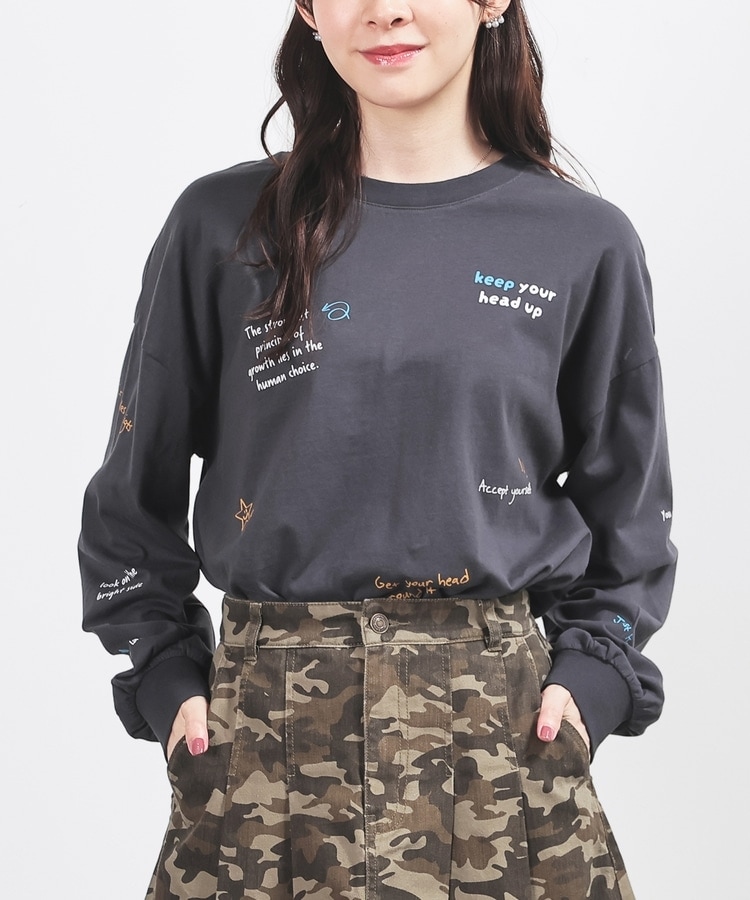 フロント&袖にちりばめた落書き風のメッセージやモチーフのプリントがPOPなデザイン。