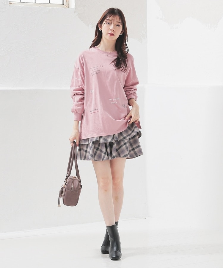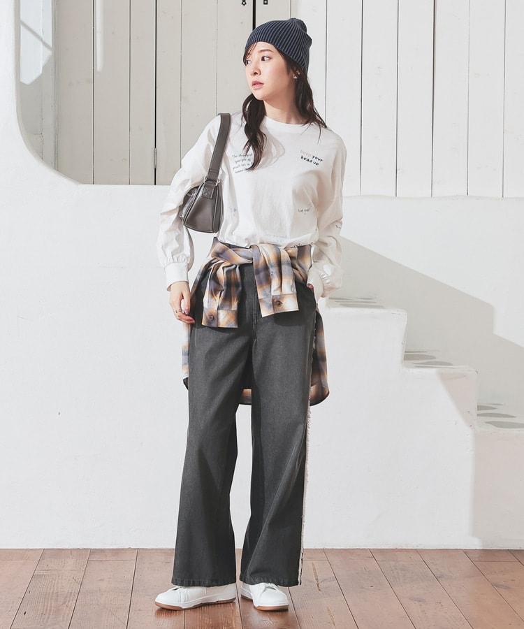 シンプルなボトムスと合わせるだけでも簡単にお洒落コーデが完成。