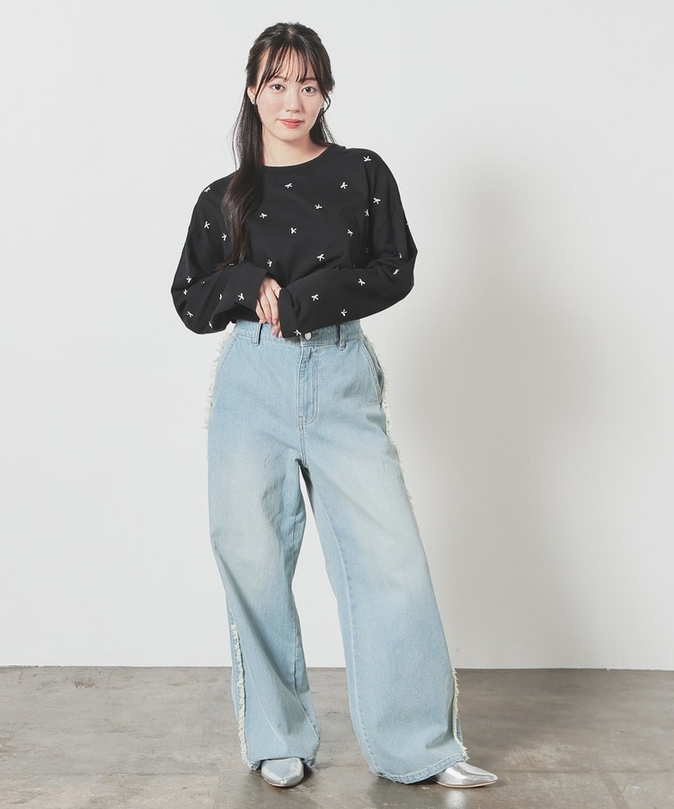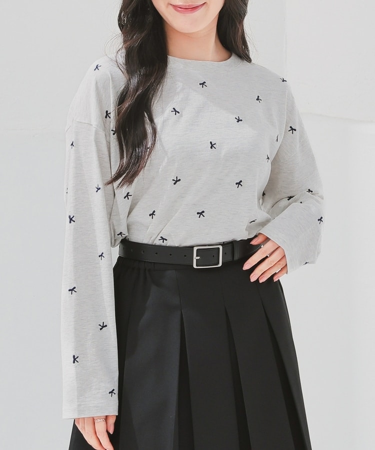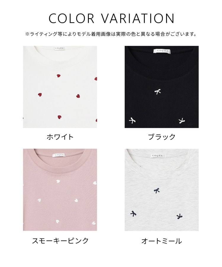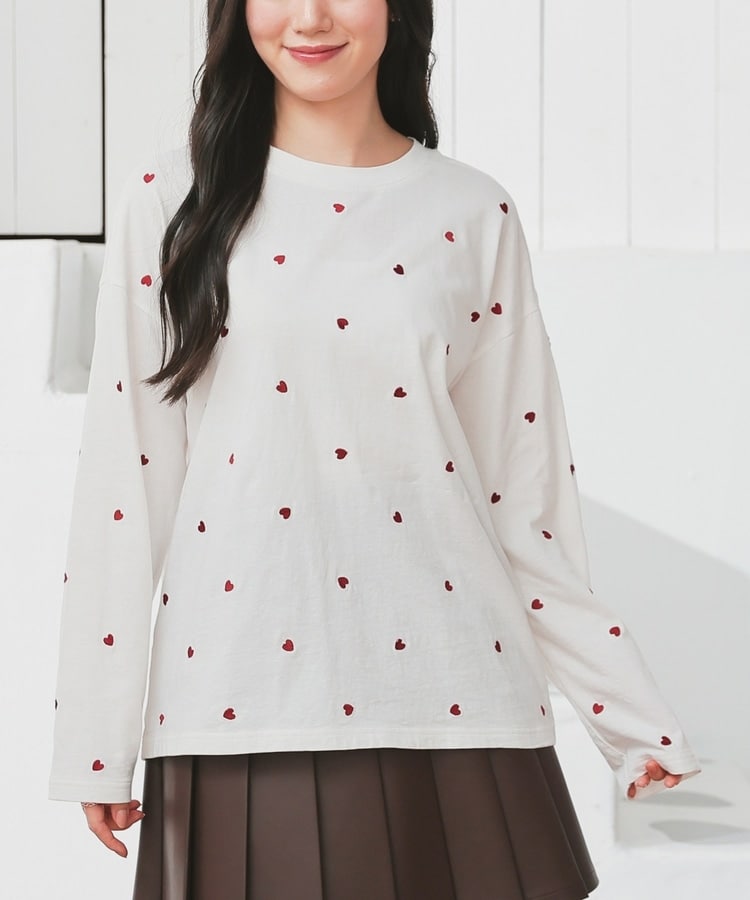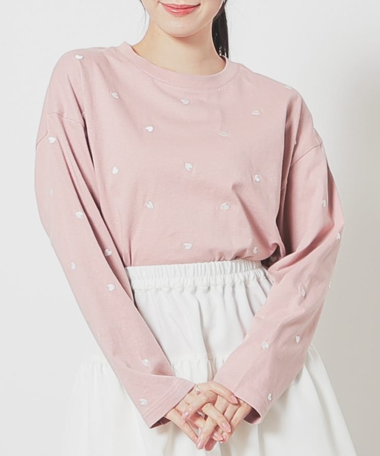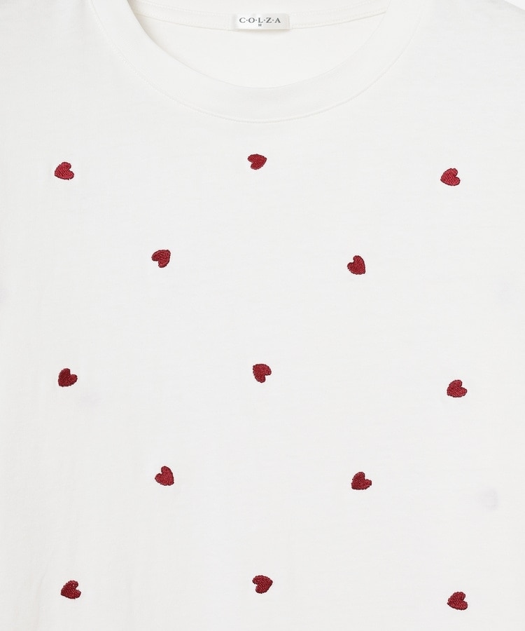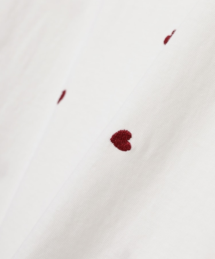 全体にちりばめれたハートとリボンモチーフの刺繍がキュートなデザイン。