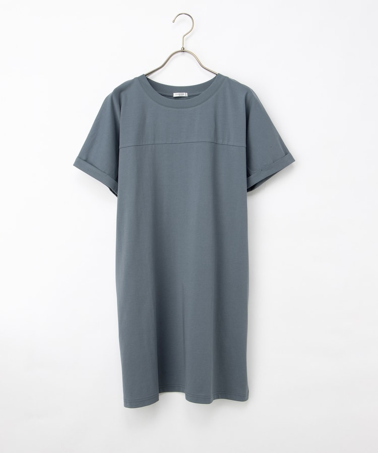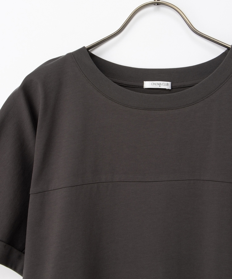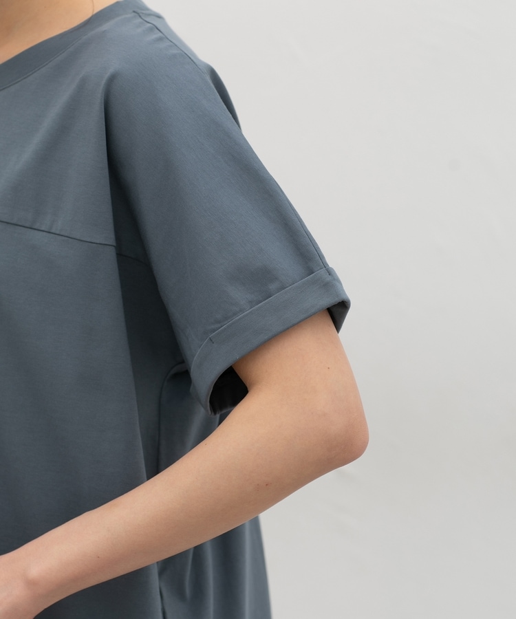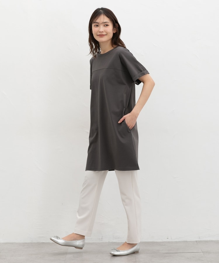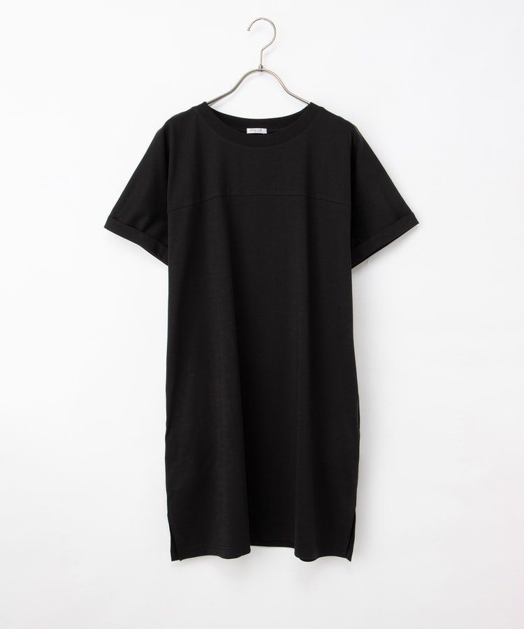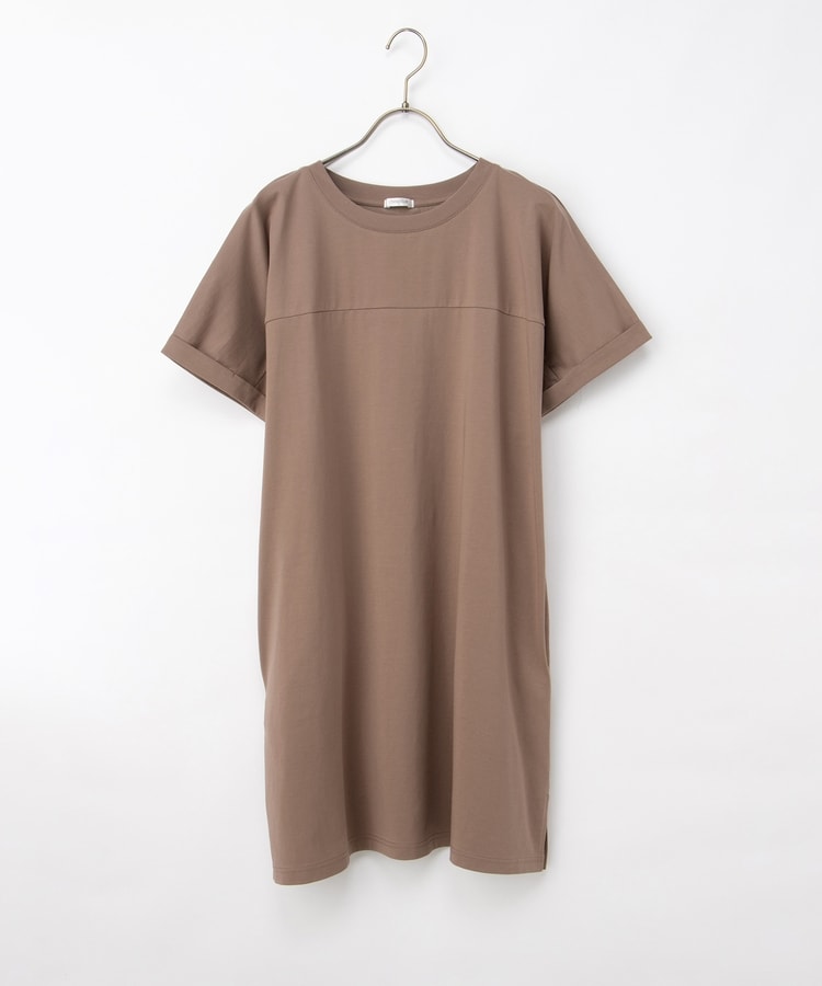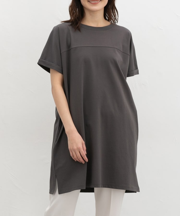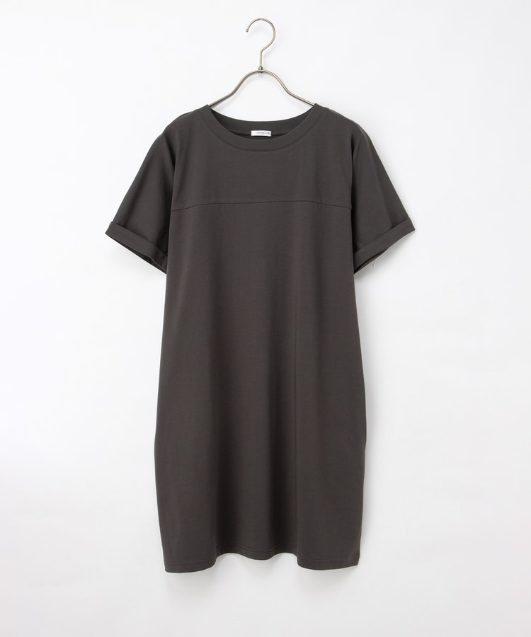 すとんとしたIラインシルエットのシンプルデザインに、胸元の切り替えがさりげないアクセント。