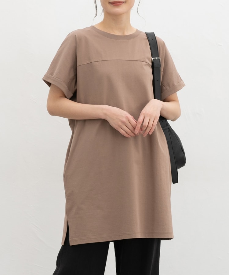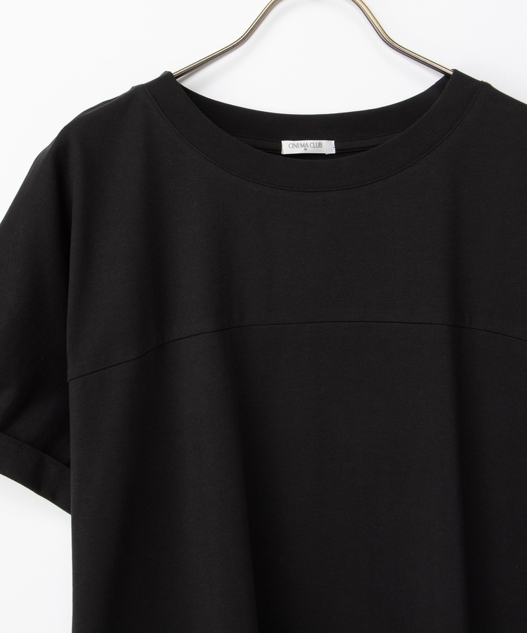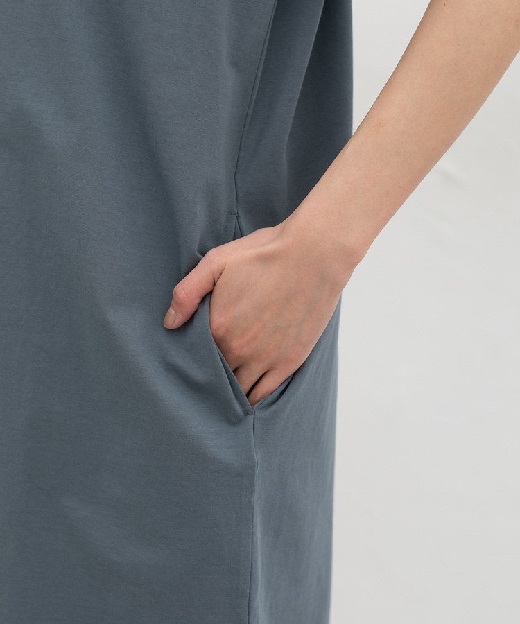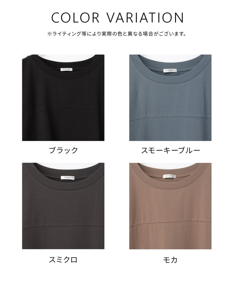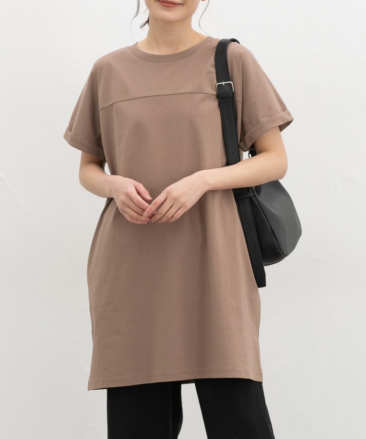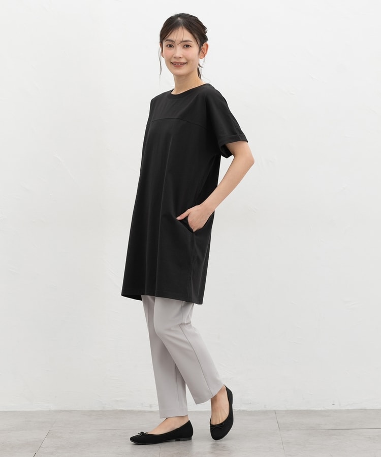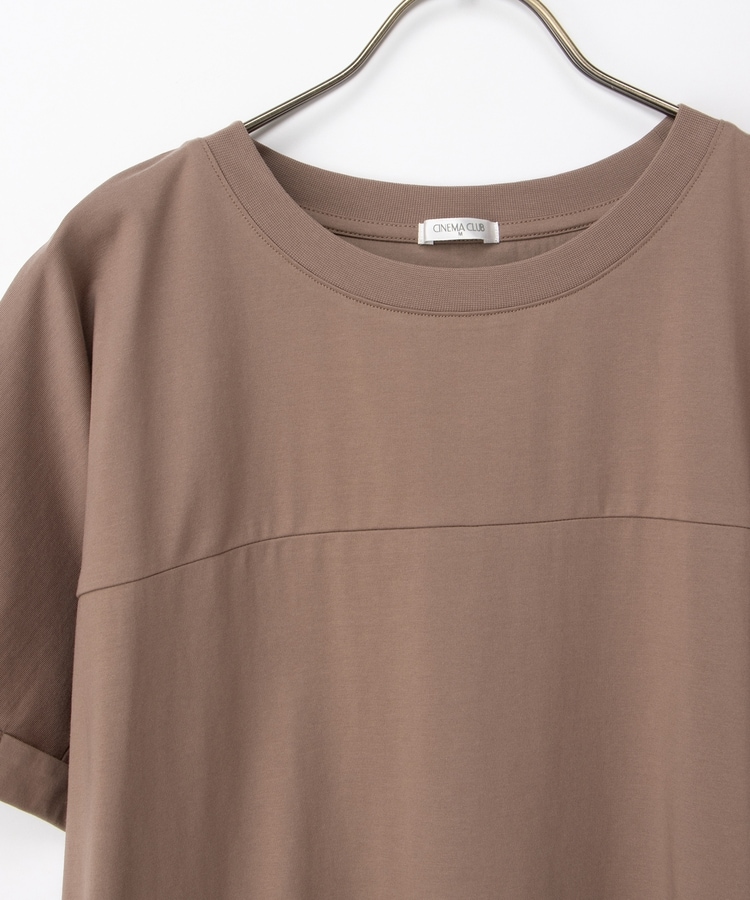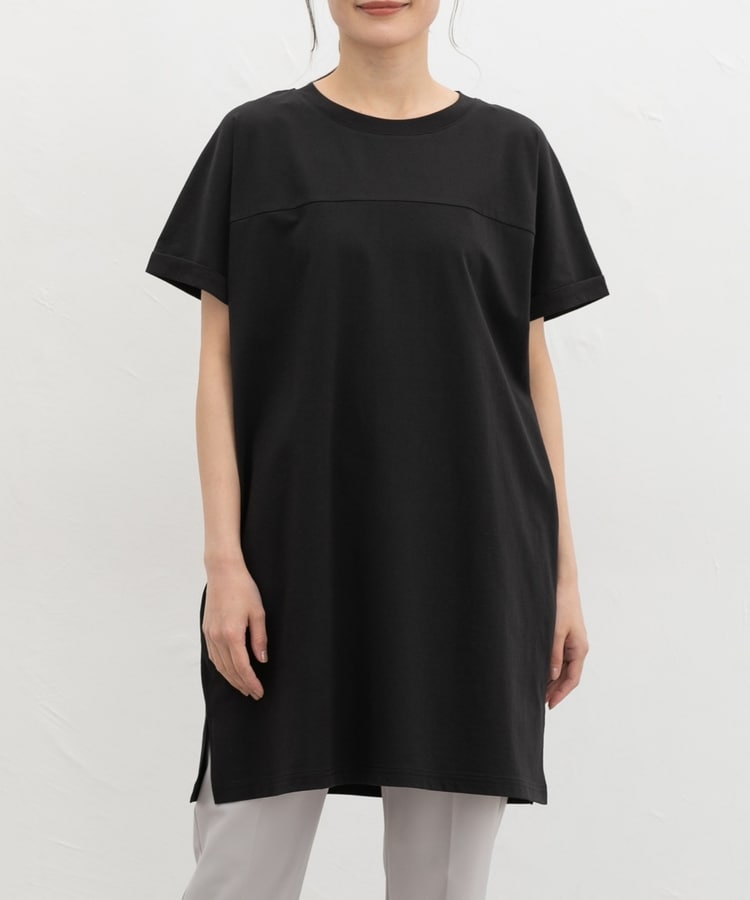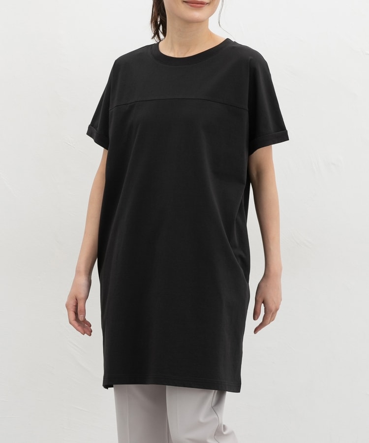 すとんとしたIラインシルエットのシンプルデザインに、胸元の切り替えがさりげないアクセント。