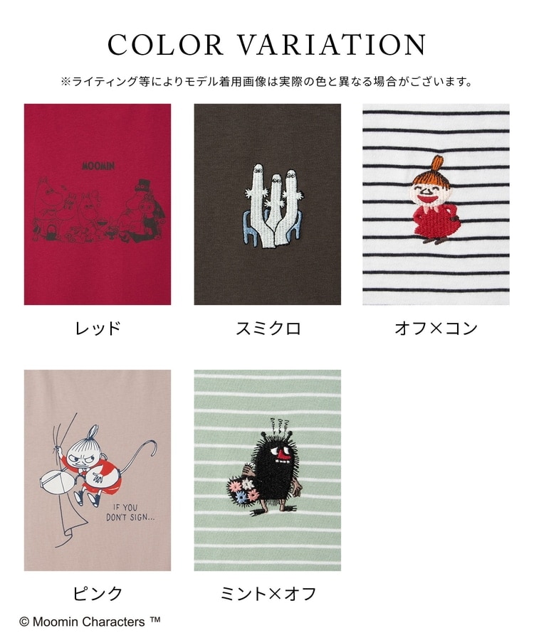 ムーミンと仲間たちのかわいい刺繍やプリントがおしゃれなデザイン。