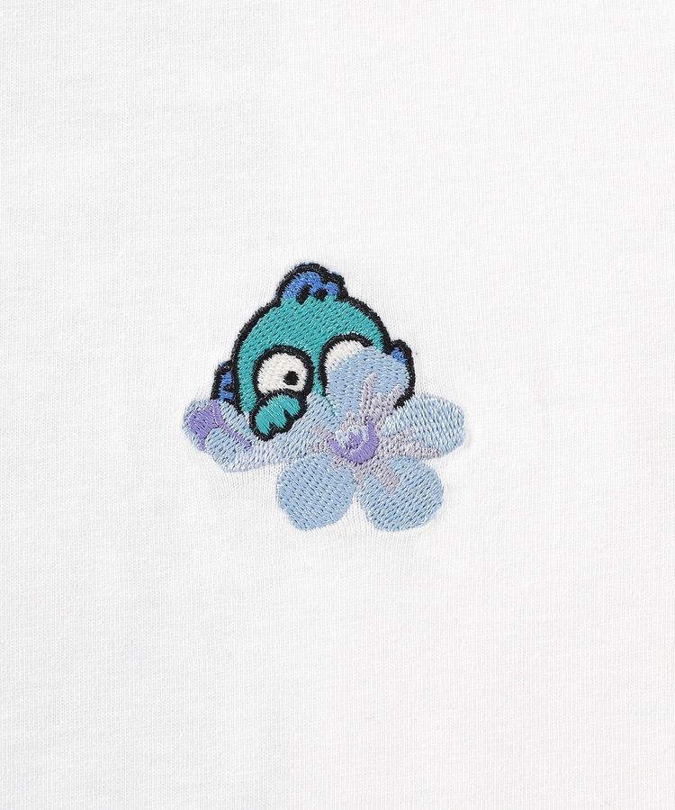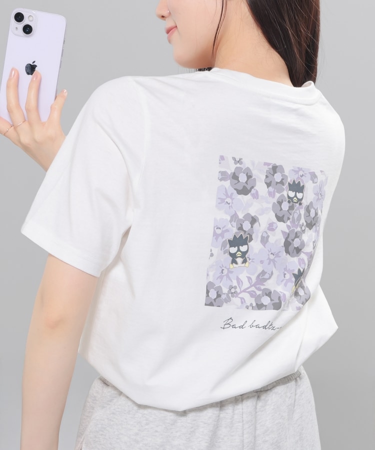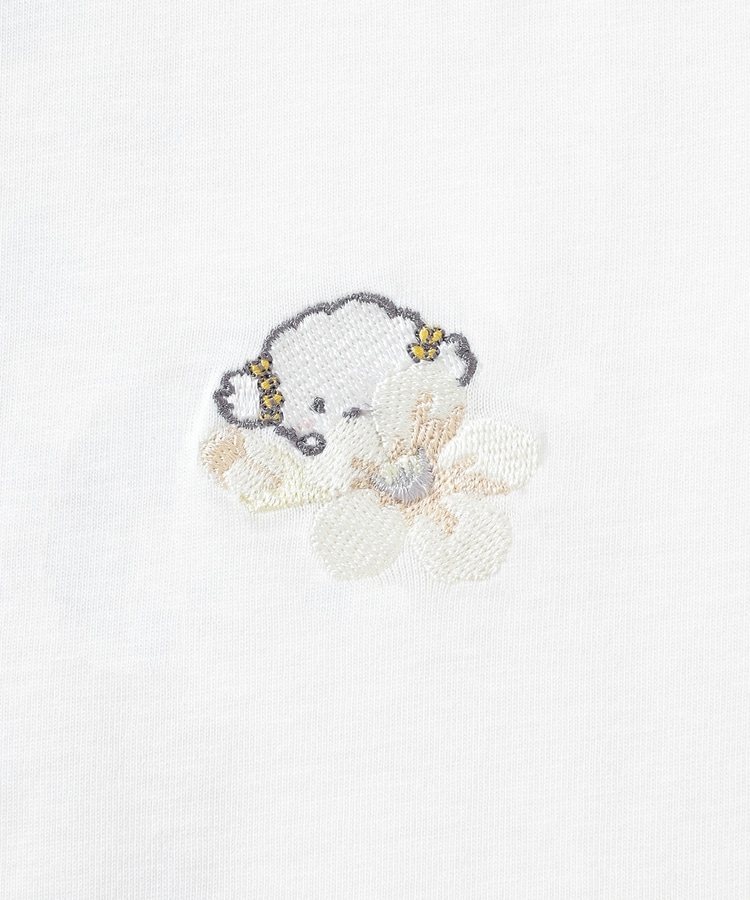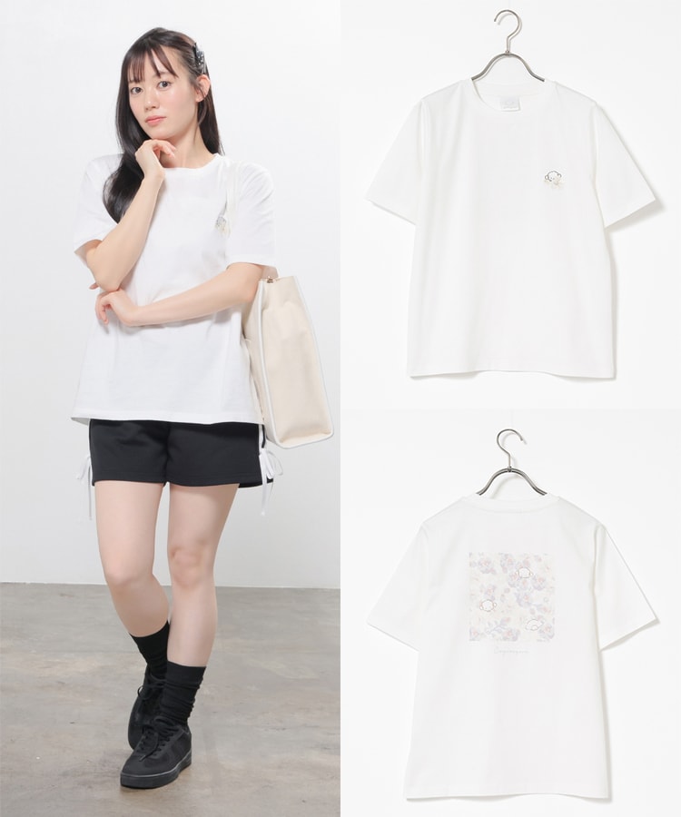 シンプルな白Tのフロントにはワンポイント刺繍、バックには水彩タッチのおしゃれな花柄プリント。