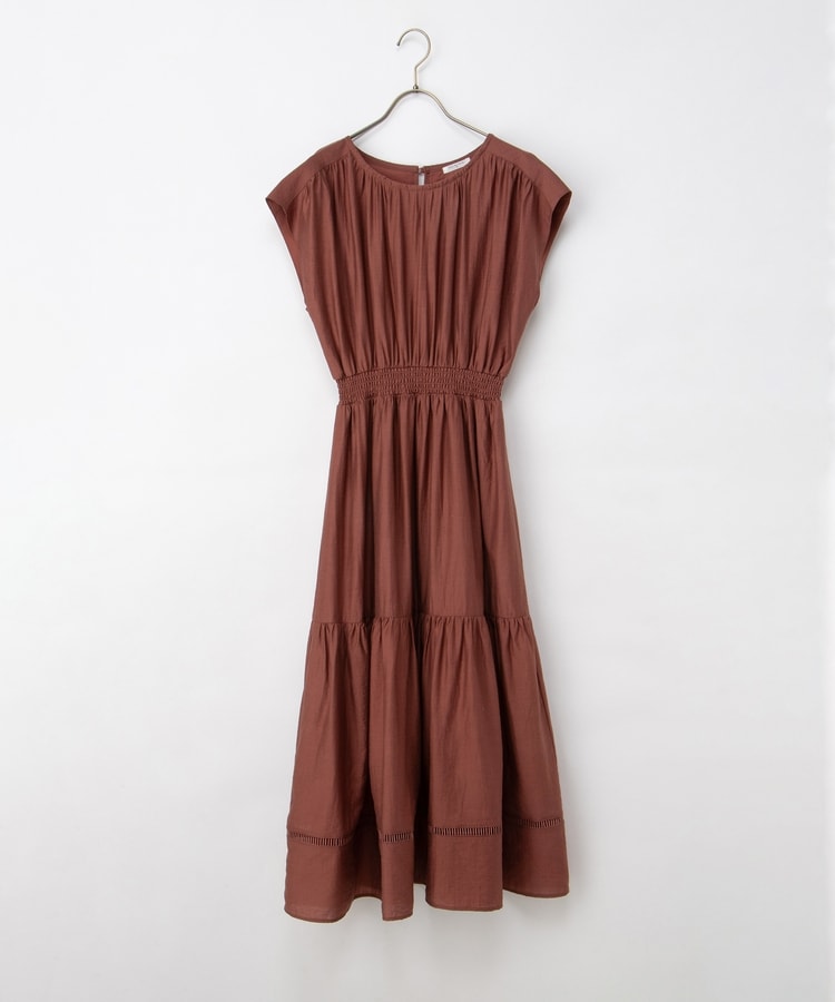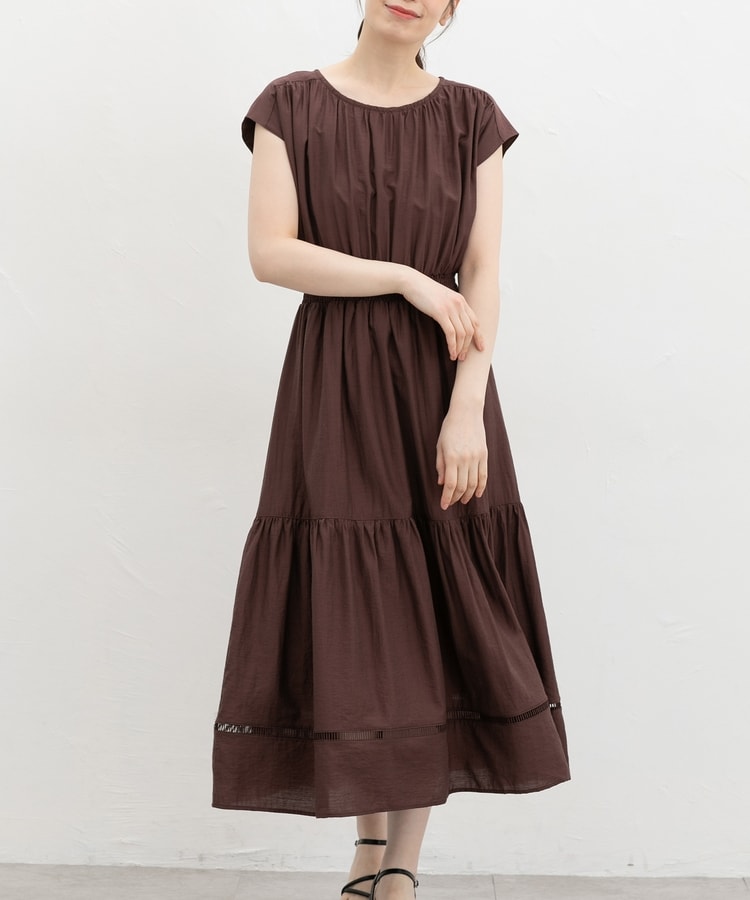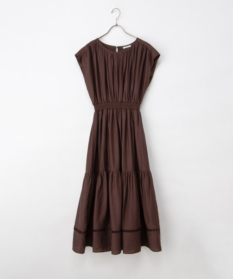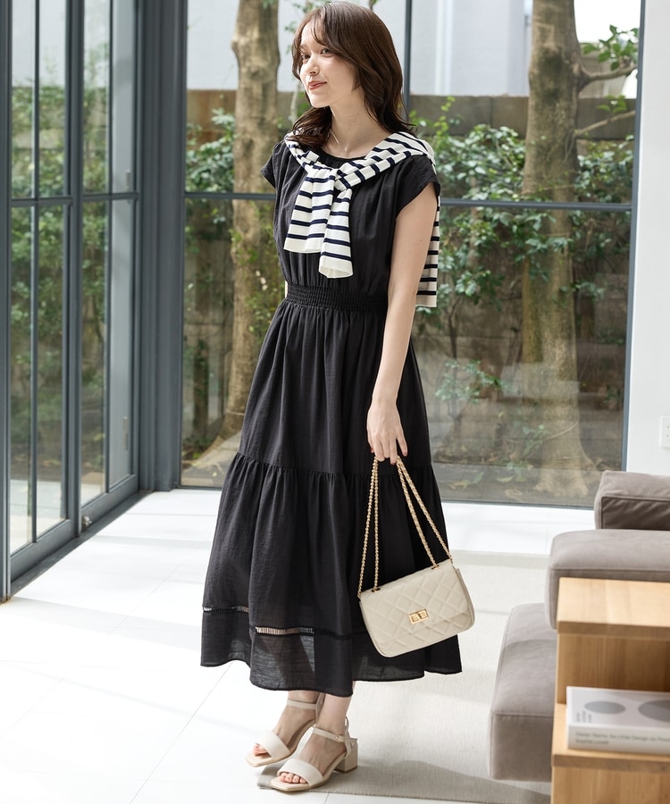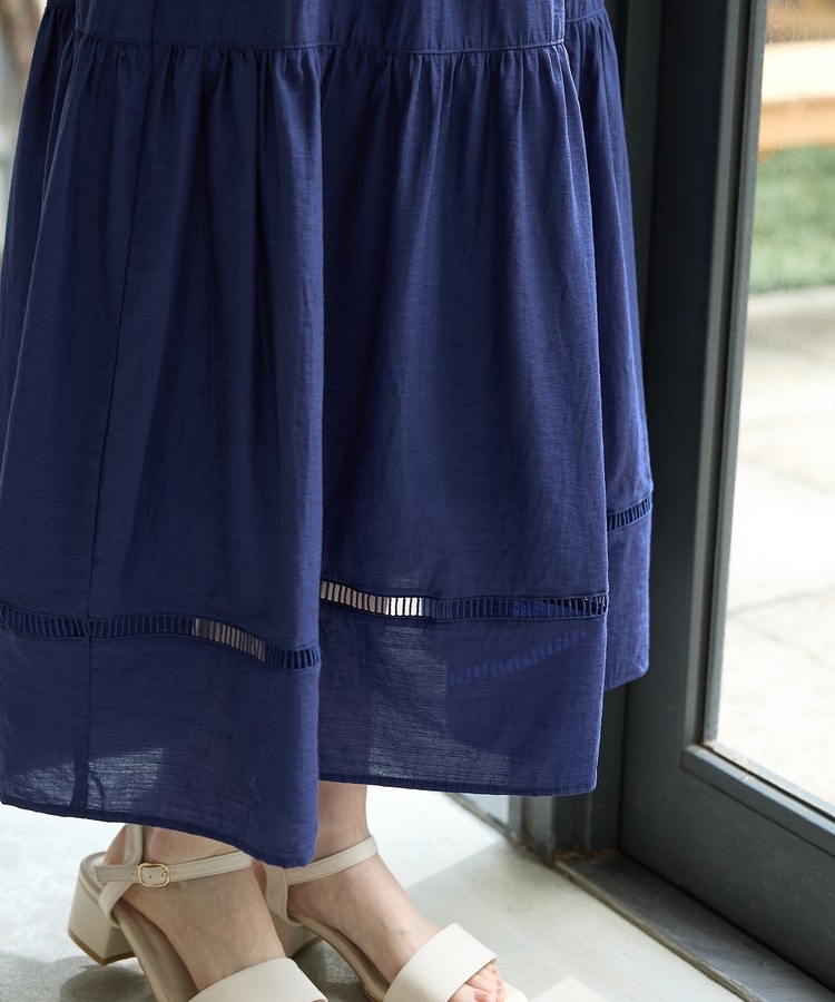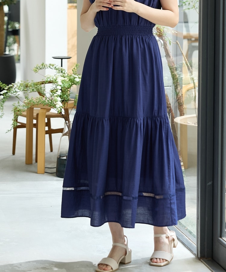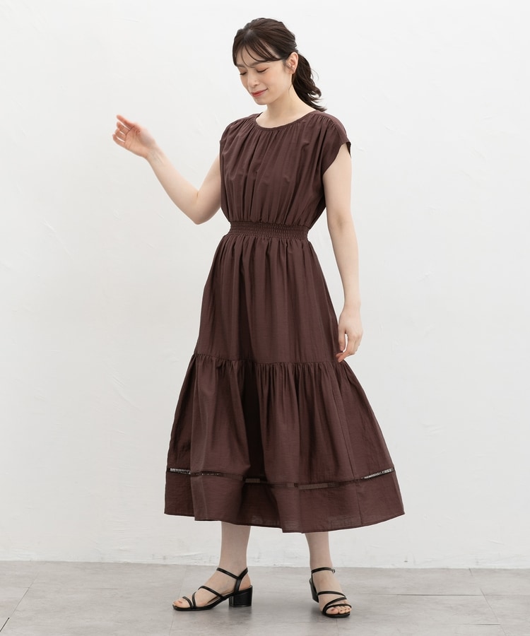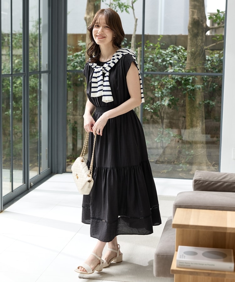 きゅっと絞ったウエストからふんわり広がる二段ティアードのメリハリシルエットと、裾のはしごレースで、フェミニンで上品な雰囲気を演出。