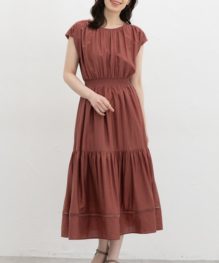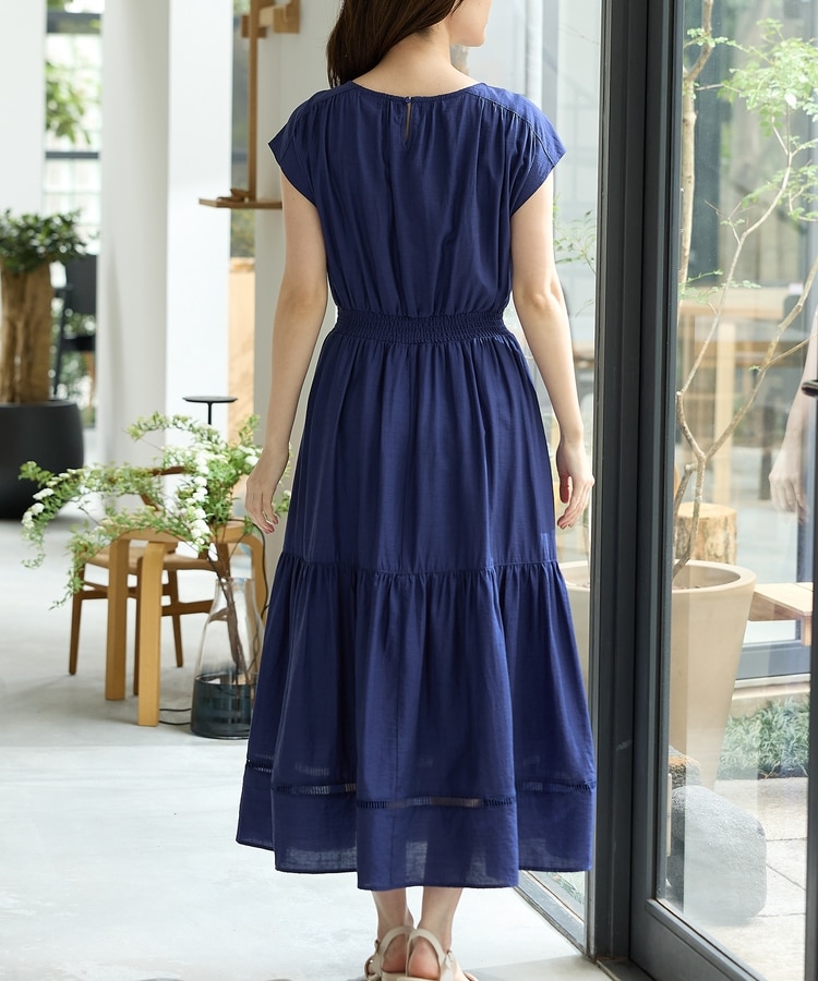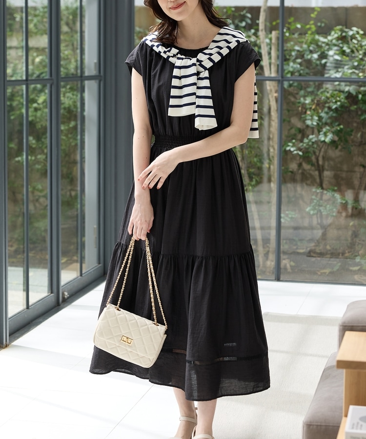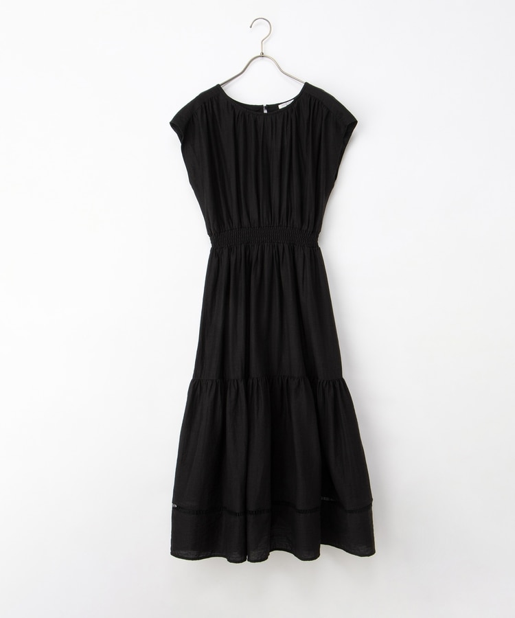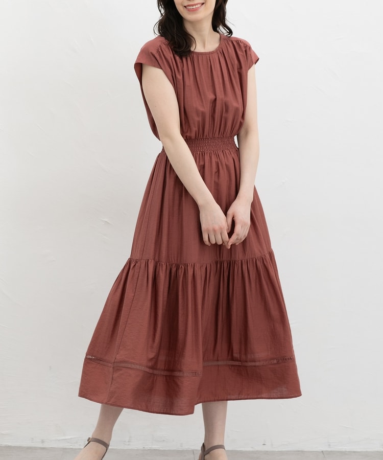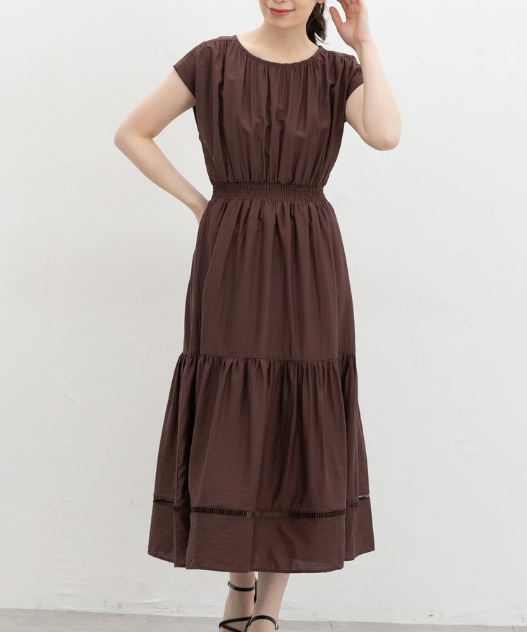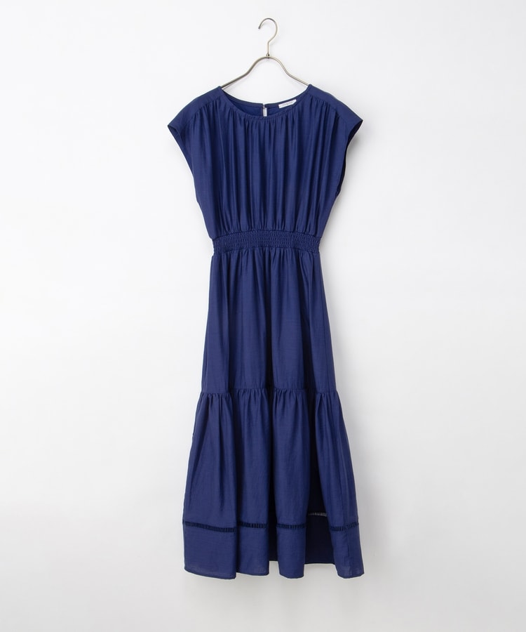 きゅっと絞ったウエストからふんわり広がる二段ティアードのメリハリシルエットと、裾のはしごレースで、フェミニンで上品な雰囲気を演出。
