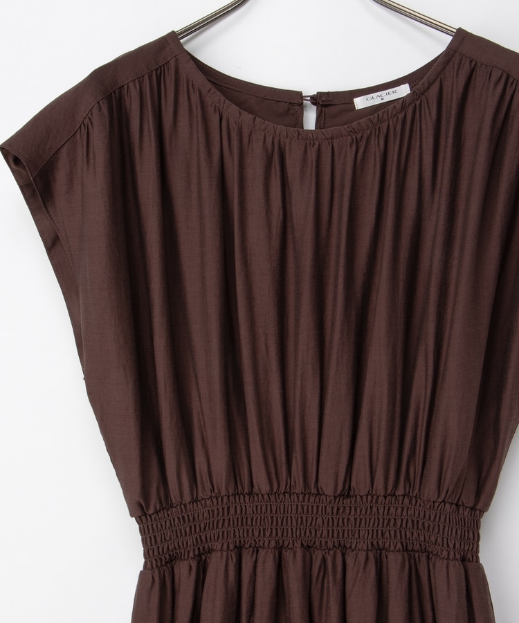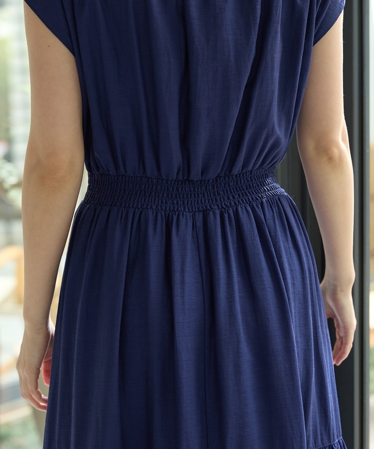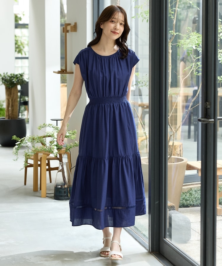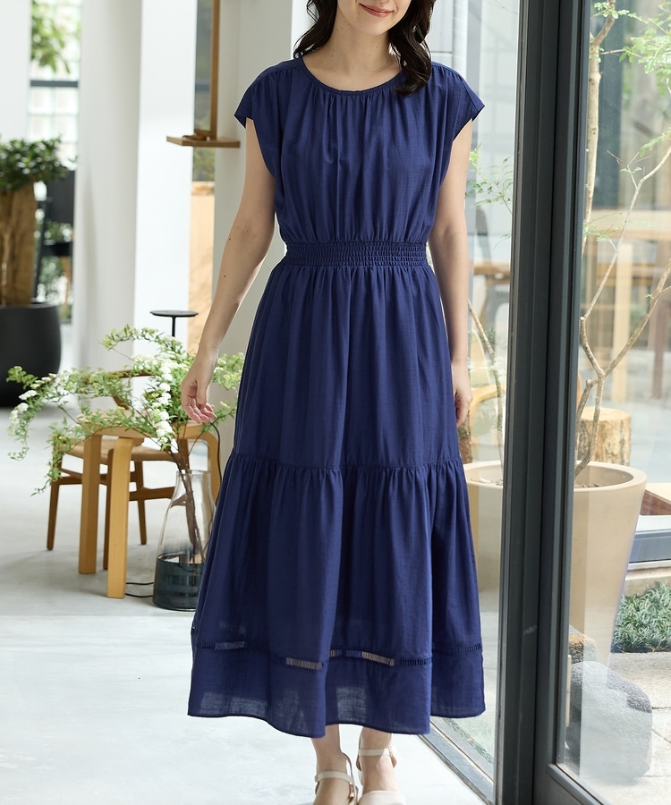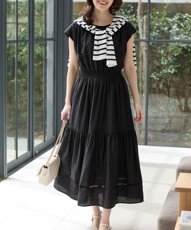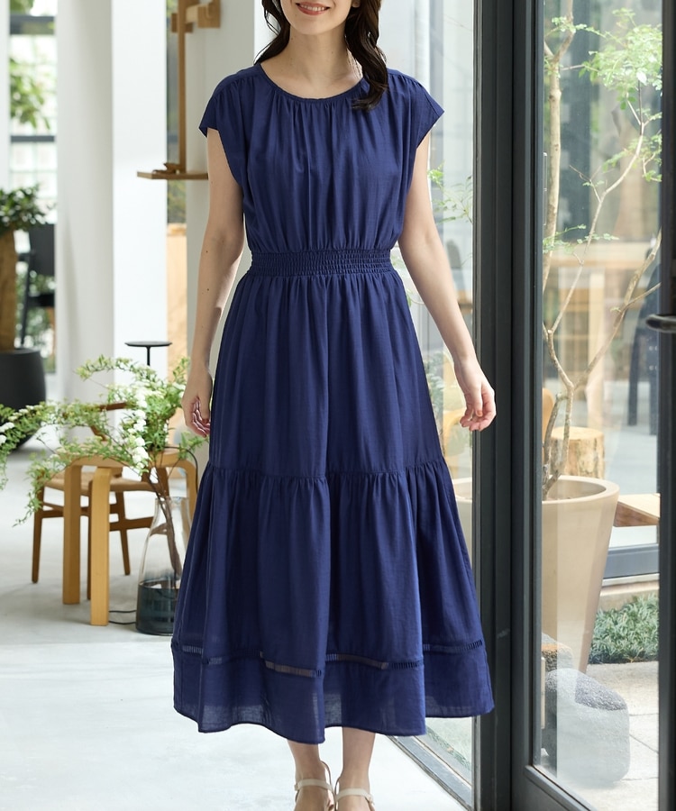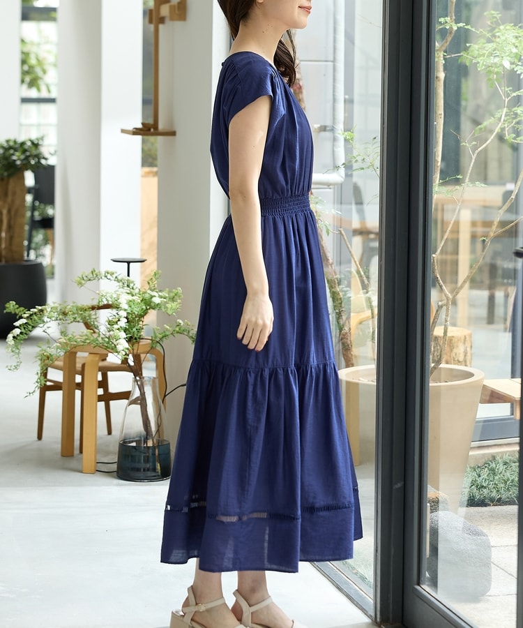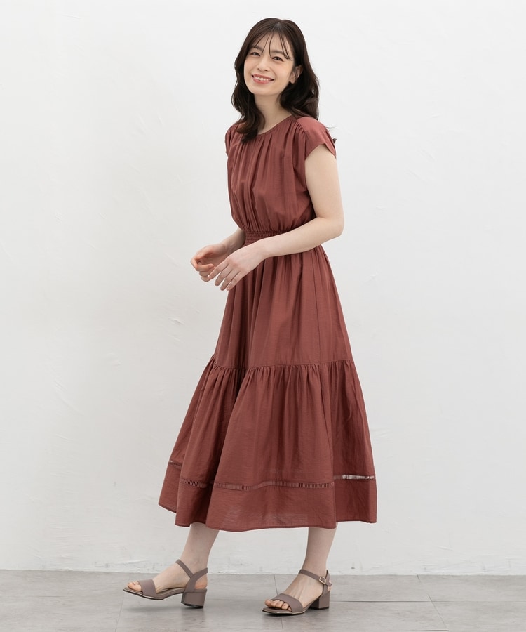 きゅっと絞ったウエストからふんわり広がる二段ティアードのメリハリシルエットと、裾のはしごレースで、フェミニンで上品な雰囲気を演出。
