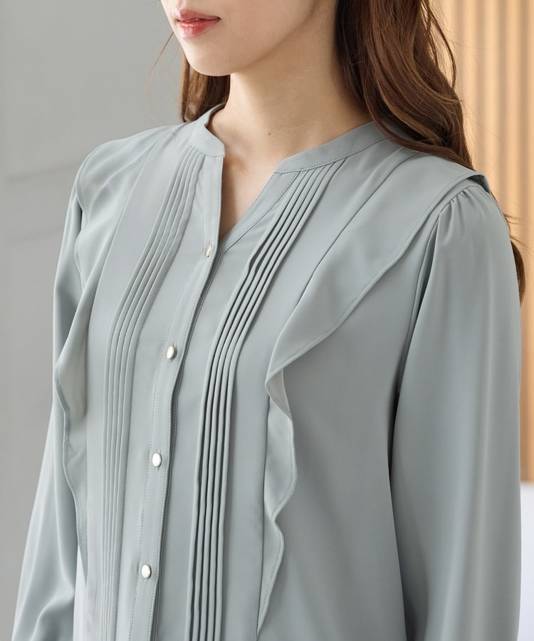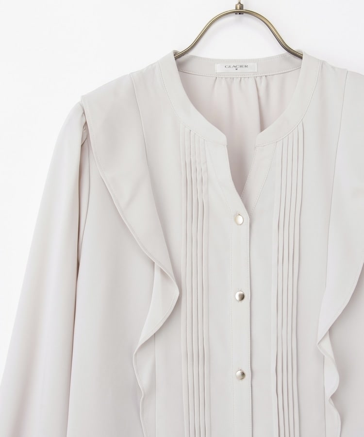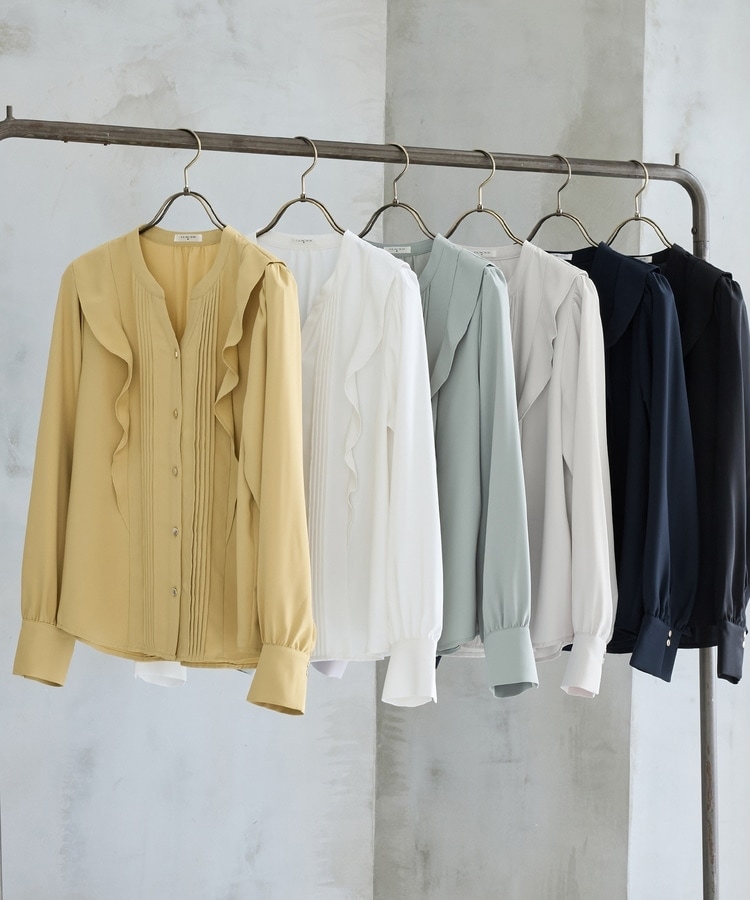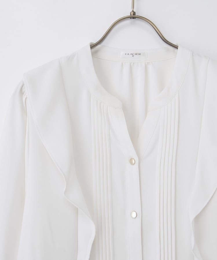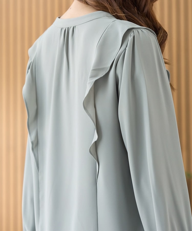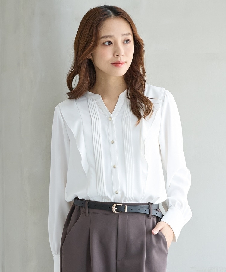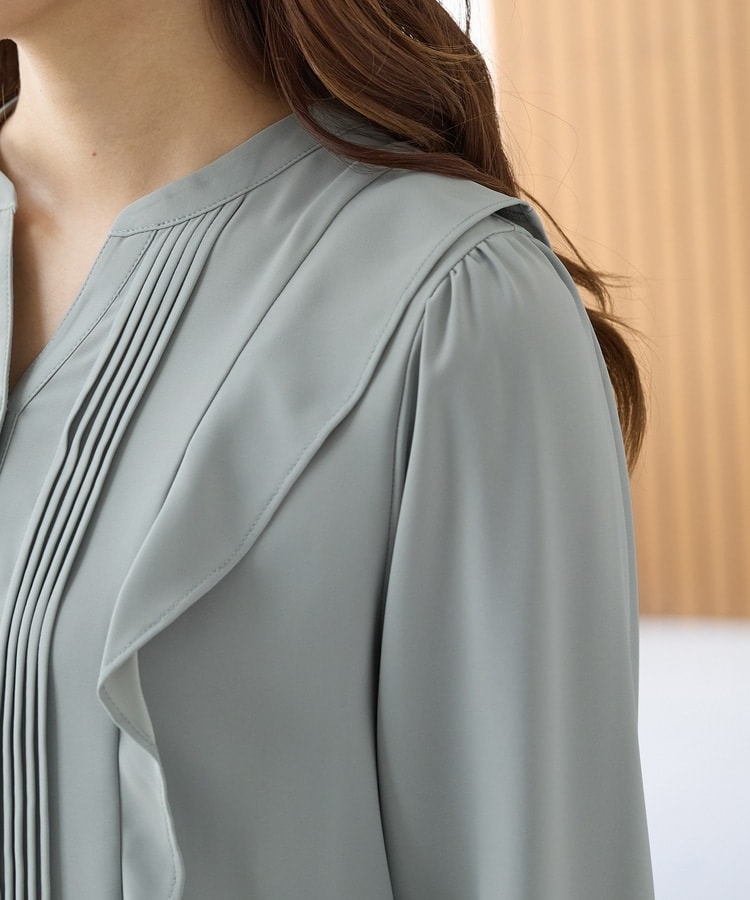 お仕事でも使える控えめなボリュームのフリルながら、顔回りを華やかに演出し、フェミニンな印象に。