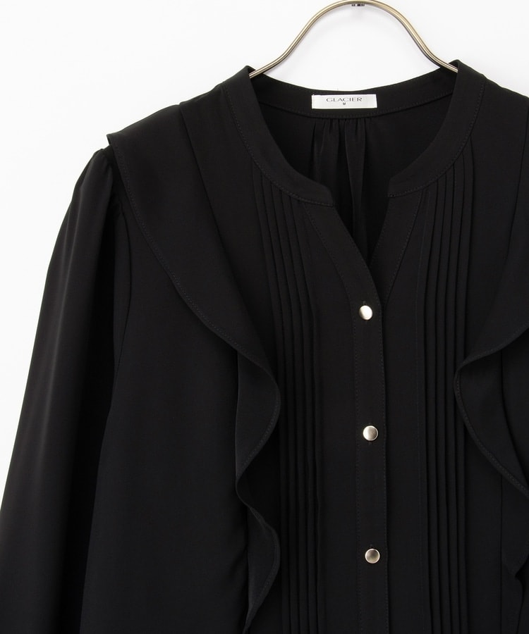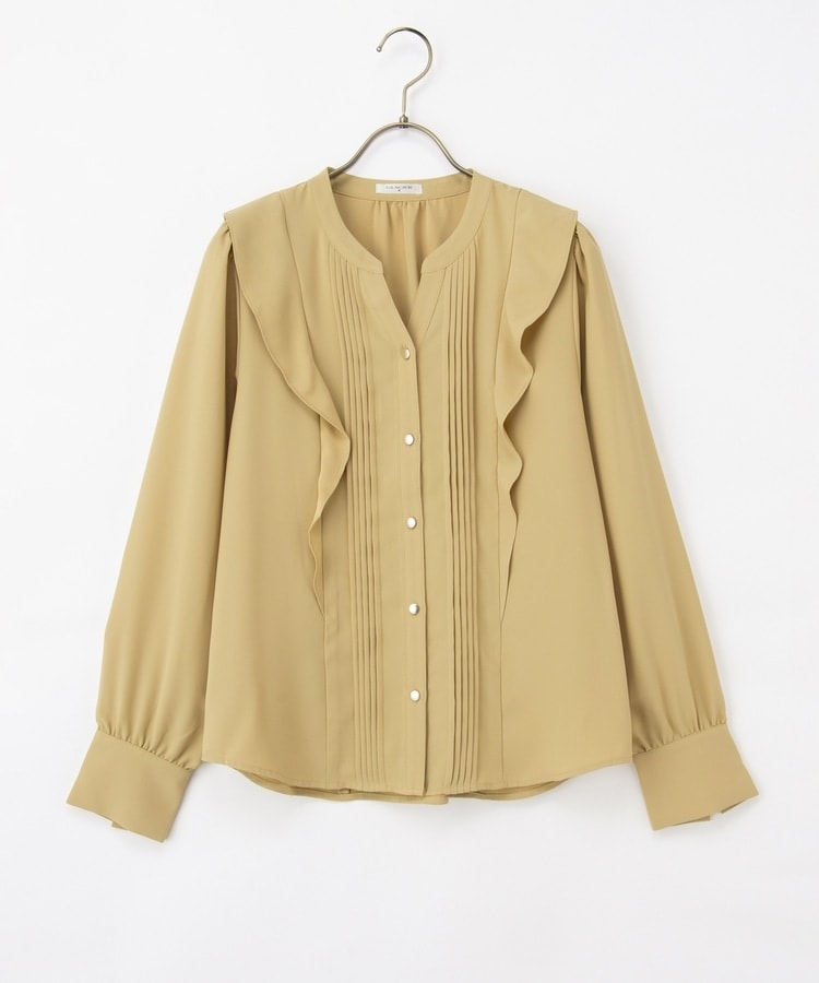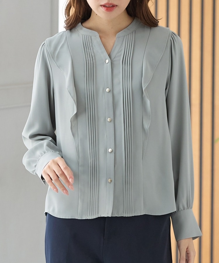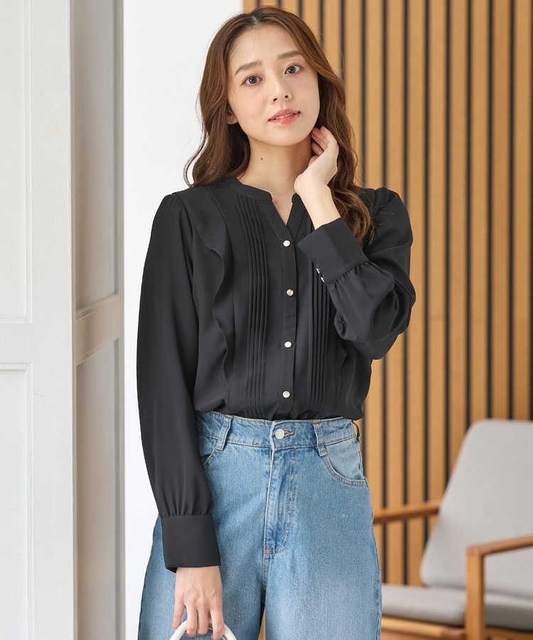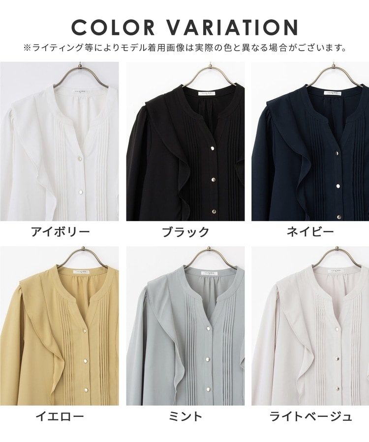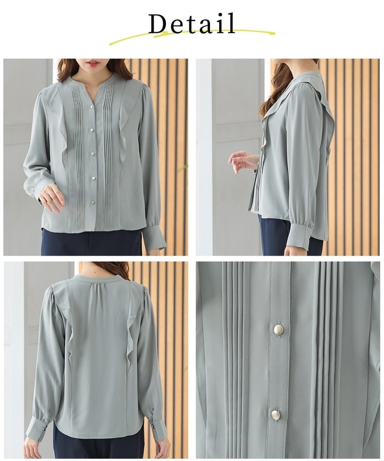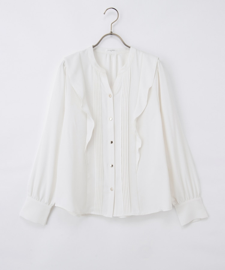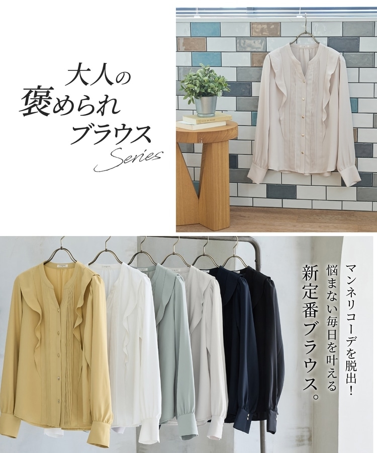 お仕事でも使える控えめなボリュームのフリルながら、顔回りを華やかに演出し、フェミニンな印象に。