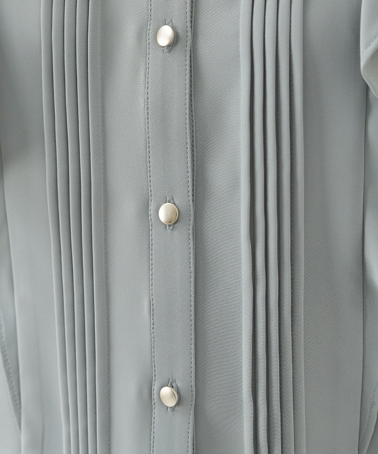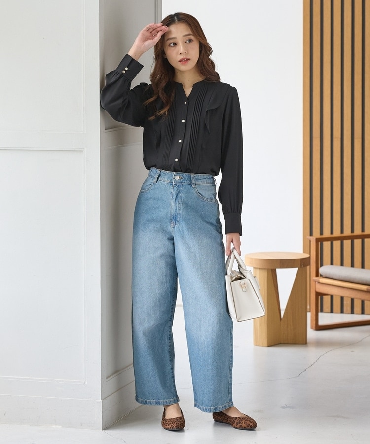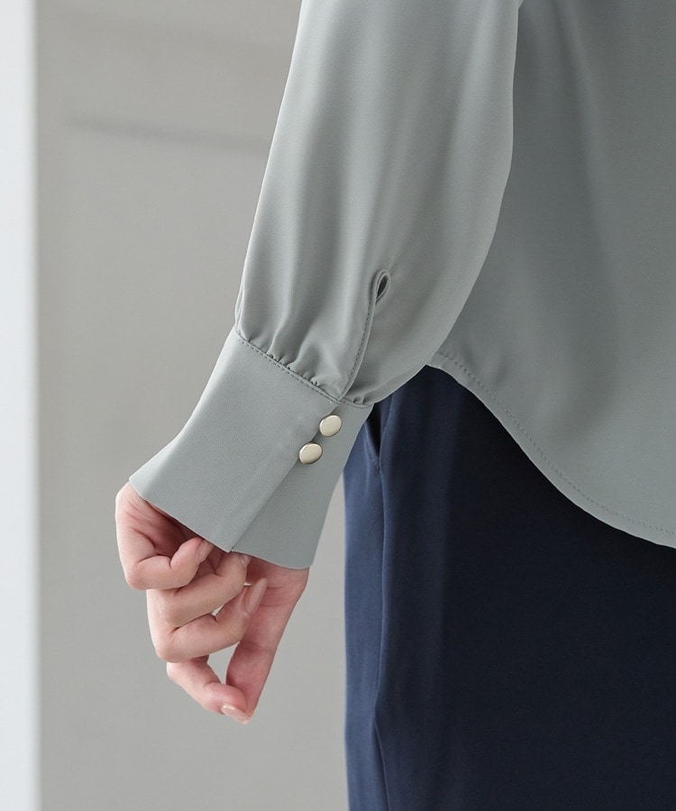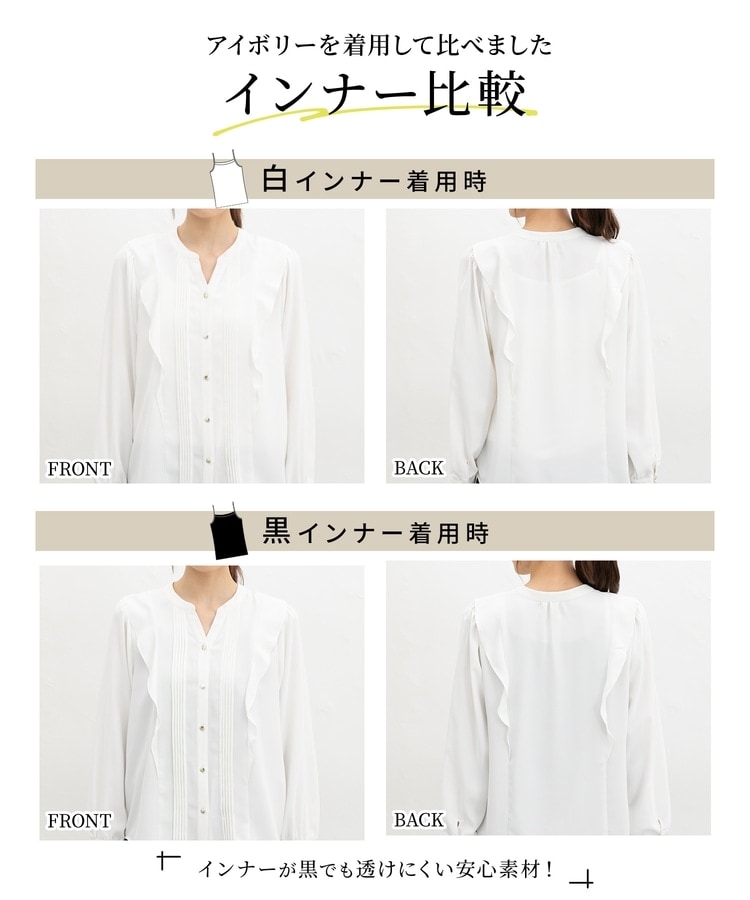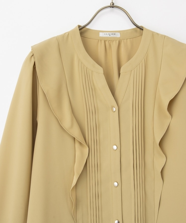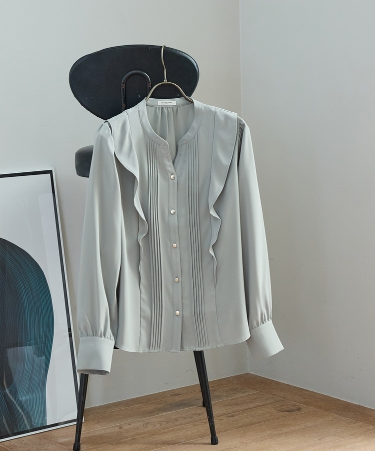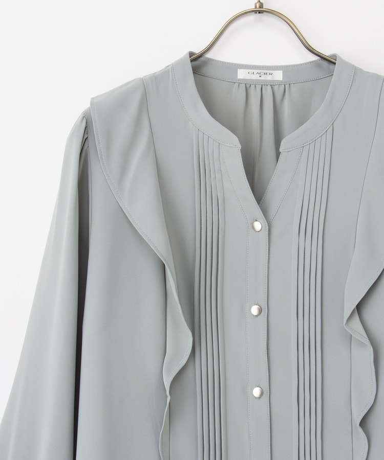 お仕事でも使える控えめなボリュームのフリルながら、顔回りを華やかに演出し、フェミニンな印象に。