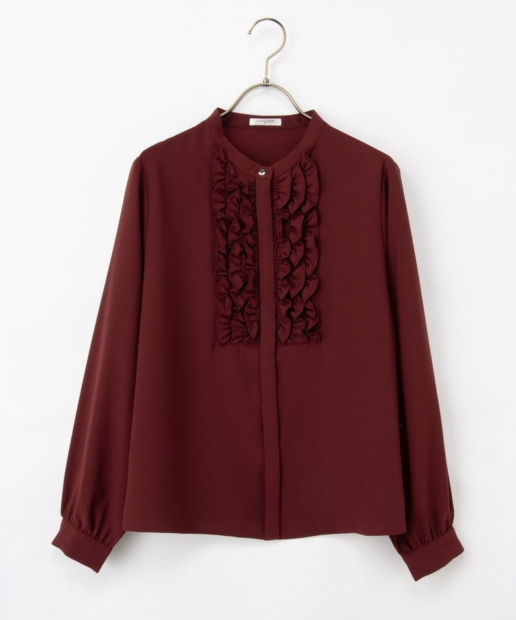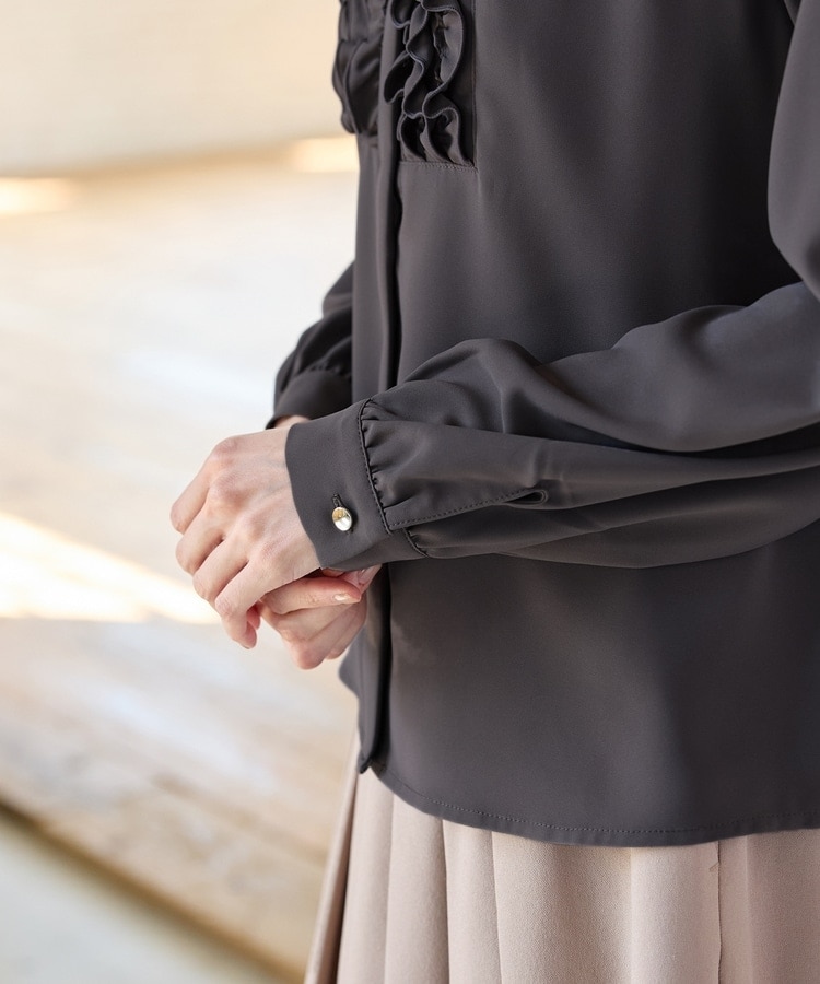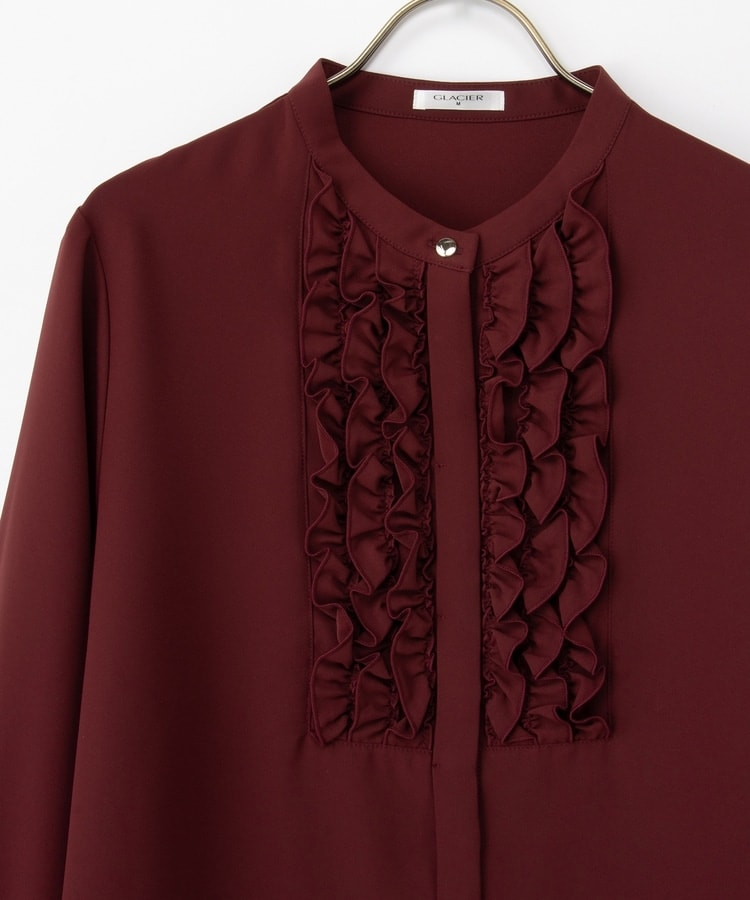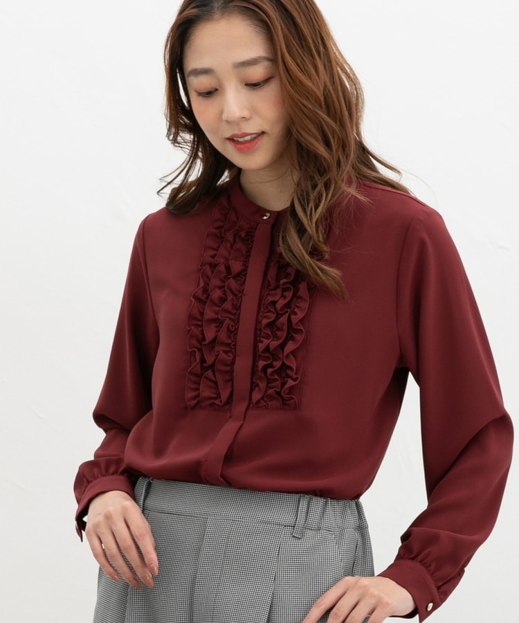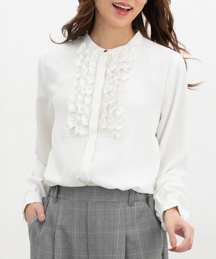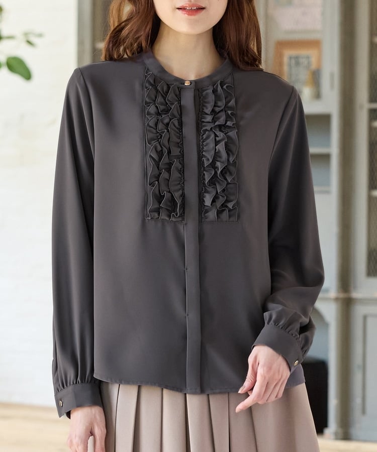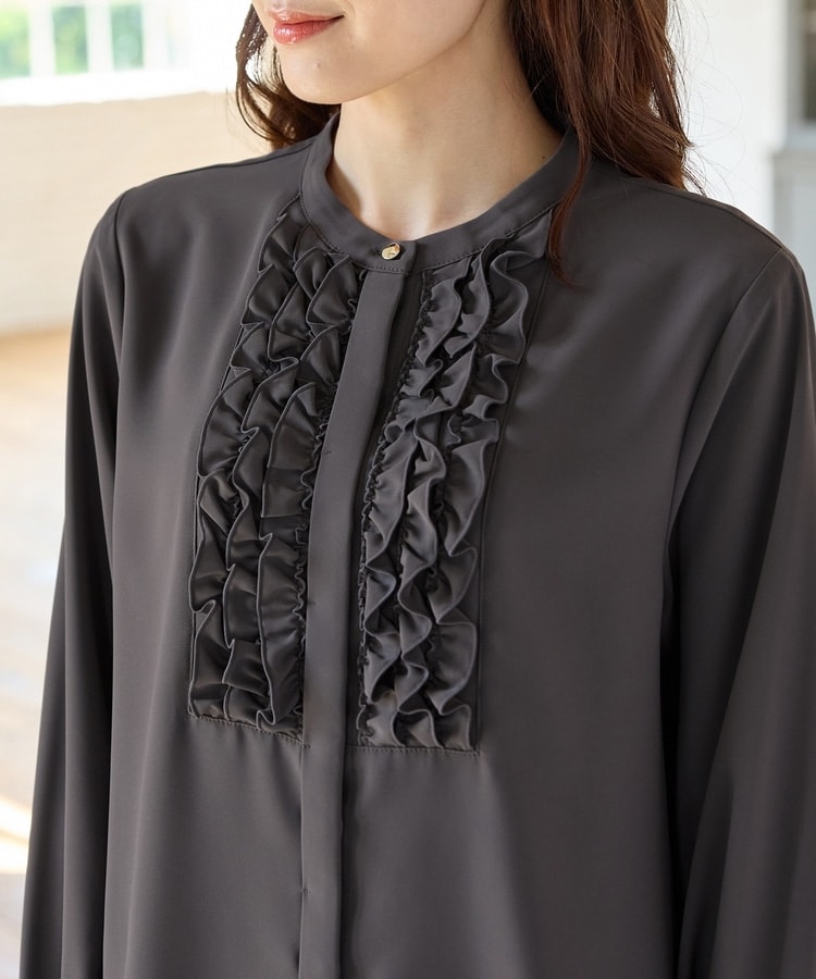 フロントのフリル使いが華やかな大人可愛いデザインに、バンドカラーできちんと感をプラス。