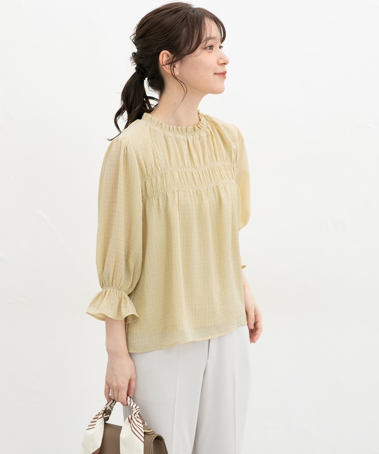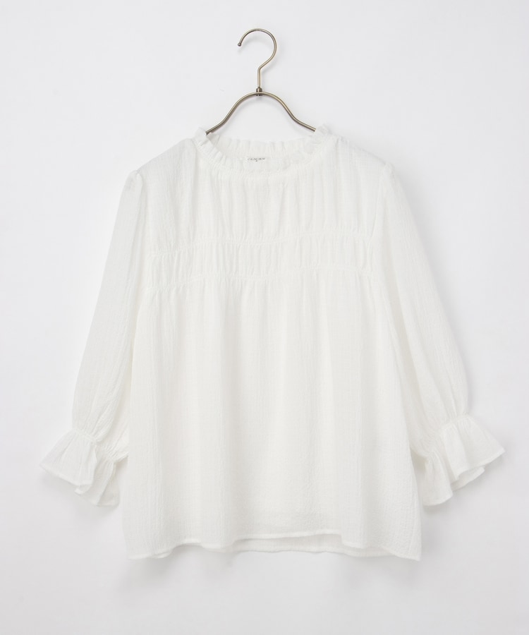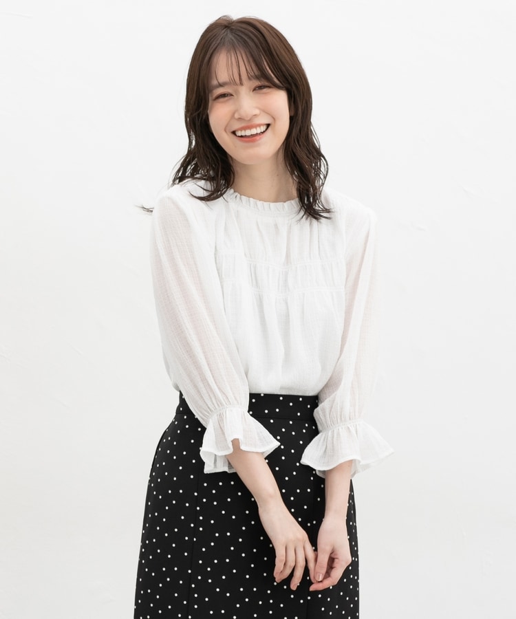 衿ぐりと袖口のゴムシャーリングが作る細かなギャザーが上品でフェミニンなデザイン。