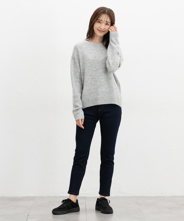 ゆったりめの幅と、フロントラウンドの前後差ヘムで腰回りが隠れる丈感。