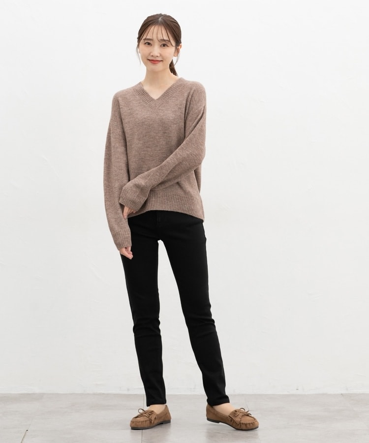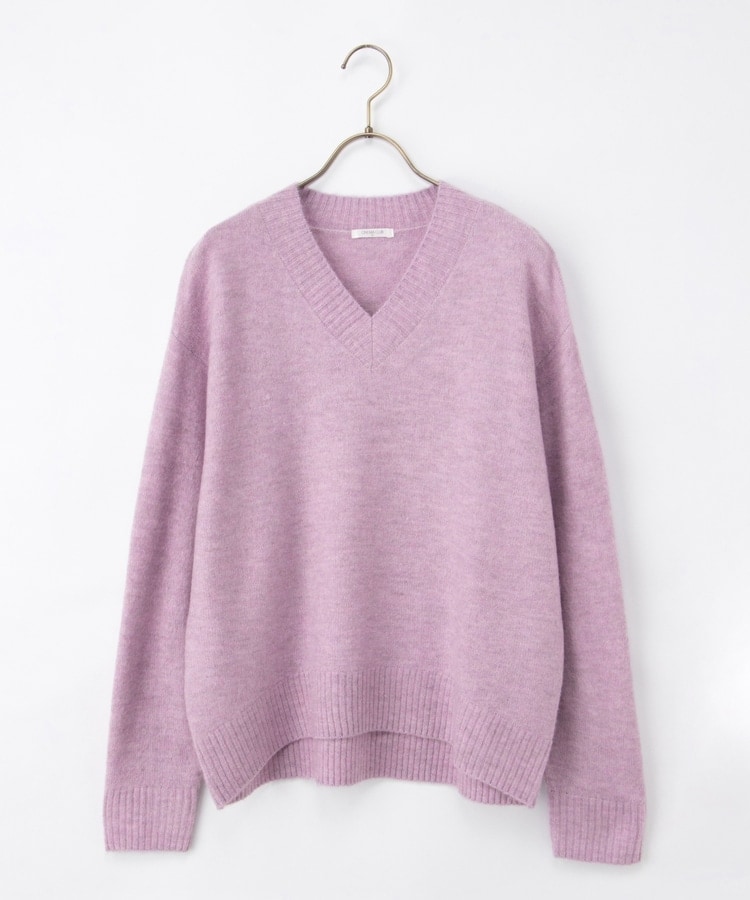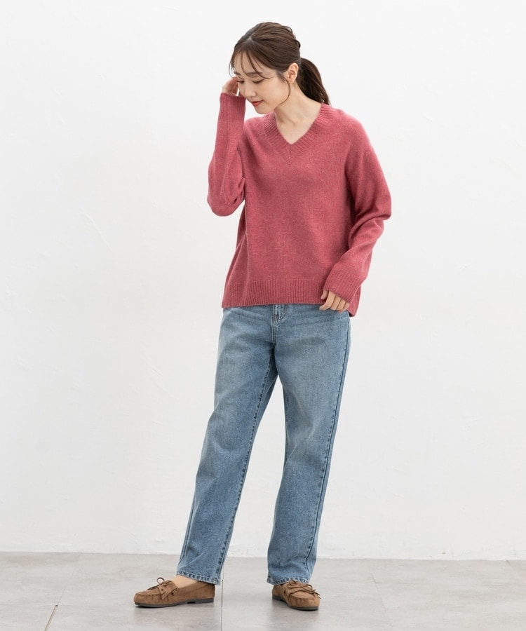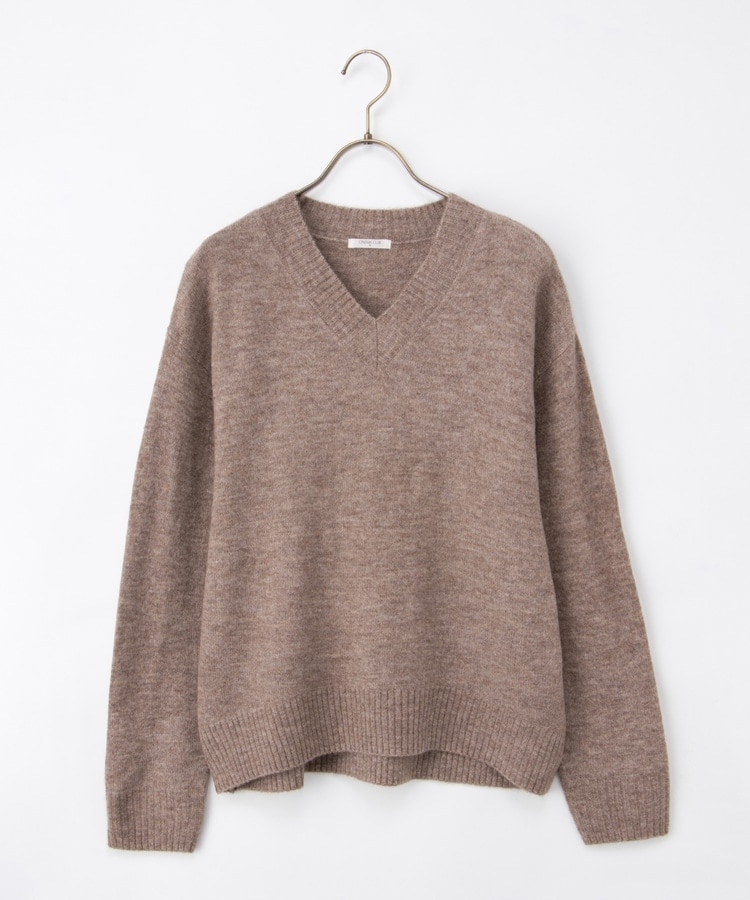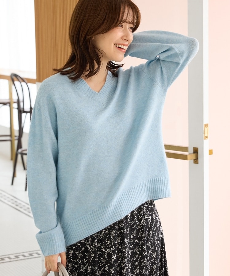 首元がすっきりきれいに見えるVネックのシンプルデザイン。