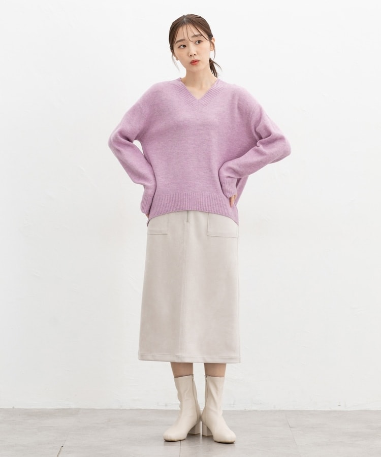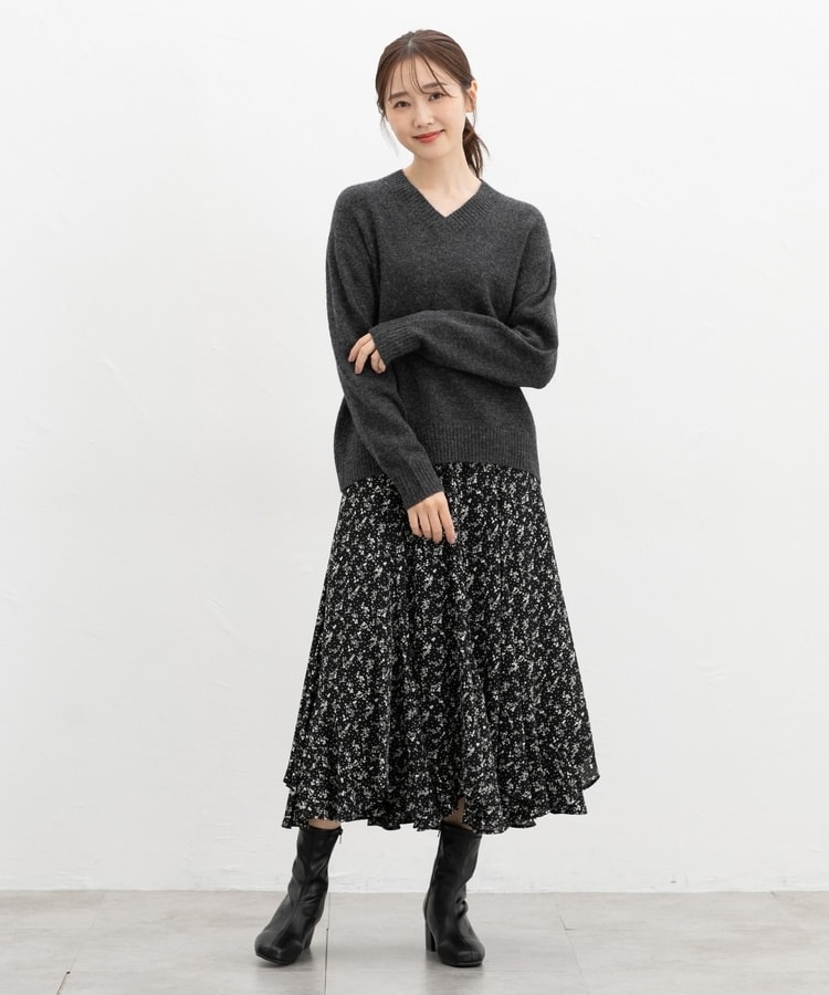 同系色でまとめるのはもちろん、柄物のボトムスとも相性抜群。