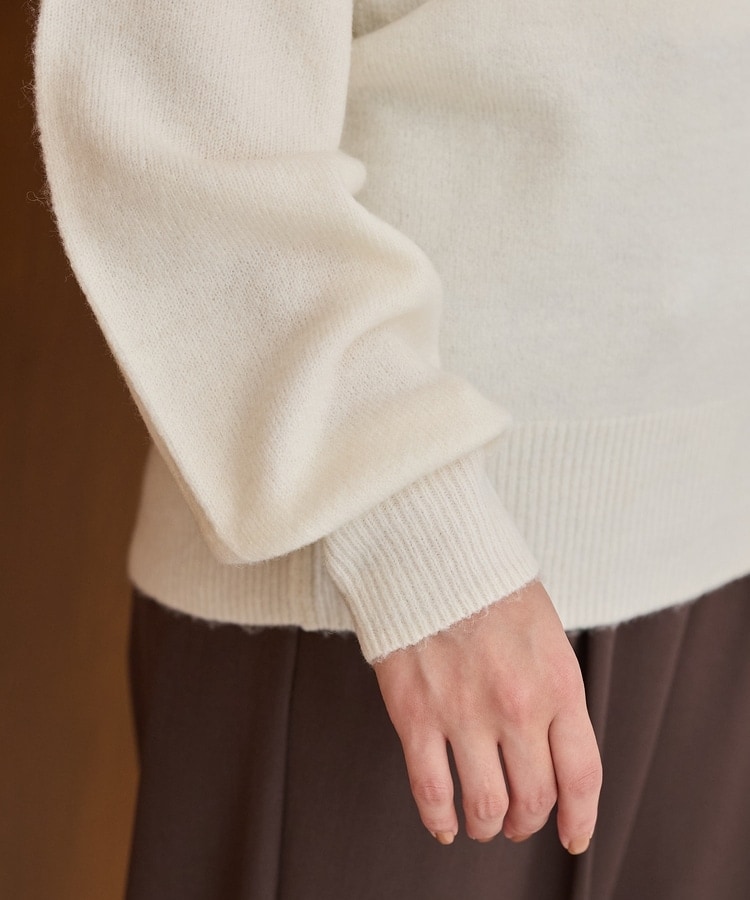 環境に優しい再生ポリエステルを使用した、ふわふわで軽く包み込まれるようなやわらかさのウール混『軽ふわっニット』素材。