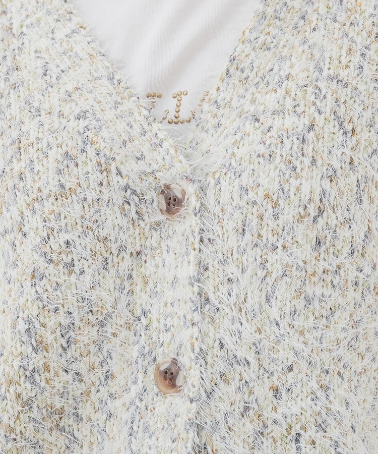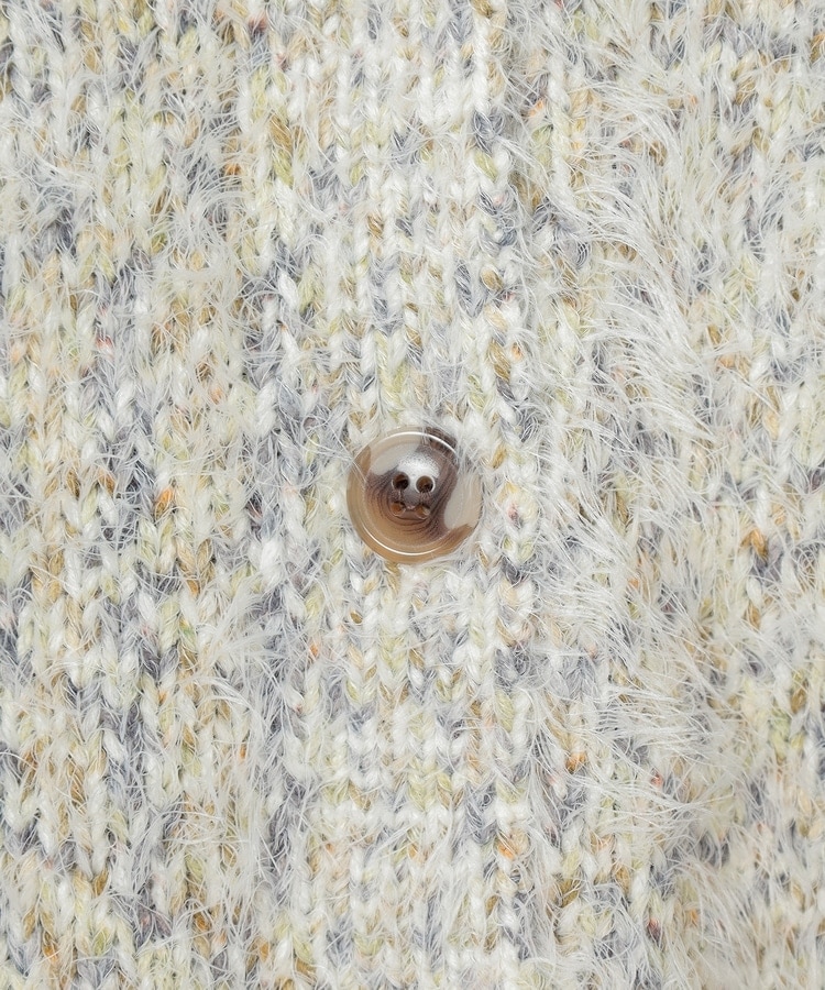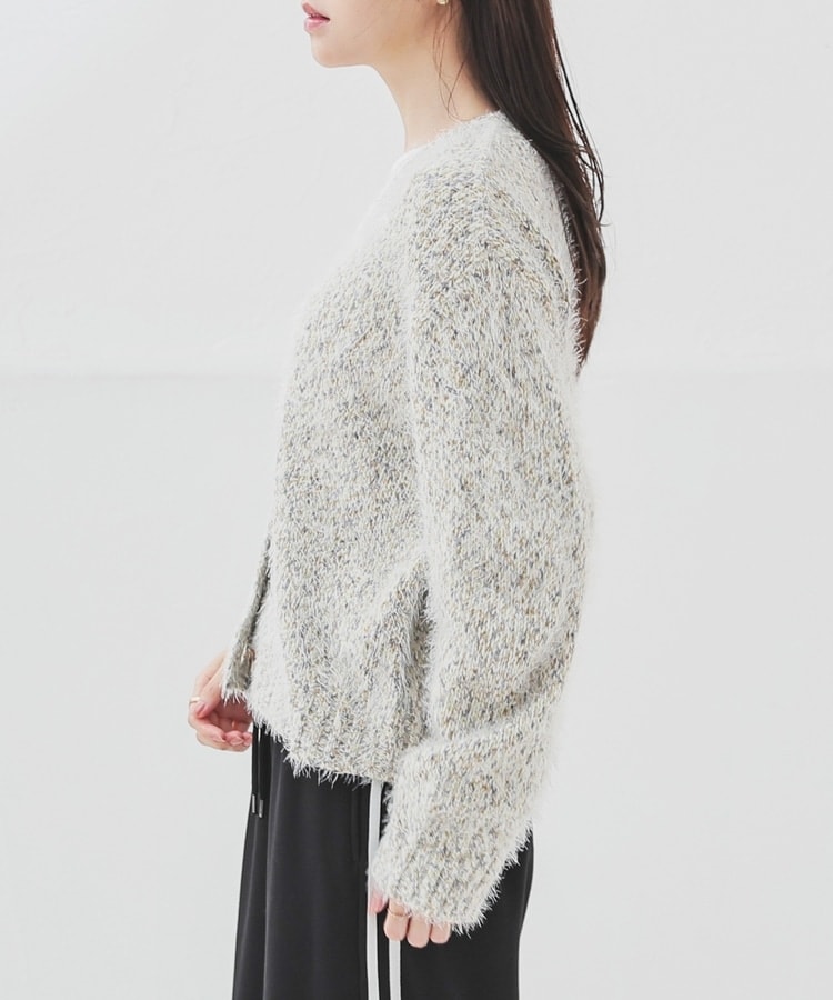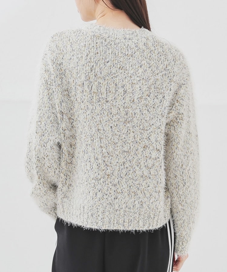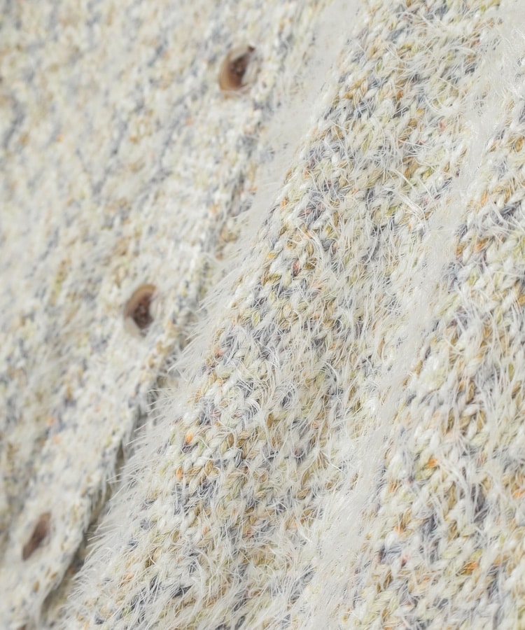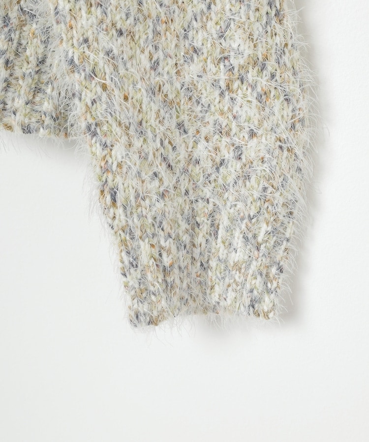 毛足が長めで柔らかくふわふわなフェザーヤーンと、ポコポコとした糸を使用したニット素材。