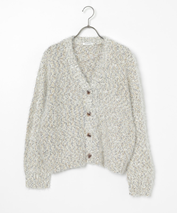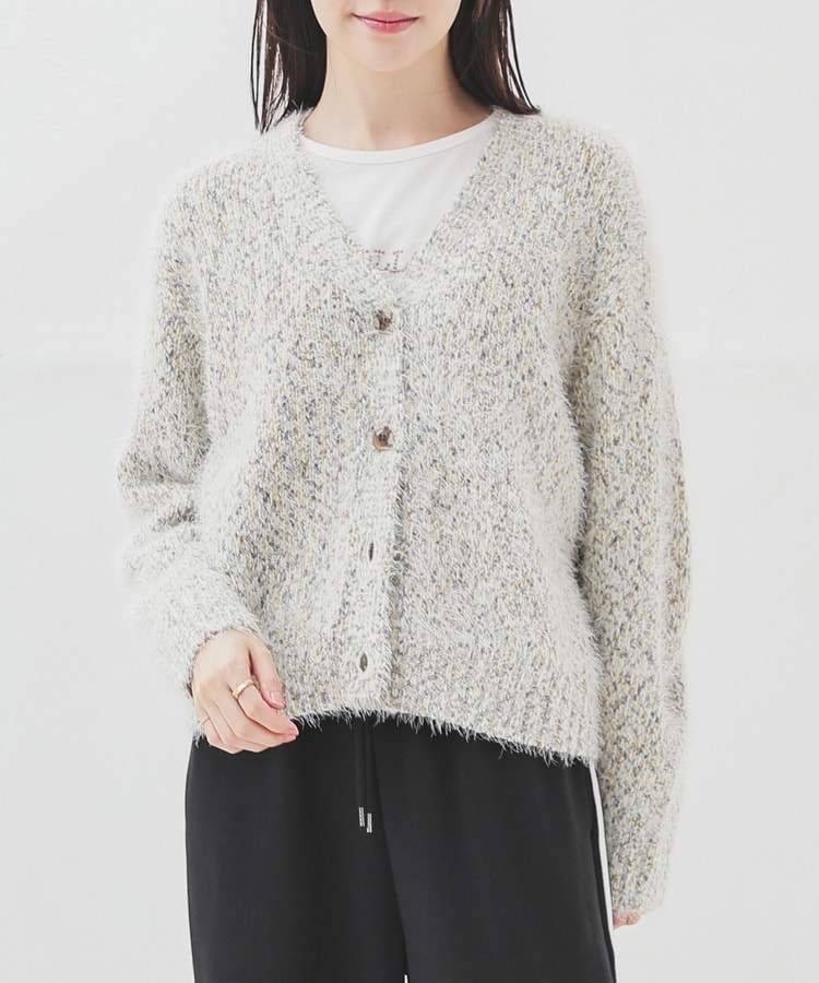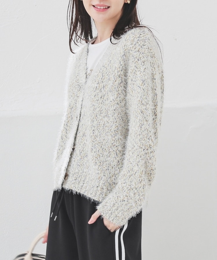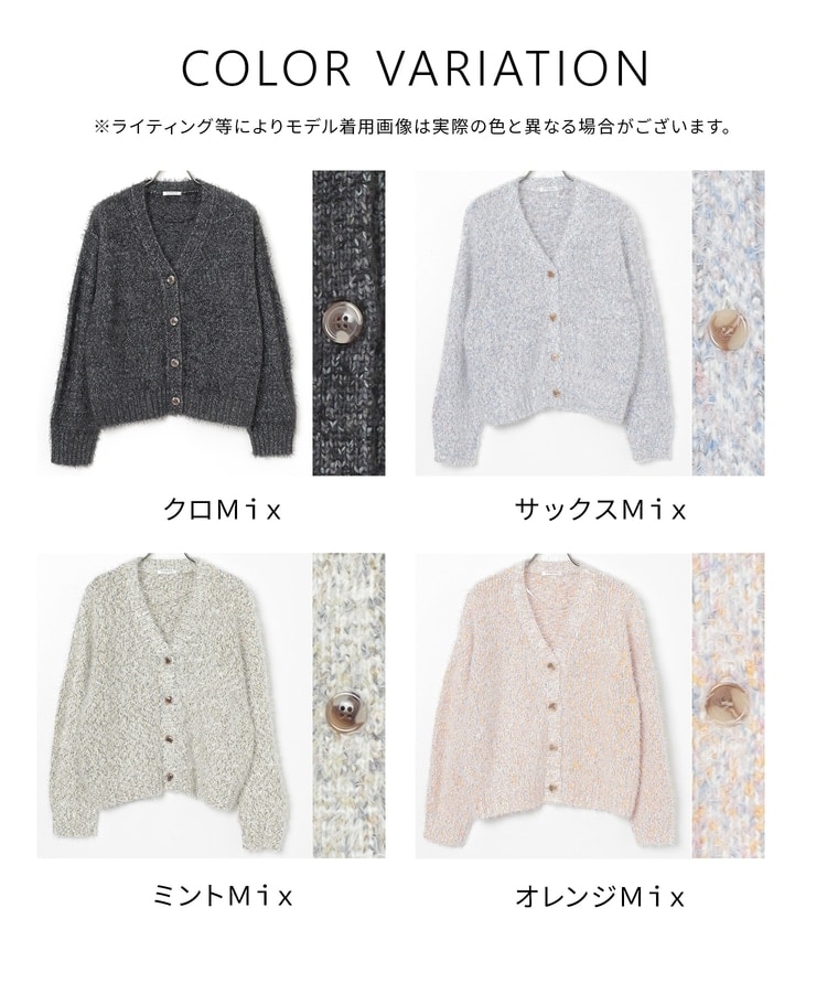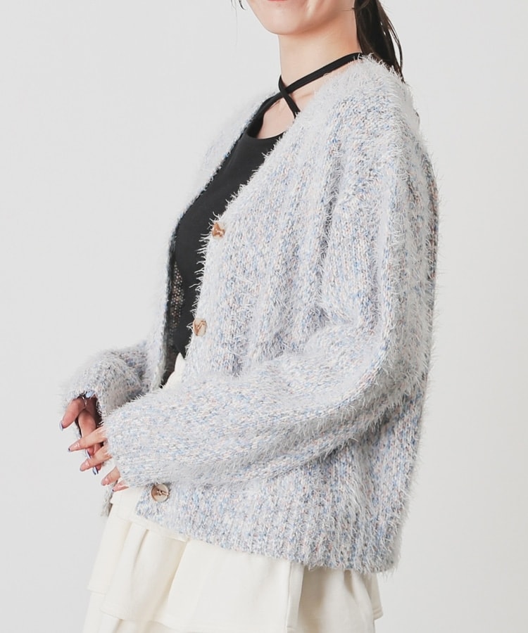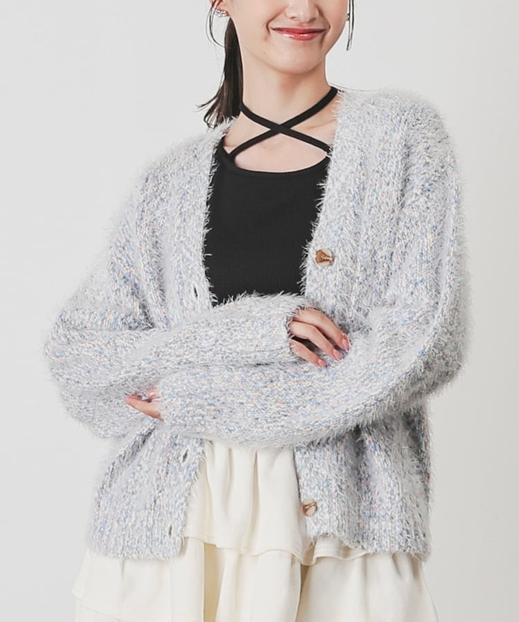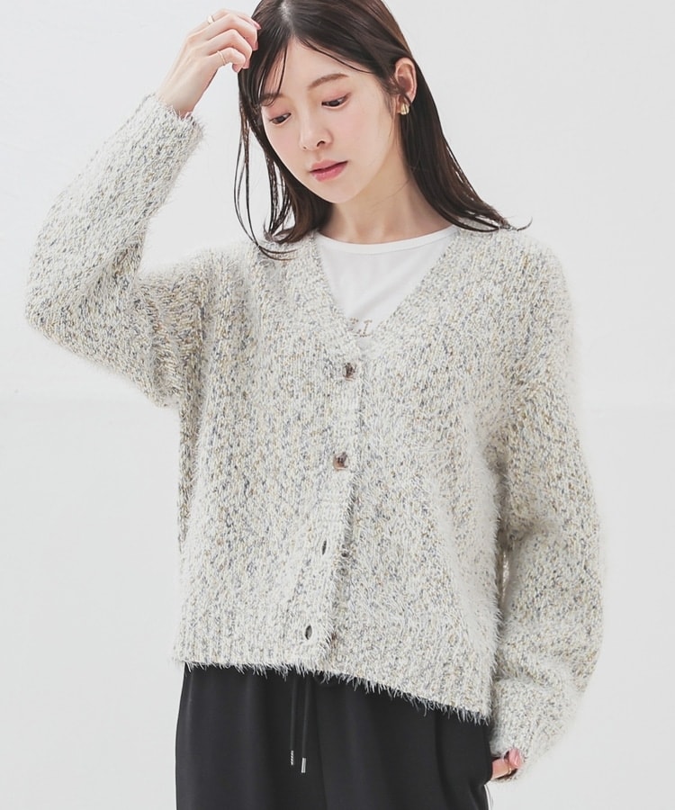 毛足が長めで柔らかくふわふわなフェザーヤーンと、ポコポコとした糸を使用したニット素材。