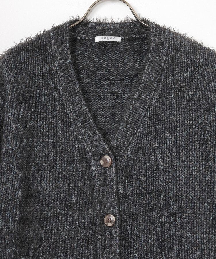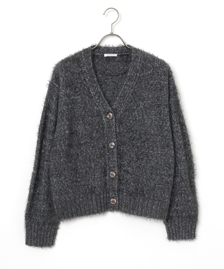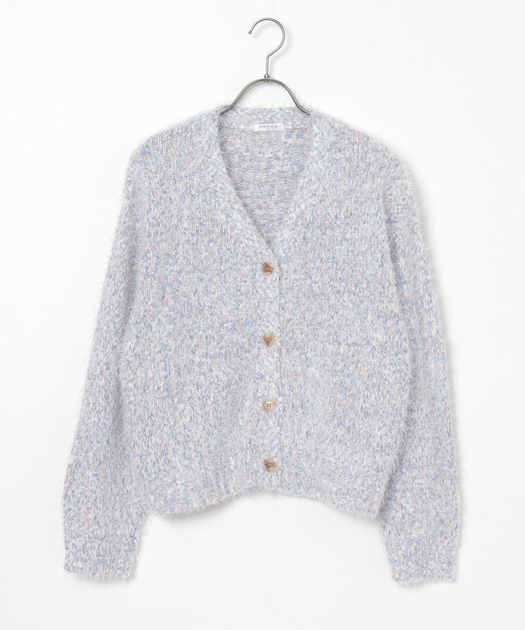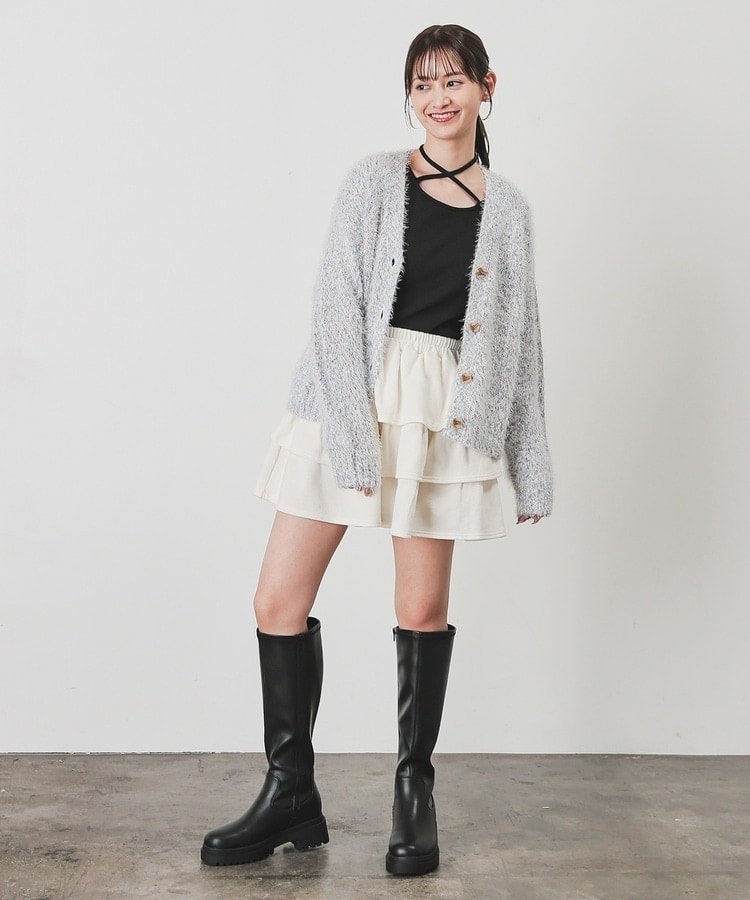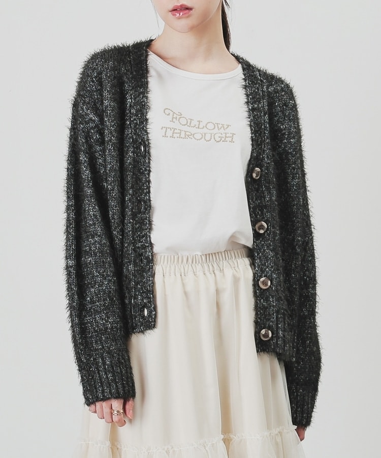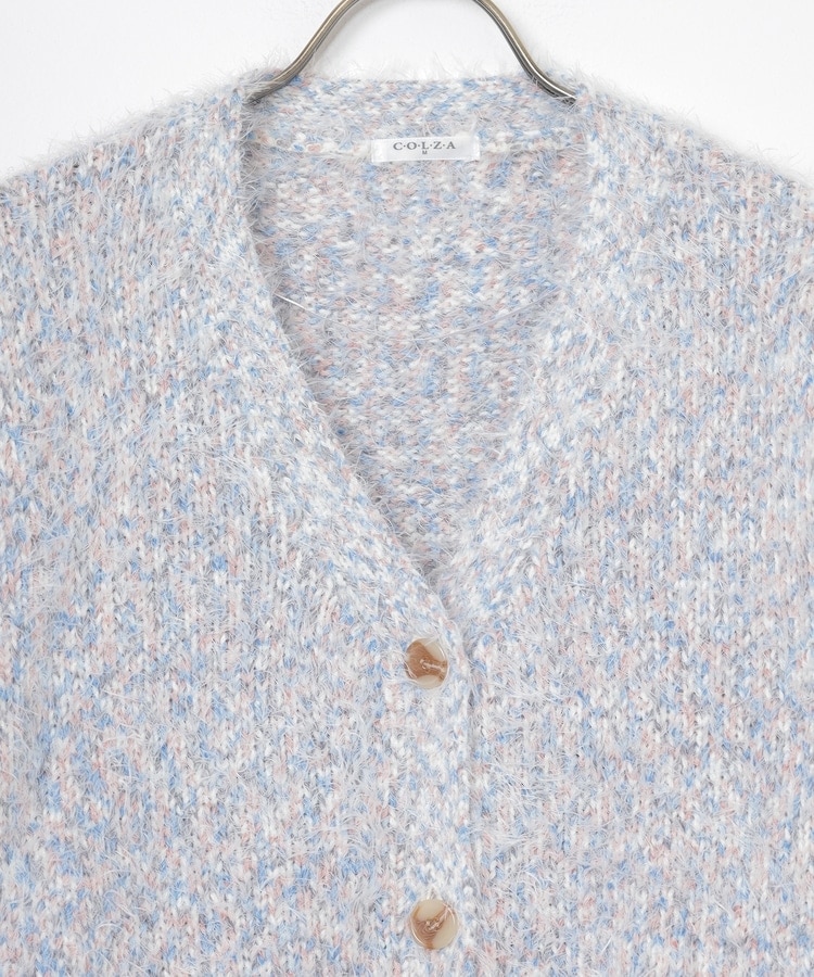 毛足が長めで柔らかくふわふわなフェザーヤーンと、ポコポコとした糸を使用したニット素材。