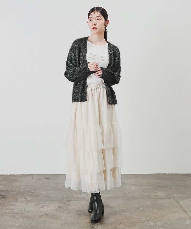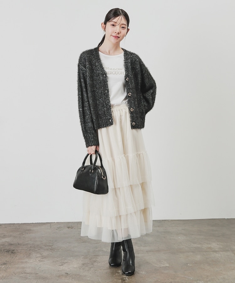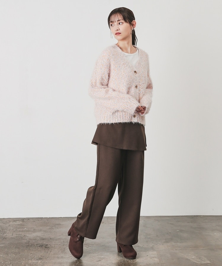 シンプルなボトムスと合わせてるだけで、重くなりがちな冬コーデも明るく軽やかな印象の華やかなスタイリングに。