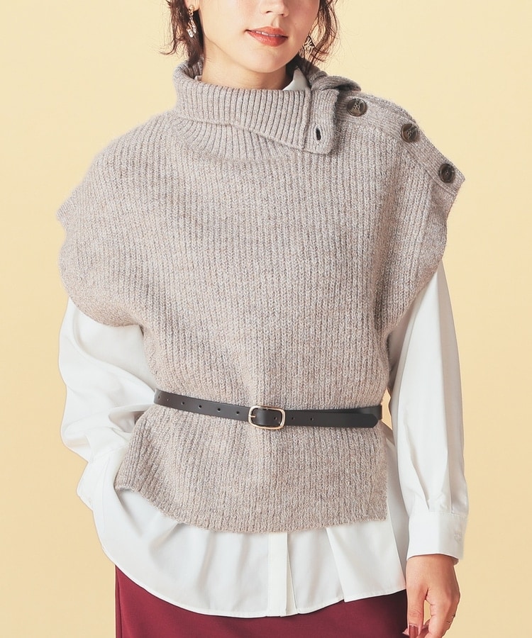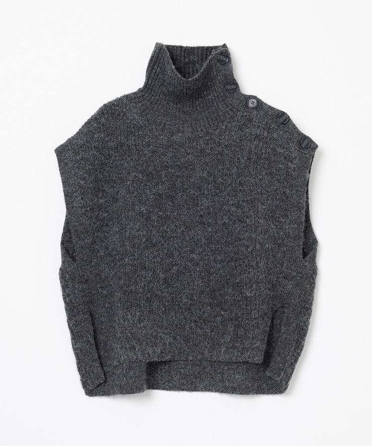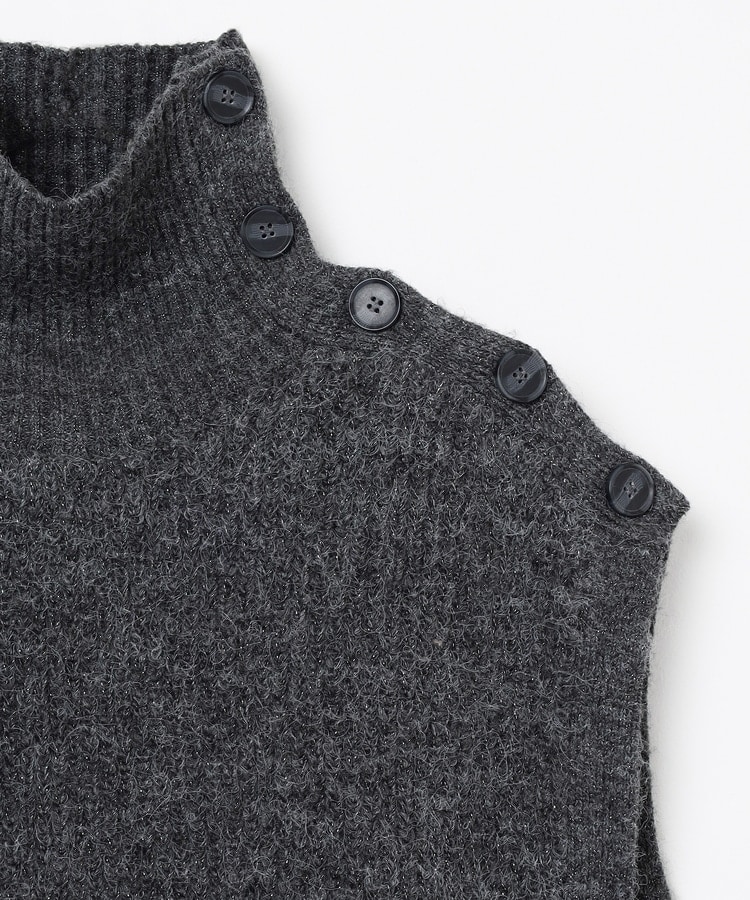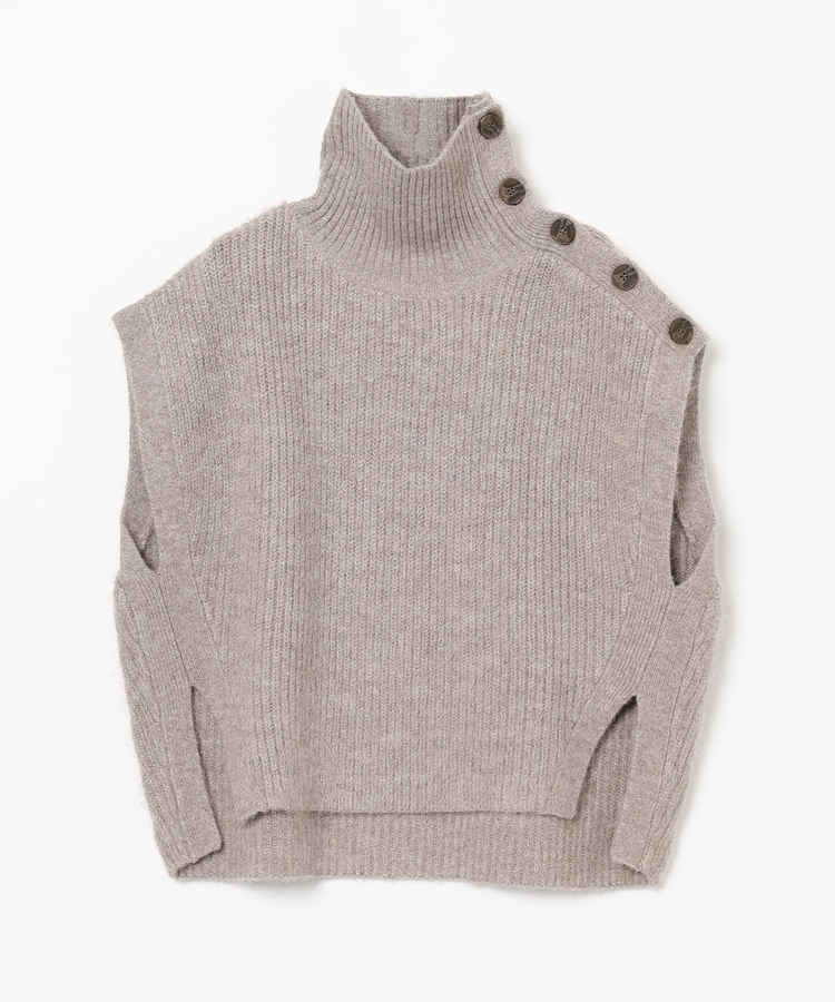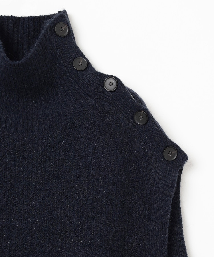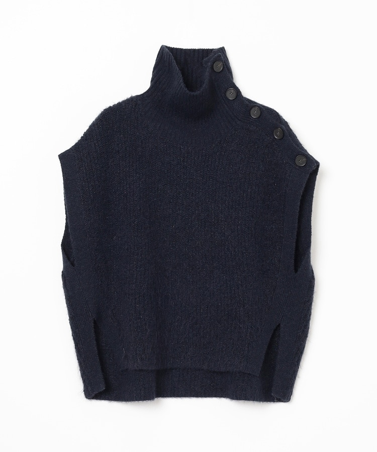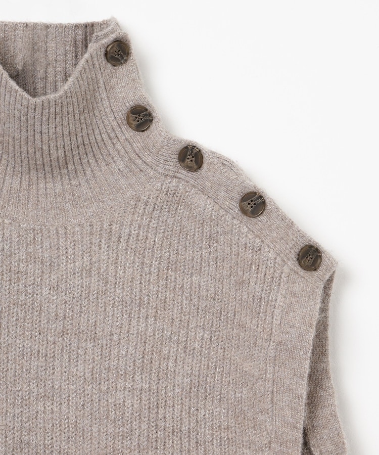 首元が暖かいハイネックに開け閉めできる肩ボタンをプラスした、着こなしのアレンジが楽しめるデザイン。