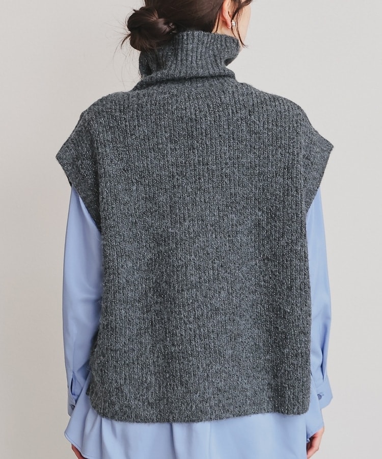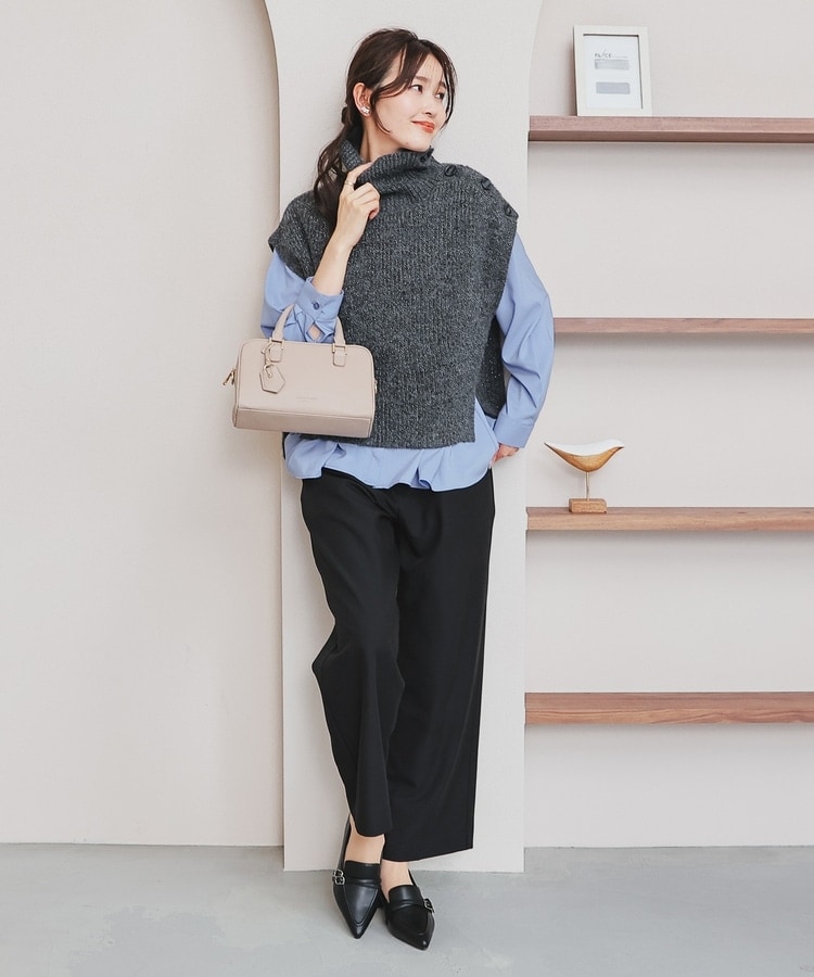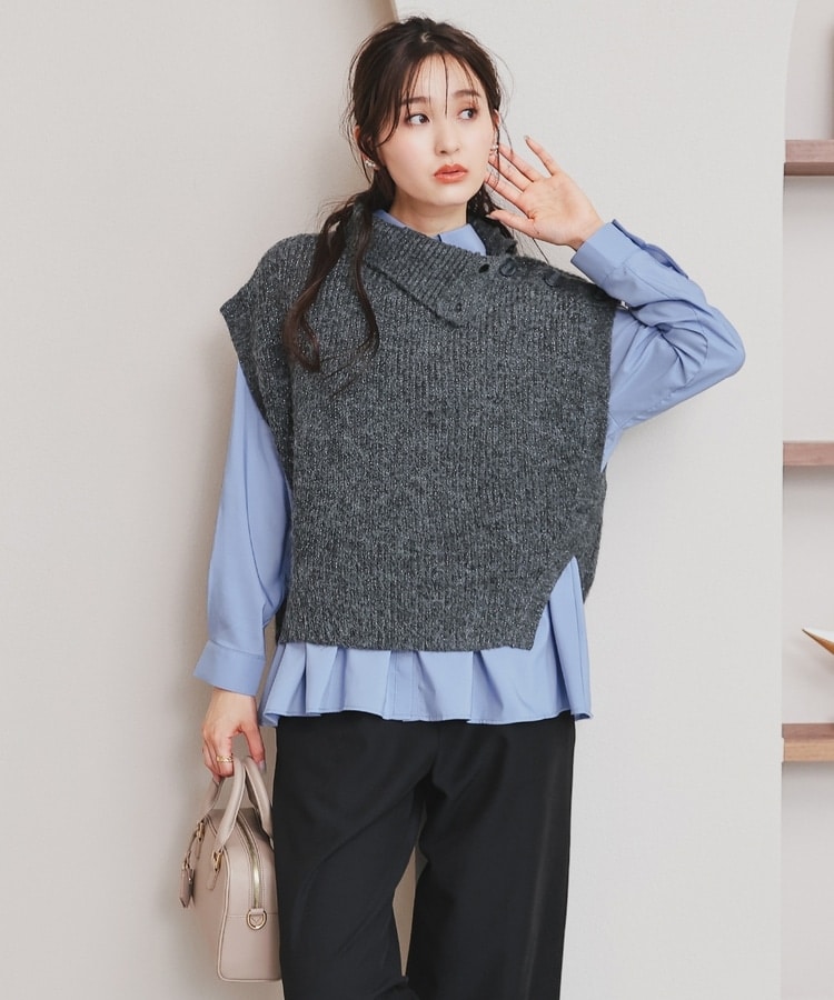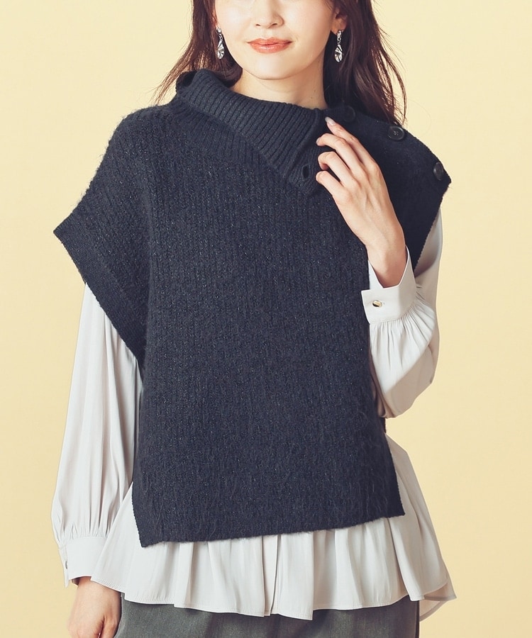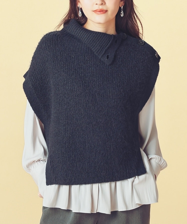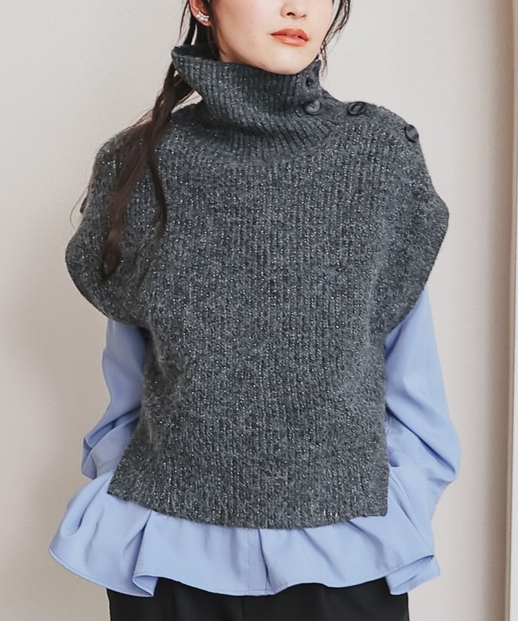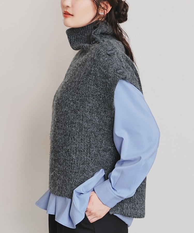 首元が暖かいハイネックに開け閉めできる肩ボタンをプラスした、着こなしのアレンジが楽しめるデザイン。