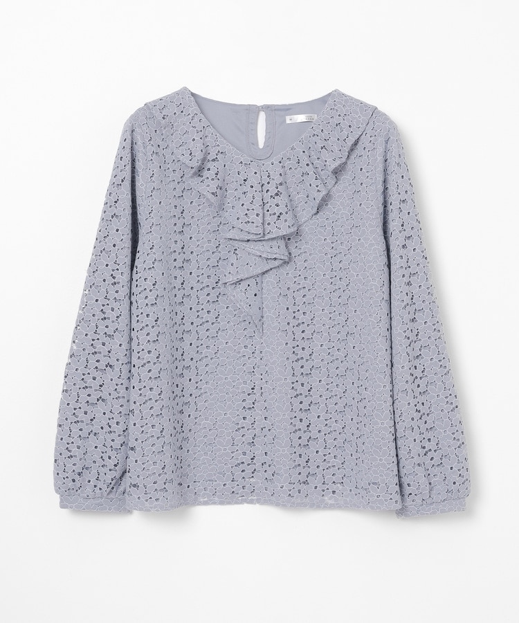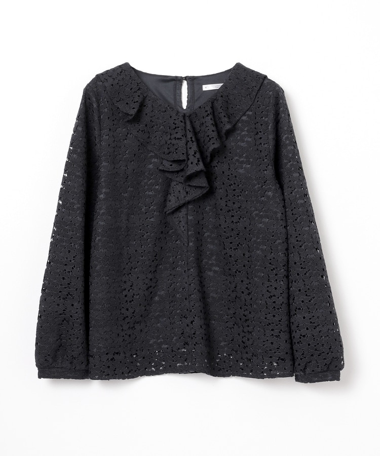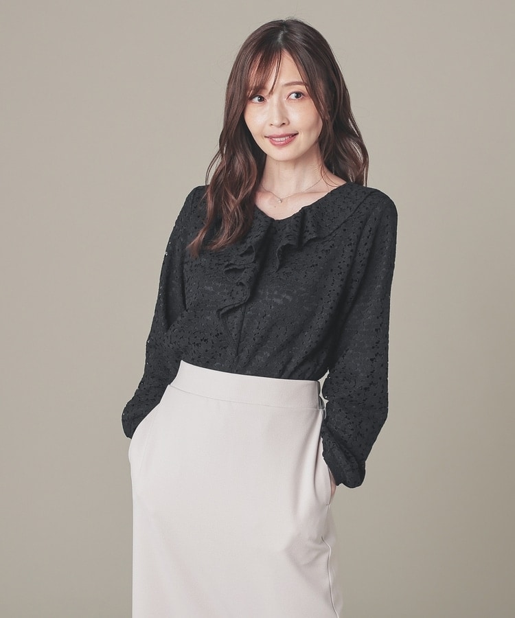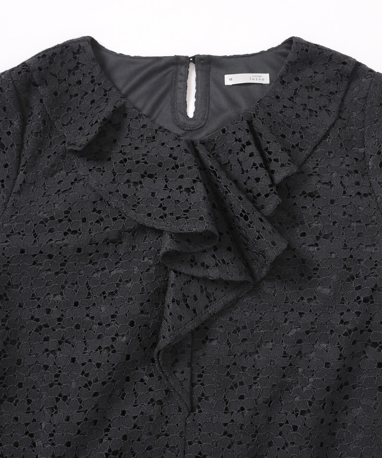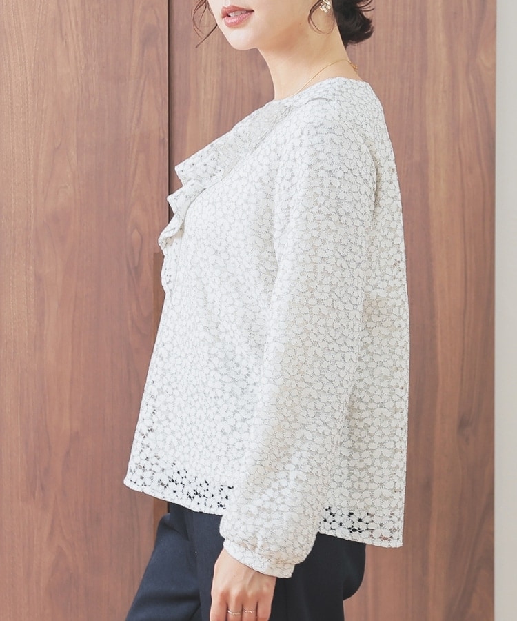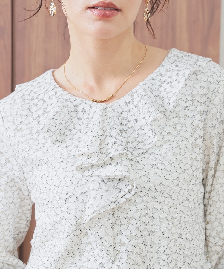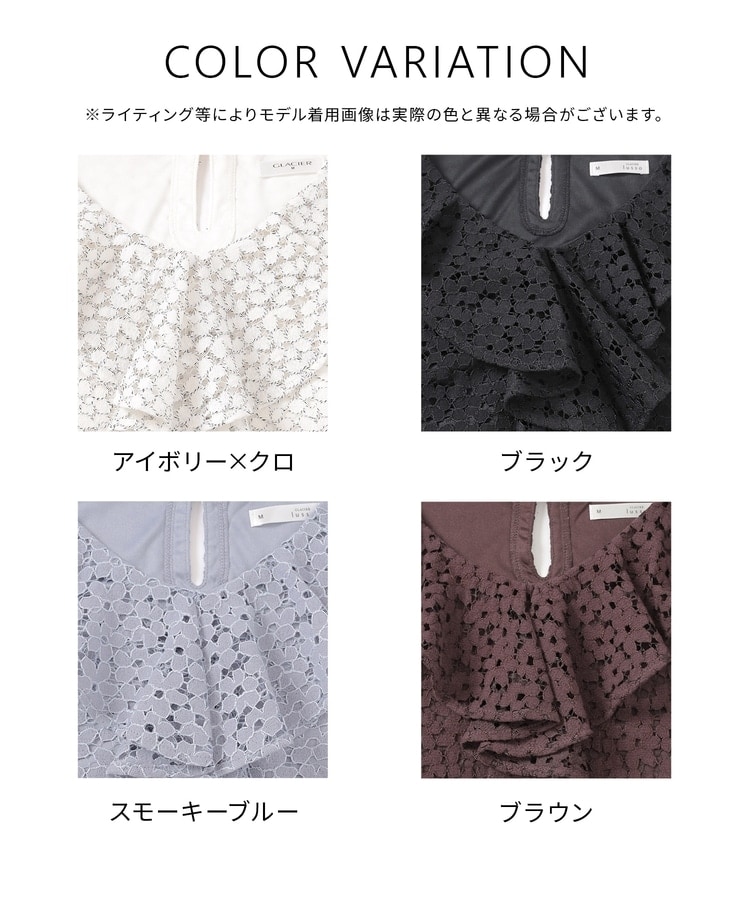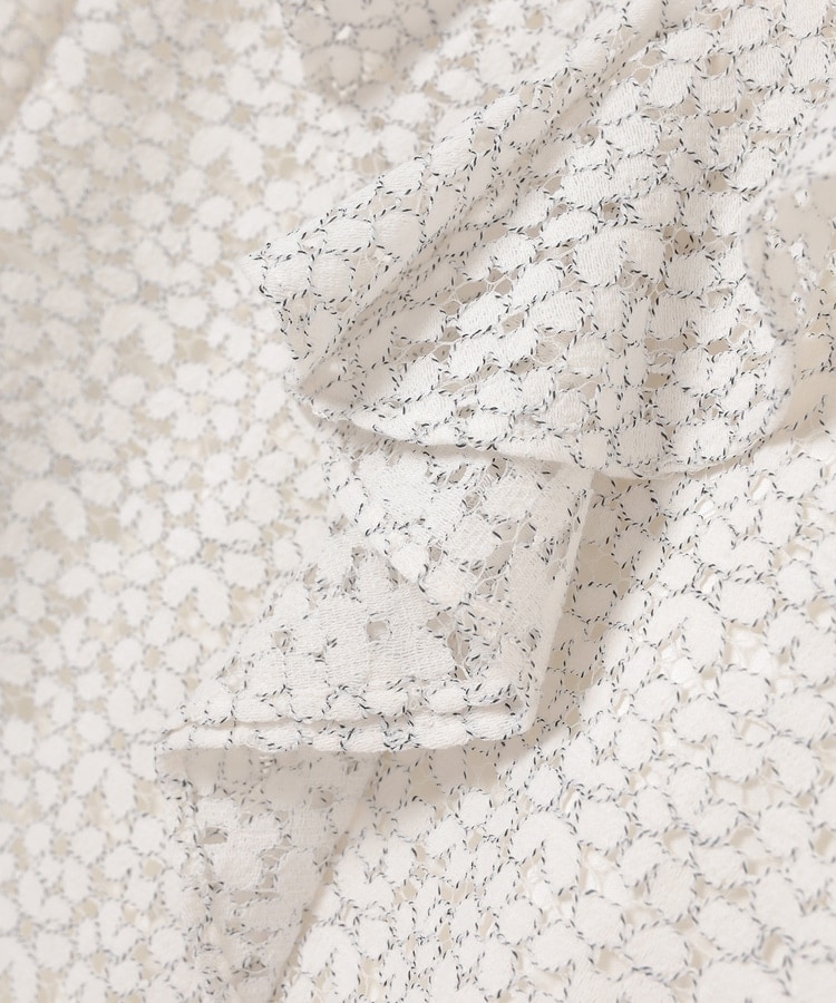1枚で華やかな印象になるラッフルとレース素材で、レディーな装いが叶うデザイン。