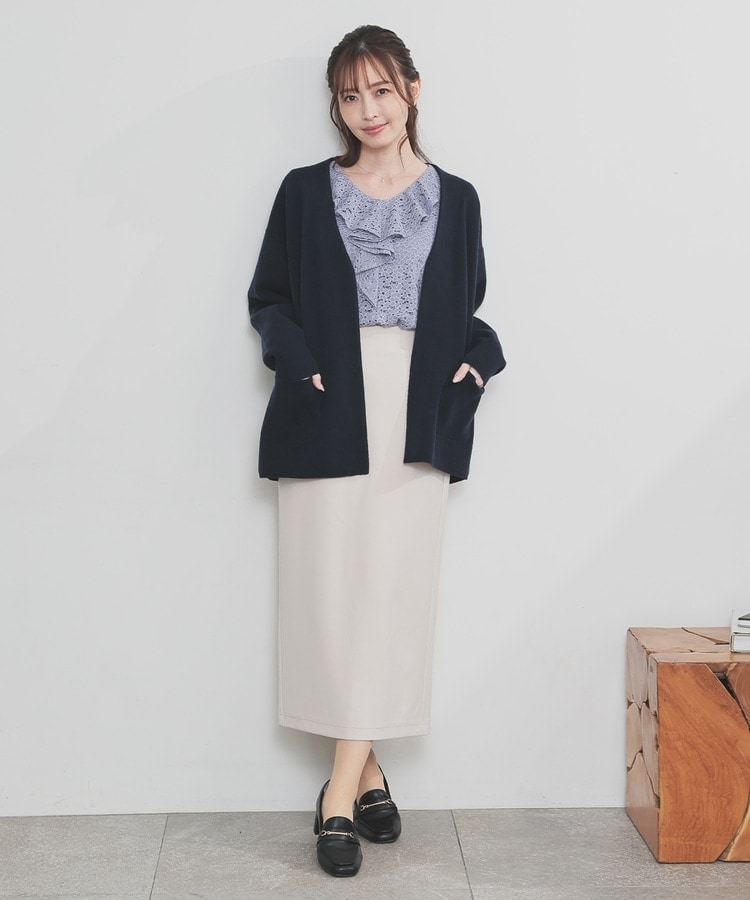 首元をすっきり見せるVネックが程よい抜け感を演出。