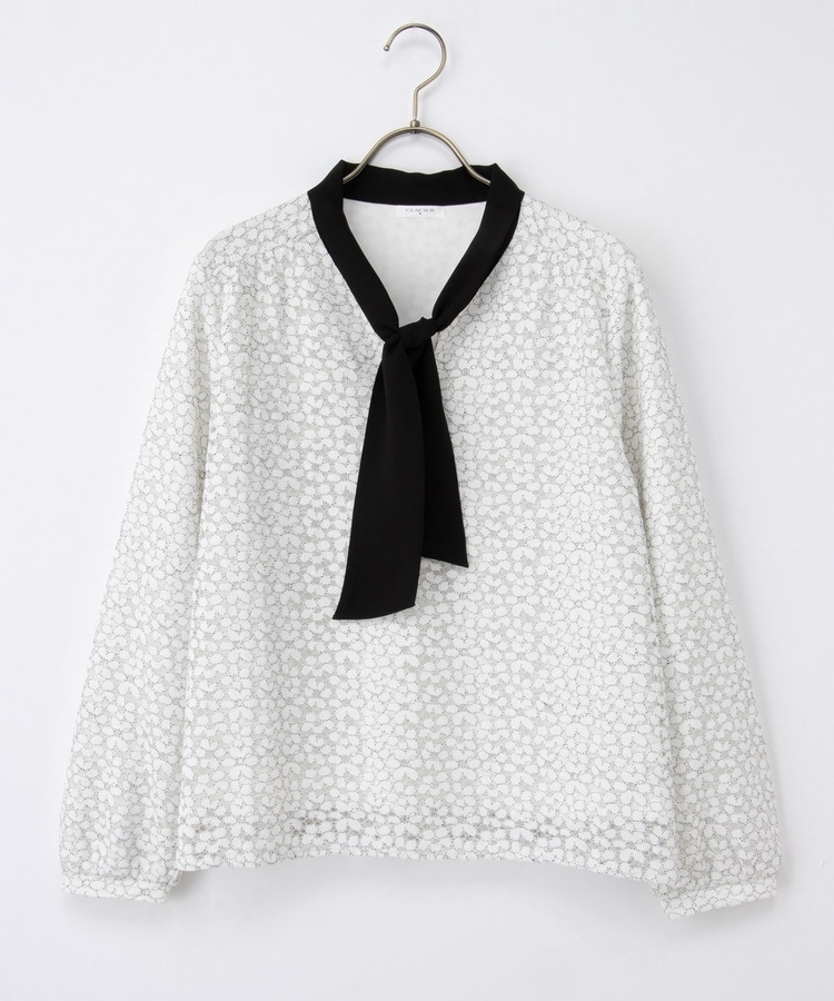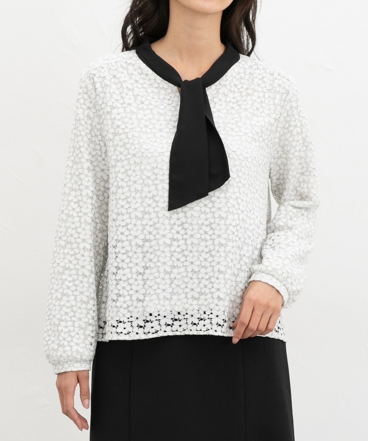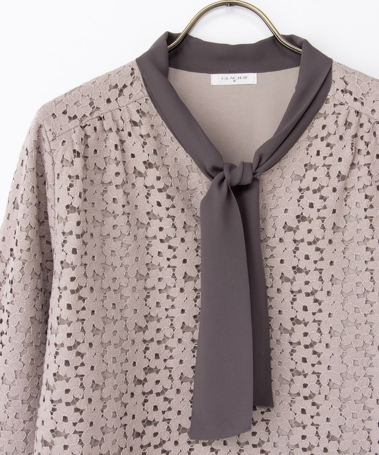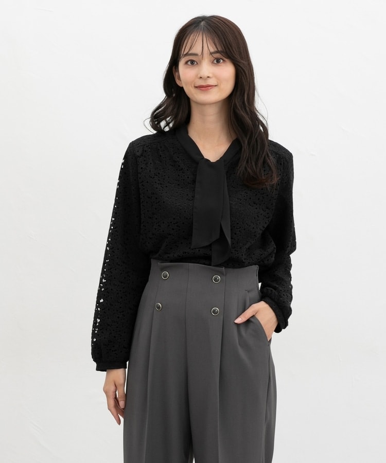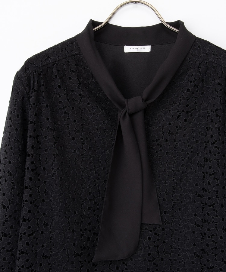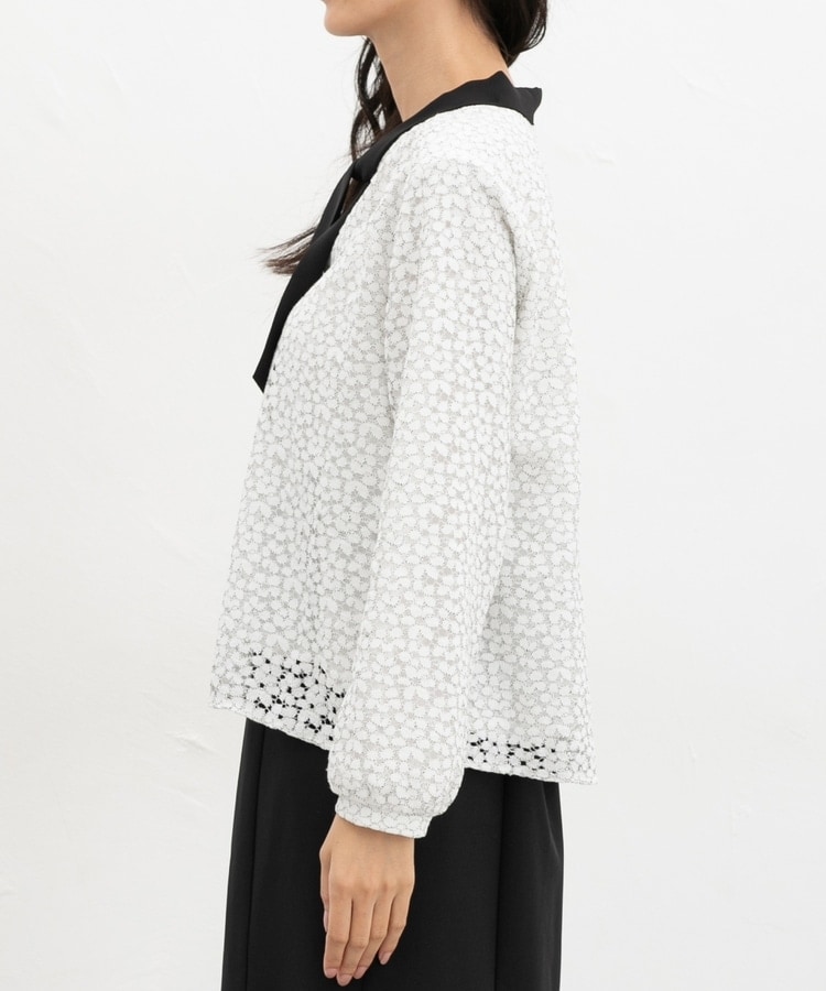 繊細な花柄レースとボウタイが華やかな、1枚で着映えするデザイン。