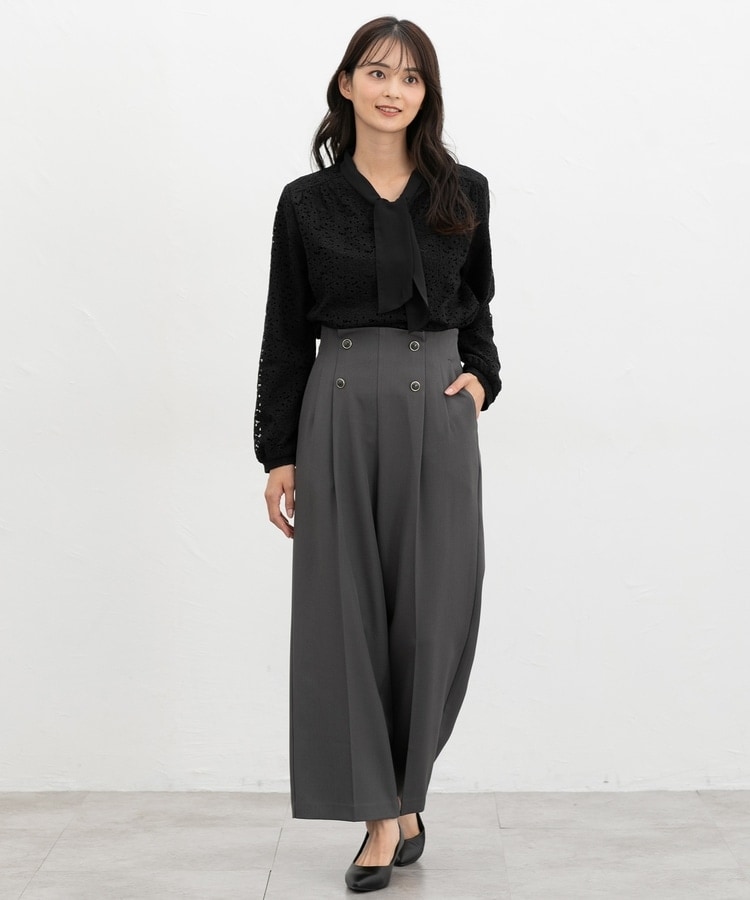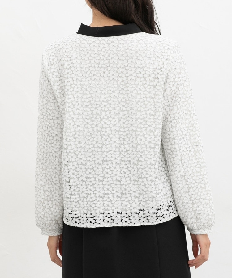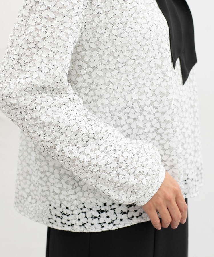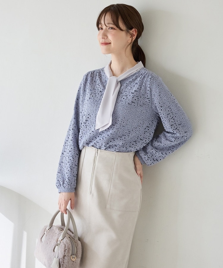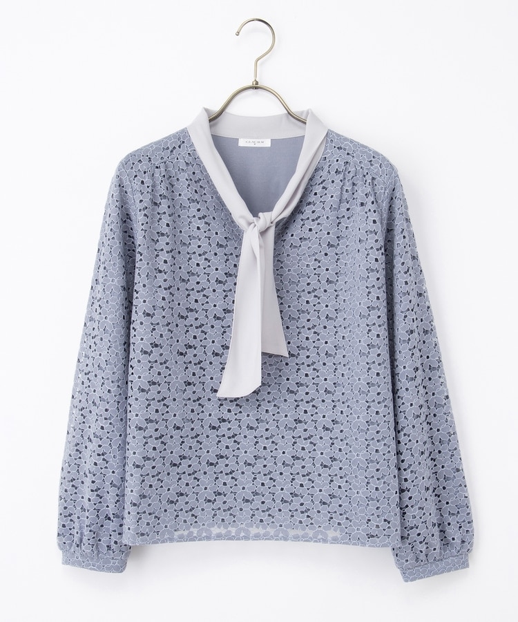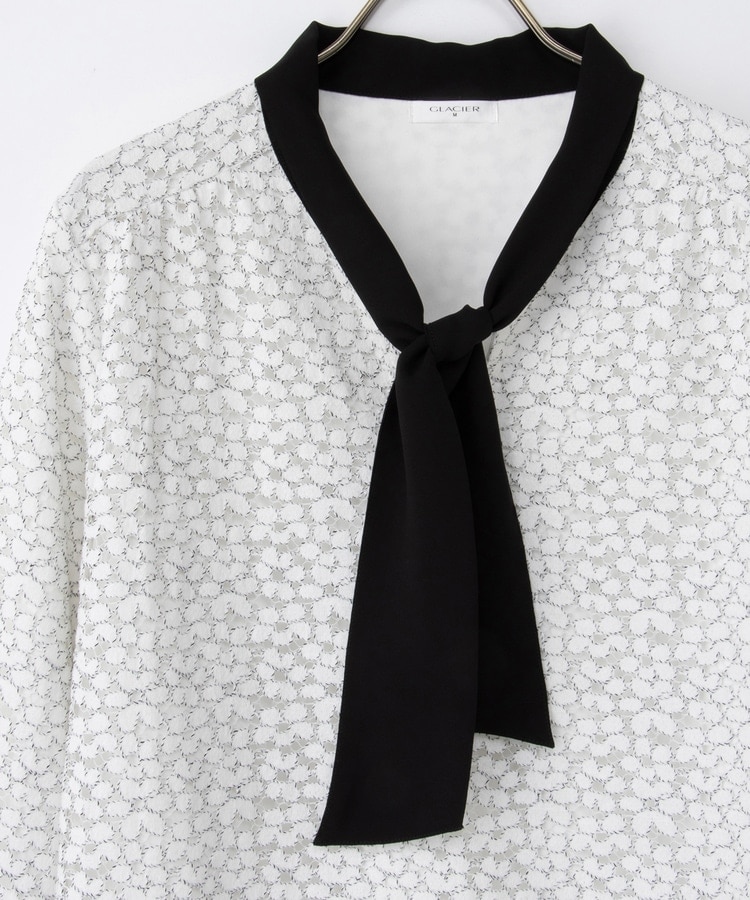 繊細な花柄レースとボウタイが華やかな、1枚で着映えするデザイン。