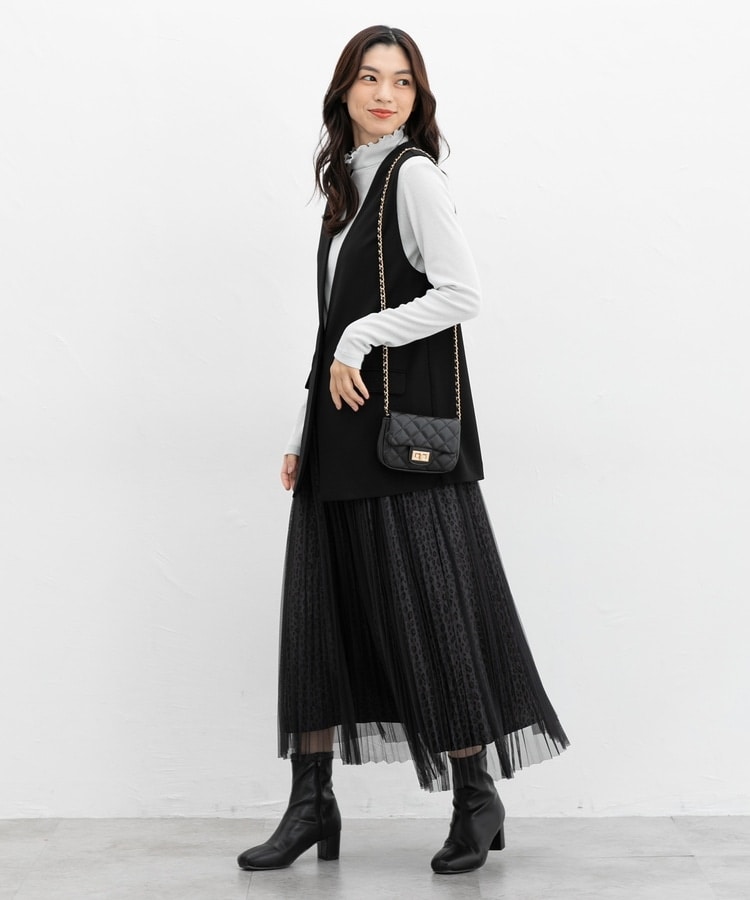 細かなプリーツの縦ラインと、長めの丈でスタイルアップ効果も◎