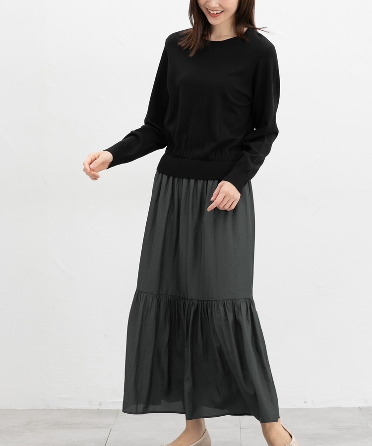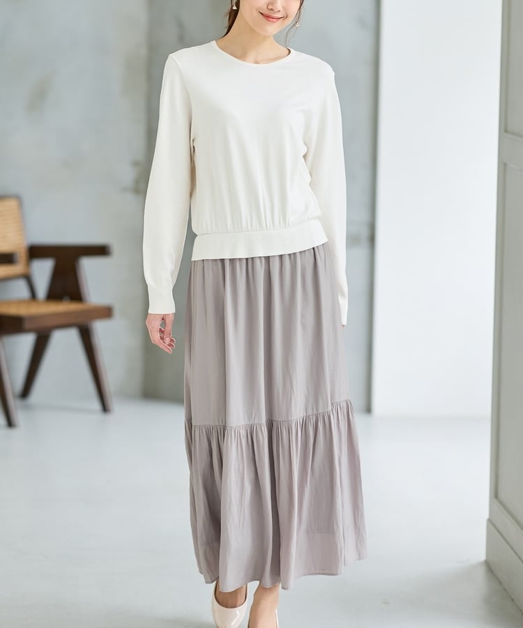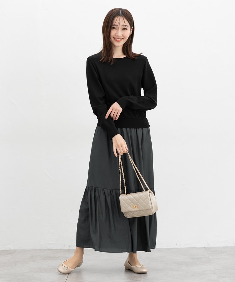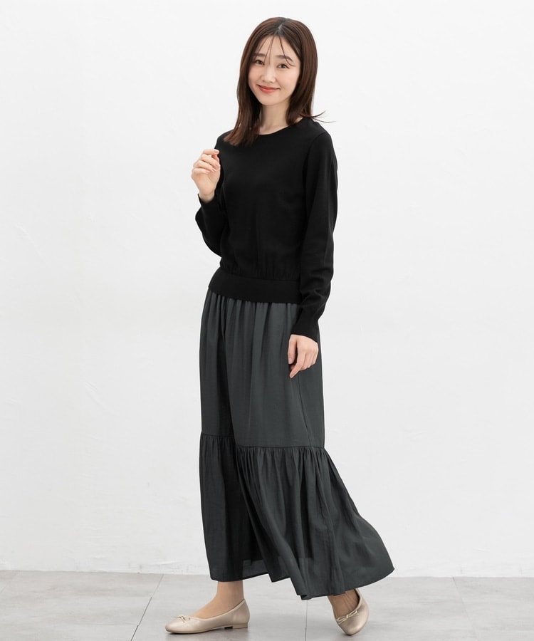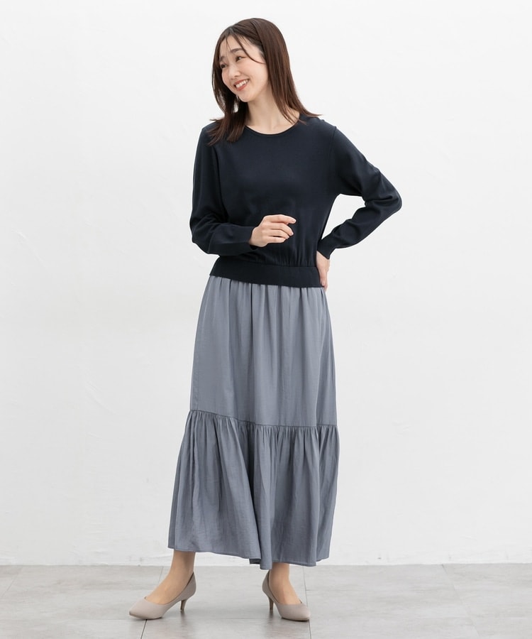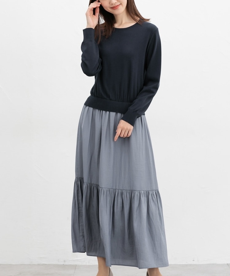 シンプルなニット×大人可愛いティアードスカートのドッキングデザイン。
