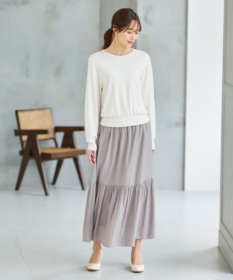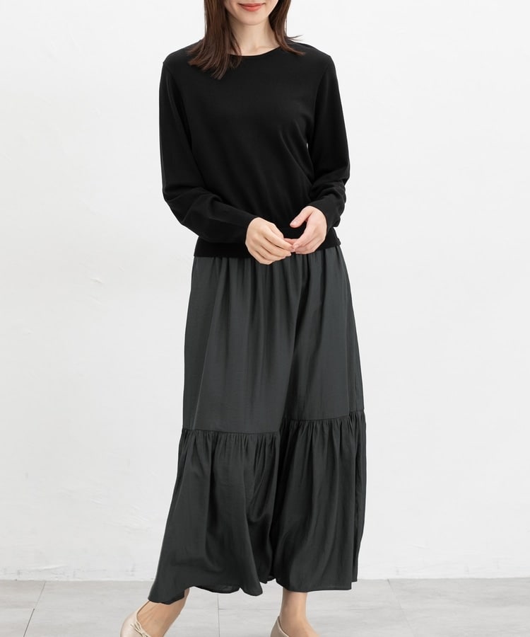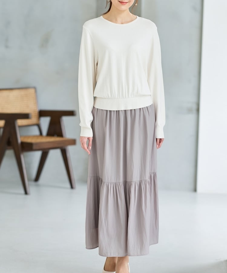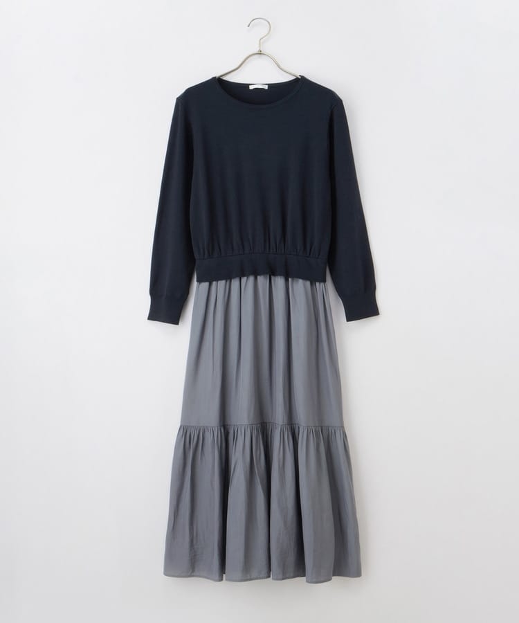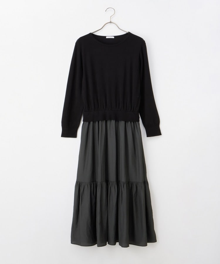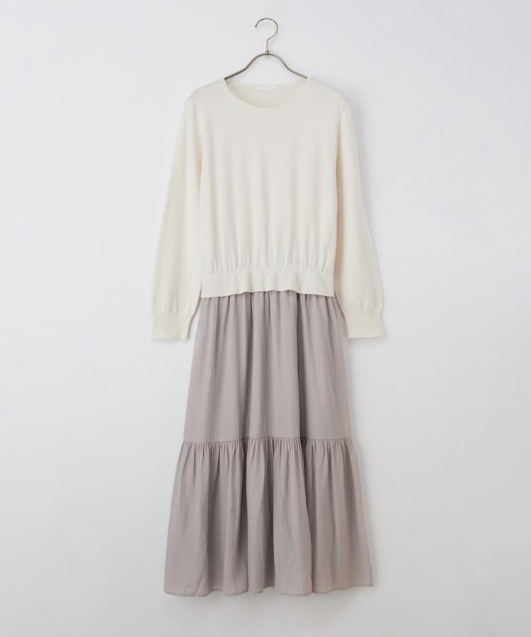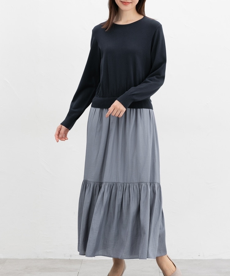 シンプルなニット×大人可愛いティアードスカートのドッキングデザイン。